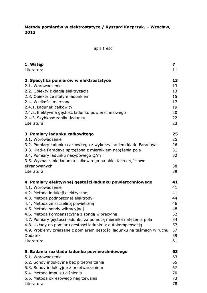 Metody pomiarów w elektrostatyce / Ryszard Kacprzyk. – Wrocław, 2013 Spis treści 1. Wstęp Literatura 7 11 2. Specyfika pomiarów w elektrostatyce 2.1. Wprowadzenie 2.2. Obiekty z ciągłą elektryzacją 2.3. Obiekty ze stałym ładunkiem 2.4. Wielkości mierzone 2.4.1. Ładunek całkowity 2.4.2. Efektywna gęstość ładunku powierzchniowego 2.4.3. Szybkość zaniku ładunku Literatura 13 13 13 15 17 19 20 22 23 3. Pomiary ładunku całkowitego 3.1. Wprowadzenie 3.2. Pomiary ładunku całkowitego z wykorzystaniem klatki Faradaya 3.3. Klatka Faradaya sprzęŜona z miernikiem natęŜenia pola 3.4. Pomiary ładunku nasypowego Q/m 3.5. Wyznaczanie ładunku całkowitego na obiektach częściowo ekranowanych Literatura 25 25 26 31 32 4. Pomiary efektywnej gęstości ładunku powierzchniowego 4.1. Wprowadzenie 4.2. Metoda indukcji elektrycznej 4.3. Metoda podnoszonej elektrody 4.4. Metoda ze szczeliną powietrzną 4.5. Metoda sondy wibracyjnej 4.6. Metoda kompensacyjna z sondą wibracyjną 4.7. Pomiary gęstości ładunku za pomocą miernika natęŜenia pola 4.8. Układy do pomiaru gęstości ładunku z autokompensacją 4.9. Problemy związane z pomiarem gęstości ładunku na taśmach w ruchu Dodatek Literatura 41 41 41 44 46 48 52 54 57 57 59 61 5. Badania rozkładu ładunku powierzchniowego 5.1. Wprowadzenie 5.2. Sondy indukcyjne bez przetwarzania 5.3. Sondy indukcyjne z przetwarzaniem 5.4. Metoda impulsu ciśnienia 5.5. Metoda okresowego nagrzewania Literatura 63 63 65 67 70 73 78 38 39 6. Pomiary potencjału oraz napięcia 6.1. Wprowadzenie 6.2. Kontaktowe metody pomiaru napięcia 6.2.1. Woltomierze elektrostatyczne 6.2.2. Woltomierze elektrometryczne (elektroniczne) 6.3. Bezkontaktowe metody pomiaru potencjału i napięcia obiektów przewodzących 6.3.1. Bezpośrednie pomiary potencjału i napięcia na obiektach przewodzących 6.3.2. Kompensacyjne pomiary potencjału i napięcia obiektów przewodzących 6.3.3. Woltomierze do pomiarów bezkontaktowych 6.4. Pomiary potencjału obiektów nieprzewodzących 6.4.1. Potencjał i napięcie na obiekcie z jednorodnym rozkładem ładunku 6.4.2. Pomiar potencjału i jego rozkładu metodą bezpośrednią 6.4.3. Pomiar potencjału i jego rozkładu metodą kompensacyjną 6.5. Uwagi końcowe Literatura 81 81 82 84 87 91 93 96 97 98 101 103 104 7. Pomiary natęŜenia pola elektrycznego 7.1. Wprowadzenie 7.2. Pole elektryczne w otoczeniu powierzchni przewodzącej 7.3. Indukcyjne mierniki natęŜenia pola elektrycznego bez przetwarzania 7.3.1. Zasada działania indukcyjnego miernika natęŜenia pola 7.3.2. Dryft wskazań 7.3.3. Dryft zera spowodowany skończoną wartością prądu wejściowego 7.3.4. Kompensacja prądu wejściowego wzmacniacza 7.3.5. Wpływ prądów jonowych atmosfery 7.3.6. Mierniki pól z układami próbkującymi 7.4. Metody indukcyjne z przetwarzaniem 7.4.1. Młynek polowy 7.4.2. Młynek polowy z detekcją fazową 7.4.3. Młynek polowy z pływającą przesłoną 7.4.4. Młynek polowy ze stałą pojemnością przetwornika 7.4.5. Cylindryczne młynki polowe 7.4.6. Wibracyjne przetworniki natęŜenia pola 7.4.7. Przykłady konstrukcji przetworników wibracyjnych 7.4.8. Przetworniki wibracyjne MEMS 7.4.9. Torsyjny miernik natęŜenia pola elektrycznego 7.5. Inne metody pomiaru natęŜenia pola elektrycznego 7.5.1. Radioizotopowe mierniki pola 7.5.2. Specjalne metody pomiaru natęŜenia pola 7.6. Czynniki wpływające na wartość mierzonego pola 7.6.1. Efekt skupiania linii sił 7.6.2. Uśrednianie rozkładów powierzchniowych 7.6.3. Uśrednianie rozkładów objętościowych 7.6.4. Wpływ przewodzącego i uziemionego otoczenia 7.6.5. Wpływ pól od innych źródeł 7.6.6. Pomiary natęŜenia pola w otoczeniu obiektów ruchomych 107 107 108 109 109 113 114 115 118 119 122 122 125 129 131 132 133 138 142 146 148 148 151 152 152 153 154 156 158 159 89 89 7.7. Uwagi ogólne dotyczące pomiaru natęŜenia pola Literatura 159 160 8. Pomiary szybkości zaniku ładunku 8.1. Wprowadzenie 8.2. Badania szybkości zaniku ładunku materiałów z długimi czasami relaksacji 8.2.1. Wyznaczanie czasu zaniku ładunku w warunkach izotermicznych 8.2.2. Wyznaczanie czasu zaniku ładunku metodą prądów termostymulowanych 8.2.3. Układ pomiarowy do badań prądów termostymulowanych (TSDC) 8.2.4. Wyznaczanie czasu zaniku ładunku metodą termostymulowanego ładunku (TSQ) (termostymulowanego napięcia) 8.2.5. Układ pomiarowy do badania termostymulowanego ładunku (TSQ) 8.2.6. Uwagi do badań procesów zaniku ładunku z długimi czasami relaksacji 8.3. Badanie charakterystyk zaniku ładunku dla materiałów o średnim czasie relaksacji 8.3.1. Metoda wirującej próbki 8.3.2. Metoda wirującej elektrody pomiarowej 8.3.3. Metody z zastosowaniem mierników natęŜenia pola 8.4. Badania na materiałach o krótkim czasie relaksacji 8.4.1. Metoda okresowego próbkowania 8.4.2. Metoda pomiaru napięcia dla róŜnych czasów opóźnienia 8.4.3. Metoda okna polowego 8.5. Wpływ warunków elektryzacji oraz pomiaru na charakterystyki zaniku ładunku Literatura 163 163 9. Niepewność pomiarów wielkości elektrostatycznych 9.1. Wprowadzenie 9.2. Niepewność pomiaru ładunku nasypowego 9.3. Niepewność pomiaru czasu zaniku ładunku 9.4. Niepewność pomiaru napięcia obiektów ze stałym ładunkiem 9.5. Niepewność pomiaru natęŜenia pola elektrycznego 9.6. Uwagi końcowe Literatura 165 166 167 171 173 177 179 179 179 185 188 191 191 193 195 197 204 207 207 208 209 212 218 221 222 oprac. BPK