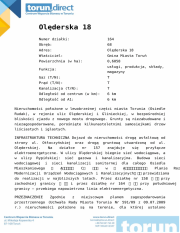 Olęderska 18 Numer działki: 164 Obręb: 68 Adres: Olęderska 18 Właściciel: Gmina Miasta Toruń Powierzchnia (w ha): 0,6058 usługi, produkcja, składy, Funkcja: magazyny Gaz (T/N): T Prąd (T/N): T Kanalizacja (T/N): T Odległość od centrum (w km): 6 km Odległość od A1: 6 km Nieruchomości położone w lewobrzeżnej części miasta Torunia (Osiedle Rudak), w rejonie ulic Olęderskiej i Glinieckiej, w bezpośredniej bliskości zjazdu z nowego mostu drogowego. Grunty są niezabudowane i niezagospodarowane, porośnięte kilkunastoletnimi samosiejkami drzew liściastych i iglastych. INFRASTRUKTURA TECHNICZNA Dojazd do nieruchomości drogą asfaltową od strony ul. Otłoczyńskiej Olęderskiej. Na oraz działce drogą nr gruntową 157 utwardzoną znajduje się od ul. przyłącze elektroenergetyczne. W ulicy Olęderskiej biegnie sieć wodociągowa, a w ulicy Rypińskiej: wodociągowej i sieć sieci Mieszkaniowego gazowa i kanalizacji Ḁ刀甀搀愀欀 C kanalizacyjna. sanitarnej ᴀⰀ w dla Budowa całego Osiedla Ḁ圀椀攀氀漀氀攀琀渀椀洀 Modernizacji Urządzeń Wodociągowych i Kanalizacyjnych ᴀ Planie granicy ጀ i przez działkę nr 164 ጀ ጀ przy przy południowej granicy – przebiega napowietrzna linia elektroenergetyczna. PRZEZNACZENIE Zgodnie z miejscowym planem zagospodarowania przestrzennego (Uchwała Rady Miasta Torunia Nr 591/09 z 09.07.2009 r.) nieruchomości położone są na terenie, dla Roz przewidziana do realizacji w najbliższych latach. Przez działkę nr 158 zachodniej sieci której ustalono przeznaczenie podstawowe: usługi komercyjne oraz dopuszczalne: składy i magazyny, działalność rolnicza – ogrodnictwo i sadownictwo.