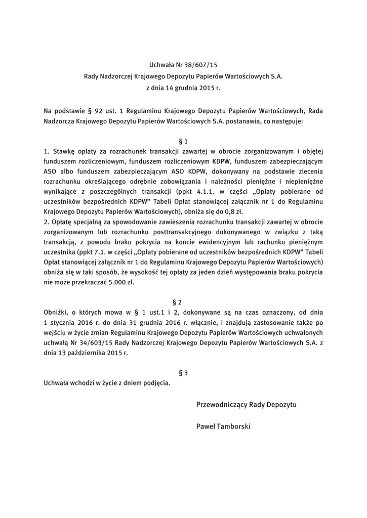Uchwała Nr 38/607/15 Rady Nadzorczej Krajowego Depozytu Papierów Wartościowych S.A. z dnia 14 grudnia 2015 r. Na podstawie § 92 ust. 1 Regulaminu Krajowego Depozytu Papierów Wartościowych, Rada Nadzorcza Krajowego Depozytu Papierów Wartościowych S.A. postanawia, co następuje: §1 1. Stawkę opłaty za rozrachunek transakcji zawartej w obrocie zorganizowanym i objętej funduszem rozliczeniowym, funduszem rozliczeniowym KDPW, funduszem zabezpieczającym ASO albo funduszem zabezpieczającym ASO KDPW, dokonywany na podstawie zlecenia rozrachunku określającego odrębnie zobowiązania i należności pieniężne i niepieniężne wynikające z poszczególnych transakcji (ppkt 4.1.1. w części „Opłaty pobierane od uczestników bezpośrednich KDPW” Tabeli Opłat stanowiącej załącznik nr 1 do Regulaminu Krajowego Depozytu Papierów Wartościowych), obniża się do 0,8 zł. 2. Opłatę specjalną za spowodowanie zawieszenia rozrachunku transakcji zawartej w obrocie zorganizowanym lub rozrachunku posttransakcyjnego dokonywanego w związku z taką transakcją, z powodu braku pokrycia na koncie ewidencyjnym lub rachunku pieniężnym uczestnika (ppkt 7.1. w części „Opłaty pobierane od uczestników bezpośrednich KDPW” Tabeli Opłat stanowiącej załącznik nr 1 do Regulaminu Krajowego Depozytu Papierów Wartościowych) obniża się w taki sposób, że wysokość tej opłaty za jeden dzień występowania braku pokrycia nie może przekraczać 5.000 zł. §2 Obniżki, o których mowa w § 1 ust.1 i 2, dokonywane są na czas oznaczony, od dnia 1 stycznia 2016 r. do dnia 31 grudnia 2016 r. włącznie, i znajdują zastosowanie także po wejściu w życie zmian Regulaminu Krajowego Depozytu Papierów Wartościowych uchwalonych uchwałą Nr 34/603/15 Rady Nadzorczej Krajowego Depozytu Papierów Wartościowych S.A. z dnia 13 października 2015 r. §3 Uchwała wchodzi w życie z dniem podjęcia. Przewodniczący Rady Depozytu Paweł Tamborski