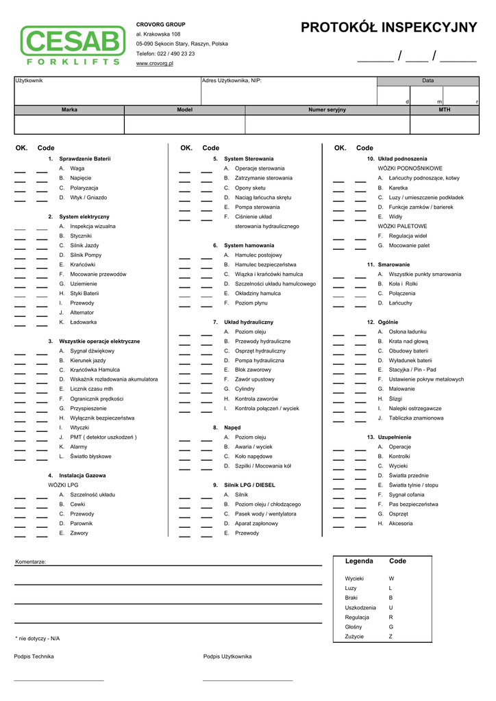 PROTOKÓŁ INSPEKCYJNY CROVORG GROUP al. Krakowska 108 05-090 Sękocin Stary, Raszyn, Polska Telefon: 022 / 490 23 23 ________ www.crovorg.pl Użytkownik / _____ / ________ Adres Użytkownika, NIP: Data d Marka OK. Code 1. 2. OK. Sprawdzenie Baterii Code 5. OK. MTH Code System Sterowania 10. Układ podnoszenia Waga A. Operacje sterowania WÓZKI PODNOŚNIKOWE B. Napięcie B. Zatrzymanie sterowania A. Łańcuchy podnoszące, kotwy C. Polaryzacja C. Opony sketu B. Karetka D. Wtyk / Gniazdo D. Naciąg łańcucha skrętu C. Luzy / umieszczenie podkładek E. Pompa sterowania D. Funkcje zamków / barierek Ciśnienie układ E. Widły sterowania hydraulicznego WÓZKI PALETOWE System elektryczny F. Inspekcja wizualna B. Styczniki C. Silnik Jazdy F. D. Silnik Pompy A. E. Krańcówki B. Hamulec bezpieczeństwa F. Mocowanie przewodów C. Wiązka i krańcówki hamulca A. Wszystkie punkty smarowania G. Uziemienie D. Szczelności układu hamulcowego B. Koła i Rolki H. Styki Baterii E. Okładziny hamulca C. Połączenia I. Przewody F. Poziom płynu D. Łańcuchy J. Alternator K. Ładowarka 6. 7. Wszystkie operacje elektryczne System hamowania Regulacja wideł G. Mocowanie palet Hamulec postojowy 11. Smarowanie Układ hydrauliczny 12. Ogólnie A. Poziom oleju A. Osłona ładunku B. Przewody hydrauliczne B. Krata nad głową A. Sygnał dźwiękowy C. Osprzęt hydrauliczny C. Obudowy baterii B. Kierunek jazdy D. Pompa hydrauliczna D. Wyładunek baterii C. Krańcówka Hamulca E. Blok zaworowy E. Stacyjka / Pin - Pad D. Wskaźnik rozładowania akumulatora F. Zawór upustowy F. Ustawienie pokryw metalowych E. Licznik czasu mth G. Cylindry G. Malowanie F. Ogranicznik prędkości H. Kontrola zaworów H. I. Kontrola połączeń / wyciek I. Nalepki ostrzegawcze J. Tabliczka znamionowa G. Przyspieszenie H. 4. m Numer seryjny A. A. 3. Model Wyłącznik bezpieczeństwa 8. Ślizgi I. Wtyczki J. PMT ( detektor uszkodzeń ) Napęd A. Poziom oleju K. Alarmy B. Awaria / wyciek A. Operacje L. Światło błyskowe C. Koło napędowe B. Kontrolki D. Szpilki / Mocowania kół C. Wycieki D. Światła przednie 13. Uzupełnienie Instalacja Gazowa WÓZKI LPG A. Szczelność układu 9. Silnik LPG / DIESEL E. Światła tylnie / stopu A. F. Sygnał cofania Pas bezpieczeństwa Silnik B. Cewki B. Poziom oleju / chłodzącego F. C. Przewody C. Pasek wody / wentylatora G. Osprzęt D. Parownik D. Aparat zapłonowy H. E. Zawory E. Przewody Komentarze: * nie dotyczy - N/A Podpis Technika Podpis Użytkownika _____________ ______________________________ ______________________________ Akcesoria Legenda Code Wycieki W Luzy L Braki B Uszkodzenia U Regulacja R Głośny G Zużycie Z r