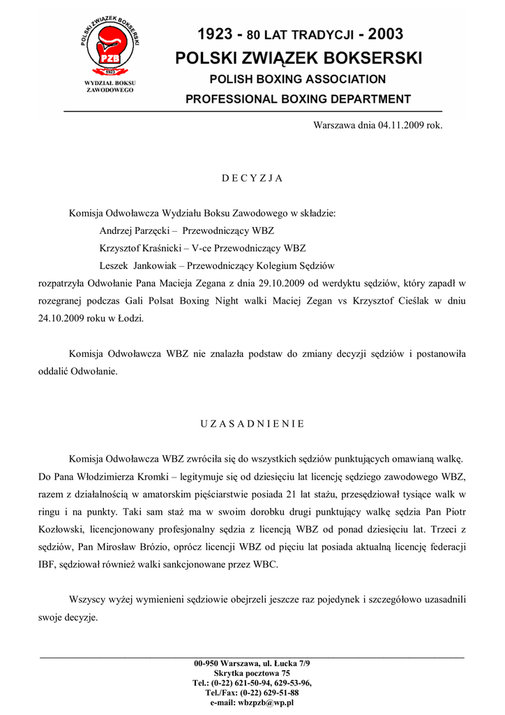 Warszawa dnia 04.11.2009 rok. DECYZJA Komisja Odwoławcza Wydziału Boksu Zawodowego w składzie: Andrzej Parzęcki – Przewodniczący WBZ Krzysztof Kraśnicki – V-ce Przewodniczący WBZ Leszek Jankowiak – Przewodniczący Kolegium Sędziów rozpatrzyła Odwołanie Pana Macieja Zegana z dnia 29.10.2009 od werdyktu sędziów, który zapadł w rozegranej podczas Gali Polsat Boxing Night walki Maciej Zegan vs Krzysztof Cieślak w dniu 24.10.2009 roku w Łodzi. Komisja Odwoławcza WBZ nie znalazła podstaw do zmiany decyzji sędziów i postanowiła oddalić Odwołanie. UZASADNIENIE Komisja Odwoławcza WBZ zwróciła się do wszystkich sędziów punktujących omawianą walkę. Do Pana Włodzimierza Kromki – legitymuje się od dziesięciu lat licencję sędziego zawodowego WBZ, razem z działalnością w amatorskim pięściarstwie posiada 21 lat stażu, przesędziował tysiące walk w ringu i na punkty. Taki sam staż ma w swoim dorobku drugi punktujący walkę sędzia Pan Piotr Kozłowski, licencjonowany profesjonalny sędzia z licencją WBZ od ponad dziesięciu lat. Trzeci z sędziów, Pan Mirosław Brózio, oprócz licencji WBZ od pięciu lat posiada aktualną licencję federacji IBF, sędziował również walki sankcjonowane przez WBC. Wszyscy wyżej wymienieni sędziowie obejrzeli jeszcze raz pojedynek i szczegółowo uzasadnili swoje decyzje. ____________________________________________________________________________________________________ 00-950 Warszawa, ul. Łucka 7/9 Skrytka pocztowa 75 Tel.: (0-22) 621-50-94, 629-53-96, Tel./Fax: (0-22) 629-51-88 e-mail: [email protected] Komisja Odwoławcza WBZ stwierdziła, że w czasie trwania walki nie został popełniony żaden błąd formalny, nie było sytuacji dyskusyjnych, liczeń ani odjętych punktów za przewinienia zawodników. Obaj pięściarze Maciej Zegan i Krzysztof Cieślak poddani zostali ocenie trzech sędziów punktowych i na podstawie ich punktacji ogłoszono zwycięzcę. Zaznaczyć należy, że we wszystkich walkach boksu zawodowego, taka ocena jest zawsze oceną subiektywną. Jak wyżej wskazano, sędziowie punktowi posiadali licencję, bardzo duże doświadczenie, poza tym nigdy nie było żadnych istotnych zastrzeżeń do ich pracy. Komisja Odwoławcza zdecydowanie oddala zarzut o braku bezstronności w/w sędziów. Przed Galą odbyło się parę spotkań sędziów z organizatorem Gali, Telewizją Polsat, w gronie Kolegium Sędziów, z Prezydium WBZ, w końcu na bezpośrednio poprzedzającej Galę odprawie połączonej z tzw. rules meeting. Składy sędziowskie na poszczególne walki były bardzo starannie dobierane, wstępnie przez Przewodniczącego Kolegium Sędziów, a następnie weryfikowane i ostatecznie akceptowane przez Prezydium WBZ. Na żadnej dotychczas organizowanej Gali boksu zawodowego w Polsce, nie było ośmioosobowego składu sędziów. WBZ i Organizatorowi Gali zależało na jak najlepszym i jak najbardziej obiektywnym sędziowaniu. Komisja uważa również, że sformułowania zawarte w Odwołaniu Pana Macieja Zegana dotyczące sędziów nie powinny mieć miejsca i są zdaniem Komisji niczym nie uzasadnioną insynuacją. Analiza kart punktowych, których dokonała Komisja wykazała, że walka była trudna do punktowania. Zaledwie w czterech rundach punktacja u wszystkich sędziów była identyczna. Pan Maciej Zegan w swoim Odwołaniu zgłaszał zastrzeżenia do wypunktowania u jednego z Sędziów dwoma punktami na swoją niekorzyść ostatniej rundy pojedynku. Po pierwsze sędzia widząc dużą przewagę jednego z zawodników ma do tego prawo. Po drugie wypunktowanie tej rundy w inny sposób zmieniłoby werdykt sędziego na zwycięstwo Pana Macieja ____________________________________________________________________________________________________ 00-950 Warszawa, ul. Łucka 7/9 Skrytka pocztowa 75 Tel.: (0-22) 621-50-94, 629-53-96, Tel./Fax: (0-22) 629-51-88 e-mail: [email protected] Zegana, ale nie zmieniłoby wyniku końcowego walki. Werdykt brzmiałby 2 do 1 a nie jak ogłoszono 2 do remisu na korzyść Krzysztofa Cieślaka. Reasumując Komisja mając na względzie wszystkie w/w argumenty postanowiła jak na wstępie. Z poważaniem, A. Parzęcki K. Kraśnicki L. Jankowiak ____________________________________________________________________________________________________ 00-950 Warszawa, ul. Łucka 7/9 Skrytka pocztowa 75 Tel.: (0-22) 621-50-94, 629-53-96, Tel./Fax: (0-22) 629-51-88 e-mail: [email protected]