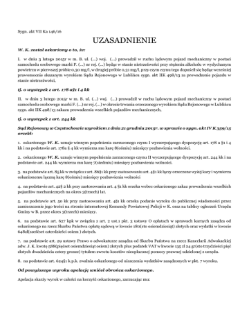 Sygn. akt VII Ka 146/16 UZASADNIENIE W. K. został oskarżony o to, że: I. w dniu 3 lutego 2015r w m. B. ul. (...) woj. (...) prowadził w ruchu lądowym pojazd mechaniczny w postaci samochodu osobowego marki F. (...) nr rej. (...) będąc w stanie nietrzeźwości przy stężeniu alkoholu w wydychanym powietrzu w pierwszej próbie 0,30 mg/l, w drugiej próbie 0,31 mg/l, przy czym czynu tego dopuścił się będąc wcześniej prawomocnie skazanym wyrokiem Sądu Rejonowego w Lublińcu sygn. akt IIK 498/13 za prowadzenie pojazdu w stanie nietrzeźwości, tj. o występek z art. 178 a§1 i 4 kk II. w dniu 3 lutego 2015r w m. B. ul. (...) woj. (...) prowadził w ruchu lądowym pojazd mechaniczny w postaci samochodu osobowego marki F. (...) nr rej. (...) w okresie trwania orzeczonego wyrokiem Sądu Rejonowego w Lublińcu sygn. akt IIK 498/13 zakazu prowadzenia wszelkich pojazdów mechanicznych, tj. o występek z art. 244 kk Sąd Rejonowy w Częstochowie wyrokiem z dnia 21 grudnia 2015r. w sprawie o sygn. akt IV K 359/15 orzekł: 1. oskarżonego W. K. uznaje winnym popełnienia zarzuconego czynu I wyczerpującego dyspozycję art. 178 a §1 i 4 kk i na podstawie art. 178a § 4 kk wymierza mu karę 8(ośmiu) miesięcy pozbawienia wolności. 2. oskarżonego W. K. uznaje winnym popełnienia zarzuconego czynu II wyczerpującego dyspozycję art. 244 kk i na podstawie art. 244 kk wymierza mu karę 7(siedmiu) miesięcy pozbawienia wolności. 3. na podstawie art. 85 kk w związku z art. 86§1 kk przy zastosowaniu art. 4§1 kk łączy orzeczone wyżej kary i wymierza oskarżonemu łączną karę 8(ośmiu) miesięcy pozbawienia wolności 4. na podstawie art. 42§ 2 kk przy zastosowaniu art. 4 §1 kk orzeka wobec oskarżonego zakaz prowadzenia wszelkich pojazdów mechanicznych na okres 3(trzech) lat. 5. na podstawie art. 50 kk przy zastosowaniu art. 4§1 kk orzeka podanie wyroku do publicznej wiadomości przez zamieszczenie jego treści na stronie internetowej Komendy Powiatowej Policji w K. oraz na tablicy ogłoszeń Urzędu Gminy w B. przez okres 3(trzech) miesięcy. 6. na podstawie art. 627 kpk w związku z art. 2 ust.1 pkt. 3 ustawy O opłatach w sprawach karnych zasądza od oskarżonego na rzecz Skarbu Państwa opłatę sądową w kwocie 180(sto osiemdziesiąt) złotych oraz wydatki w kwocie 648zł(sześćset czterdzieści osiem ) złotych. 7. na podstawie art. 29 ustawy Prawo o adwokaturze zasądza od Skarbu Państwa na rzecz Kancelarii Adwokackiej adw. J. K. kwotę 588(pięćset osiemdziesiąt osiem) złotych plus podatek VAT w kwocie 135 zl 24 gr(sto trzydzieści pięć złotych dwadzieścia cztery grosze) tytułem zwrotu kosztów nieopłaconej pomocy prawnej udzielonej z urzędu. 8. na podstawie art. 624§1 k.p.k. zwalnia oskarżonego od uiszczenia wydatków zasądzonych w pkt. 7 wyroku. Od powyższego wyroku apelację wniósł obrońca oskarżonego. Apelacja skarży wyrok w całości na korzyść oskarżonego, zarzucając mu: • obrazę przepisów prawa materialnego, a to art. 178a k.k. poprzez niesłuszne przyjęcie i uznanie, że oskarżony kierował pojazdem po spożyciu alkoholu podczas, gdy z jego wyjaśnień jednoznacznie wynika, że wynik badania na zawartość alkoholu powstał wskutek użycia środków na bazie alkoholu, a nadto oskarżony został zatrzymany na terenie prywatnym. W konkluzji skarżący wniósł o zmianę zaskarżonego wyroku i uniewinnienie oskarżonego od zarzucanych mu czynów. Sąd Okręgowy zważył, co następuje: Apelacja obrońcy oskarżonego nie zasługuje na uwzględnienie, a podniesiony w niej zarzut jest bezzasadny w stopniu oczywistym, przy czym od razu należy podnieść, że z uzasadnienia sformułowanego w apelacji zarzutu obrazy przepisu prawa materialnego, tj. art. 178a § 1 k.k. w sposób nie budzący wątpliwości wynika, że naruszenia tego przepisu skarżący upatruje w „niesłusznym przyjęciu i uznaniu, że oskarżony kierował pojazdem po spożyciu alkoholu podczas, gdy z jego wyjaśnień jednoznacznie wynika, że wynik badania na zawartość alkoholu powstał wskutek użycia środków na bazie alkoholu, a nadto oskarżony został zatrzymany na terenie prywatnym”. Z tak sformułowanego zarzutu i jego uzasadnienia wynika, że tej treści zarzut w istocie sprowadza się do zanegowania sprawstwa i winy oskarżonego W. K., a zatem do kwestionowania poczynionych w sprawie ustaleń faktycznych. Przypomnieć zatem w tym miejscu należy autorowi apelacji, że zarzut naruszenia prawa materialnego może być skutecznie podniesiony tylko wówczas, gdy ustalenia faktyczne nie budzą wątpliwości i polega on na wadliwym jego zastosowaniu (bądź niezastosowaniu) w orzeczeniu opartym na trafnych ustaleniach faktycznych. O obrazie prawa materialnego można mówić wyłącznie wówczas, gdy niekwestionowane są ustalenia faktyczne, a wadliwość rozstrzygnięcia sprowadza się do niewłaściwej subsumcji. Skarżący popadł zatem w sprzeczność, gdyż formułując w istocie zarzut błędu w ustaleniach faktycznych, postawił zaskarżonemu wyrokowi zarzut obrazy prawa materialnego, który aktualizuje się przecież dopiero wówczas, gdy ustalenia faktyczne przyjęte za podstawę zaskarżonego orzeczenia nie są kwestionowane. Dlatego też w takiej sytuacji skarżący powinien postawić tylko zarzut błędu w ustaleniach faktycznych i wskazać, że mógł mieć on wpływ na treść wyroku właśnie co do kwalifikacji prawnej czynu (por. wyrok SN z 23 lipca 1974 r., V KR 212/74, OSNKW 1974, nr 12, poz. 233; postanowienia SN: z 2 grudnia 2008 r., III KK 230/08, LEX nr 491425; z 20 listopada 2008 r., V KK 158/08, OSNwSK 2008, poz. 2340; z 15 lutego 2007 r., IV KK 234/06, OSNwSK 2007, poz. 438; z 25 lipca 2005 r., V KK 61/05, OSNwSK 2005, poz. 1412). Kontrola odwoławcza zaskarżonego wyroku wykazała, że Sąd Rejonowy dokonał wszechstronnej i wnikliwej analizy zgromadzonego materiału dowodowego, a swoje stanowisko wyrażone w treści zaskarżonego wyroku szc