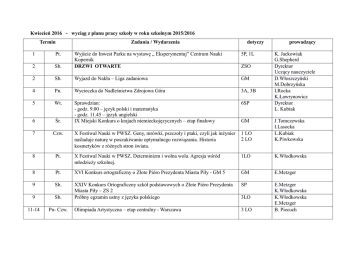 Kwiecień 2016 - wyciąg z planu pracy szkoły w roku szkolnym 2015/2016 Termin 1 Pt. 2 Zadania / Wydarzenia dotyczy prowadzący 5P, 1L Sb. Wyjście do Inwest Parku na wystawę „ Eksperymentuj” Centrum Nauki Kopernik DRZWI OTWARTE 2 Sb. Wyjazd do Nakła – Liga zadaniowa GM 4 Pn. Wycieczka do Nadleśnictwa Zdrojowa Góra 3A, 3B 5 Wt. 6SP 6 Śr. Sprawdzian: - godz. 9.00 – język polski i matematyka - godz. 11.45 – język angielski IX Miejski Konkurs o krajach niemieckojęzycznych – etap finałowy 7 Czw. X Festiwal Nauki w PWSZ. Geny, mrówki, pszczoły i ptaki, czyli jak inżynier naśladuje naturę w poszukiwaniu optymalnego rozwiązania. Historia kosmetyków z różnych stron świata. 1 LO 2 LO J.Tomczewska I.Lasocka L.Kubiak K.Piwkowska 8 Pt. X Festiwal Nauki w PWSZ. Determinizm i wolna wola. Agresja wśród młodzieży szkolnej. 1LO K.Włodkowska 8 Pt. XVI Konkurs ortograficzny o Złote Pióro Prezydenta Miasta Piły - GM 5 GM E.Metzger 9 Sb. SP 9 Sb. XXIV Konkurs Ortograficzny szkół podstawowych o Złote Pióro Prezydenta Miasta Piły – ZS 2 Próbny egzamin ustny z języka polskiego 11-14 Pn- Czw. Olimpiada Artystyczna – etap centralny - Warszawa 3 LO E.Metzger K.Włodkowska K.Włodkowska E.Metzger B. Piecuch ZSO GM 3LO K. Jackowiak G.Shepherd Dyrektor Uczący nauczyciele D.Włoszczyński M.Dobrzyńska I.Rocka K.Ławrynowicz Dyrektor L. Kubiak 12 Wt. Wyjście do RCK – Edukacja muzyczna 3A, 3B I.Rocka K.Ławrynowicz 12 Wt. Turniej historyczny – Jeden z dziesięciu 6P Ł.Biernacki 12 Wt. Konkurs Języka Angielskiego dla klas trzecich szkoły podstawowej 3A, 3B K. Jackowiak 12 Wt. Warsztaty w Ośrodku edukacyjnym Nadleśnictwa Zdrojowa Góra 4A, 4B Diagnoza dojrzałości szkolnej kandydatów do klasy pierwszej szkoły podstawowej Zajęcia otwarte: Nanotechnologie i materiały aktywne. P.Wernicki I.Gajewska Komisja rekrutacyjna 2LO A.Kuśnierz Ogólnopolski Sprawdzian Kompetencji Trzecioklasisty – Operon 3A, 3B 13-14 Śr.-Czw. 13 Śr. 14 Czw. 15 Pt. Miejski Konkurs Matematyczny klas szóstych – etap szkolny 6P I.Rocka K.Ławrynowicz M.Dobrzyńska 15 Pt. 1,2 G B. Piecuch 18-20 Pn.-Śr. Koncert Orkiestry Kameralnej Polskiego Radia „Amadeus”w RCK „Fabryka Emocji” w Pile Egzamin gimnazjalny wg oddzielnego harmonogramu 3GM 18 Pn. Zielona lekcja na składowisku odpadów w Kłodzie - wycieczka 4A, 4B Dyrektor B.Piecuch P.Wernicki 26 Wt. Posiedzenie Rady Pedagogicznej - klasyfikacja uczniów klasy 3LO ZSO STO Dyrektor 28 Czw. Miejski Konkurs Matematyczny klas szóstych – etap miejski 6P M.Dobrzyńska 28 Czw. Uroczystość pożegnania absolwentów liceum 3L, 2L B. Biernacka P.Wernicki
