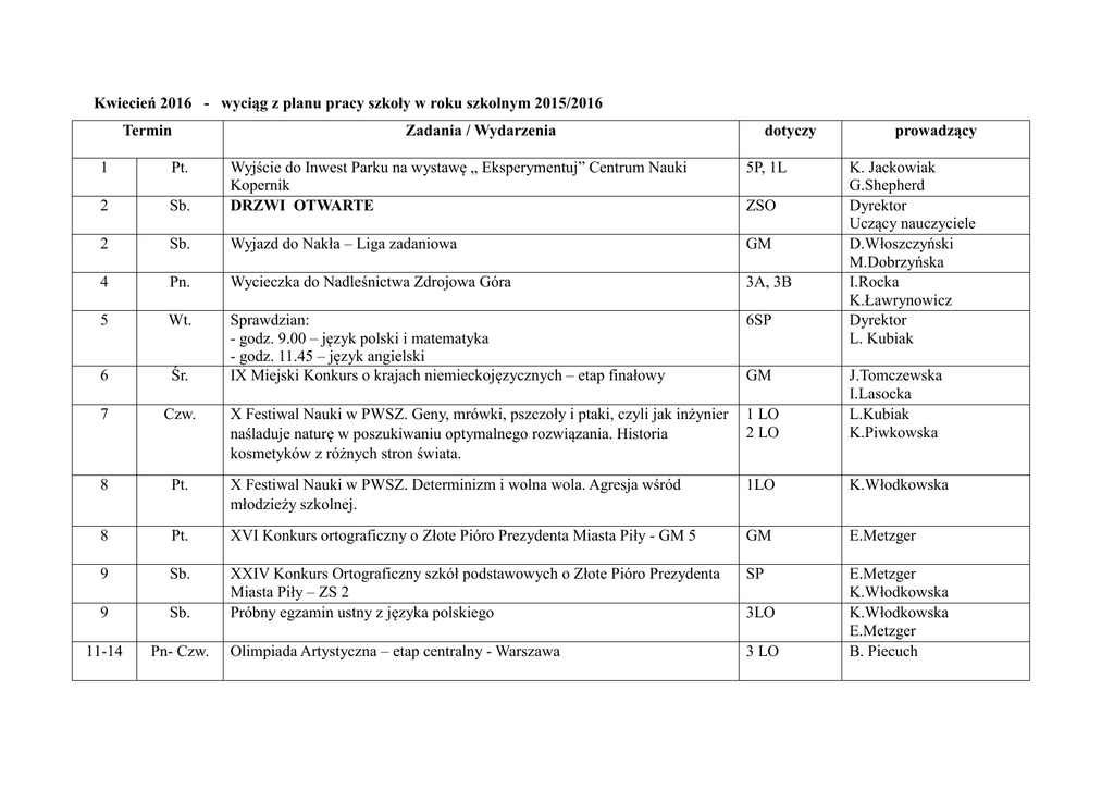 Kwiecień 2016 - wyciąg z planu pracy szkoły w roku szkolnym 2015