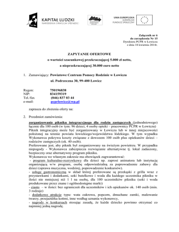 Załącznik nr 6 do zarządzenia Nr 15 Dyrektora PCPR w Łowiczu z dnia 18 kwietnia 2014r. ZAPYTANIE OFERTOWE o wartości szacunkowej przekraczającej 5.000 zł netto, a nieprzekraczającej 30.000 euro netto 1. Zamawiający: Powiatowe Centrum Pomocy Rodzinie w Łowiczu ul. Podrzeczna 30, 99-400 Łowicz Regon: NIP: Tel./fax e-mail: 750196838 834159319 (046) 837 03 44 [email protected] zaprasza do złożenia oferty na: 2. Przedmiot zamówienia: zorganizowanie pikniku integracyjnego dla rodzin zastępczych (jednodniowego) łącznie dla 100 osób (w tym: 96 dzieci, 4 osoby opieki – pracownicy PCPR w Łowiczu) Piknik integracyjny może być zorganizowany w Łowiczu lub w innej miejscowości położonej na terenie powiatu łowickiego/województwa łódzkiego. W tym wypadku Wykonawca pokrywa koszty związane z dowozem 100 osób plus opiekunów dzieci – rodziców zastępczych (ok. 40 osób). Preferowane jest, aby piknik był zorganizowany na świeżym powietrzu. W przypadku niepogody - Wykonawca zabezpiecza rozwiązanie alternatywne tj. lokal zadaszony, bezpieczny oraz alternatywny program pikniku. Wykonawca we własnym zakresie ma obowiązek zagwarantować: - program kulturalno-rozrywkowy dla dzieci np. zaprosi animatora lub instytucję organizującą w/w program, osobę odpowiedzialną za poprowadzenie zabawy dla dzieci (oprawa muzyczna, wodzirej, poprowadzenie konkursów). - usługę gastronomiczną w skład której preferowane są przekąski z grilla wraz z przystawkami i dodatkami, soki butelkowe i woda dla każdego uczestnika pikniku w ilości nie mniejszej niż 1 l na osobę, dla 100 uczestników pikniku (soki i woda produkowane przez znane i ogólnodostępne marki) - ciasto – w ilości: bez ograniczeń dla uczestników i ich opiekunów ok. 140 osób (min. 3 rodzaje) - dodatkowe atrakcje typu: wata cukrowa, popcorn, dmuchane zamki, malowanie twarzy, przejażdżka końmi, inne według uznania wykonawcy, - nagrody w konkursach stosując zasadę, że każde dziecko powinno otrzymać co najmniej jedną nagrodę. W przypadku imprezy plenerowej Wykonawca zobowiązany jest zagwarantować bezpieczne warunki pobytu z dostępem do pełnego węzła sanitarnego (toalety, umywalki, bieżąca woda, mydło w płynie, papier toaletowy, ręczniki jednorazowe). W przypadku miejsca pikniku poza Łowiczem - Wykonawca zapewnia dojazd do wskazanego miejsca jak i powrót. Wykonawca zobowiązany jest ubezpieczyć wszystkich uczestników imprezy integracyjnej. Piknik integracyjny może być zorganizowany na terenie miasta Łowicza, powiatu łowickiego/województwa łódzkiego W 2014r. piknik integracyjny dla rodzin zastępczych przeznaczony jest dla mieszkańców powiatu łowickiego i jest realizowany zgodnie z założeniami współfinansowanego przez Europejski Fundusz Społeczny projektu UMIEM WIĘCEJ realizowanego przez Powiatowe Centrum Pomocy Rodzinie w Łowiczu w ramach Priorytetu VII poddziałania 7.1.2. Programu Operacyjnego Kapitał Ludzki ogółem dla 100 osób (dzieci i opiekunów). 3. Termin składania ofert: 19 maj 2014r. do godziny 12.00 4. Miejsce lub sposób złożenia oferty: 1) Ofertę należy sporządzić w języku polskim, w formie pisemnej. 2) Oferent ponosi wszelkie koszty związane z przygotowaniem i złożeniem oferty. 3) W formularzu ofertowym należy wskazać: cenę oferty netto oraz brutto za całą usługę oraz poszczególne elementy. Ceny muszą być podane cyfrą i słownie. 4) Suma poszczególnych składników/elementów daje całkowitą cenę/wartość oferty. 5) W formularzu ofertowym należy osobno wskazać cenę: cateringu koszt oprawy muzycznej (jeśli będzie), koszt ubezpieczenia uczestników, koszt transportu (w przypadku, gdy piknik odbywać się będzie poza miastem, pozostałe koszty związane z organizacją pikniku. 6) Każdy oferent może złożyć tylko jedną ofertę. 7) Ofertę należy dostarczyć osobiście lub za pośrednictwem poczty, kuriera (liczy się data i godzina dostarczenia oferty do PCPR w Łowiczu, nie zaś data stempla pocztowego) w zaklejonej kopercie z zamieszczoną nazwą i adresem oferenta oraz adnotacją „Nie otwierać przed 19 maja 2014r. do godziny 12. „Oferta na zorganizowanie pikniku integracyjnego dla rodzin zastępczych realizowana w ramach projektu PO KL UMIEM WIĘCEJ”. 8) Za ważną uznaje się ofertę, która została zarejestrowana w sekretariacie PCPR w terminie wskazanym powyżej. Miejsce złożenia oferty: Powiatowe Centrum Pomocy Rodzinie w Łowiczu ul. Podrzeczna 30, 99-400 Łowicz 5. Miejsce lub sposób uzyskania informacji oraz dodatkowej dokumentacji określającej szczegółowe warunki udziału w zamówieniu: Powiatowe Centrum Pomocy Rodzinie w Łowiczu, 99-400 Łowicz, ul. Podrzeczna 30. Osoba do kontaktu: P. Małgorzata Janicka tel. 837 03 44. Opis kryteriów oceny oferty i ich znaczenie 1. Zamawiający dokona oceny ofert na podstawie następujących kryteriów (ogólnie w skali 100 pkt) 1) cena – 50 pkt ilość punktów przyznanych danej ofercie będzie wyliczana według następującego wzoru: najniższa oferowana cena brutto ----------------------------------------- x 100% x 50 pkt cena z oferty badanej Maksymalna ilość punktów przyznana w tym kryterium wynosi 50 pkt. 2) atrakcyjność programu pobytu – 35 pkt 3) doświadczenie w rozliczeniach integracyjnych – 15 pkt. związanych z finansowaniem imprez Doświadczenie w rozliczeniach związanych z finansowaniem imprez integracyjnych = ilość punktów uzyskanych przez ofertę badaną/oferta z uzyskaną max ilością punktów x 100% x 15 pkt 0 imprez – 0 pkt od 1- 3 imprez - 6 punktów od 4 do 6 imprez – 10 punktów od 7 i więcej imprez – 15 pkt na potwierdzenie należycie wykonanej usługi należy załączyć dokumenty (np. referencje lub protokół odbioru) potwierdzające, że usługa/usługi została/-y wykonane lub są wykonywane należycie. W przypadku nie podłączenia referencji/protokołu odbioru – usługa nie będzie brana pod uwagę prz