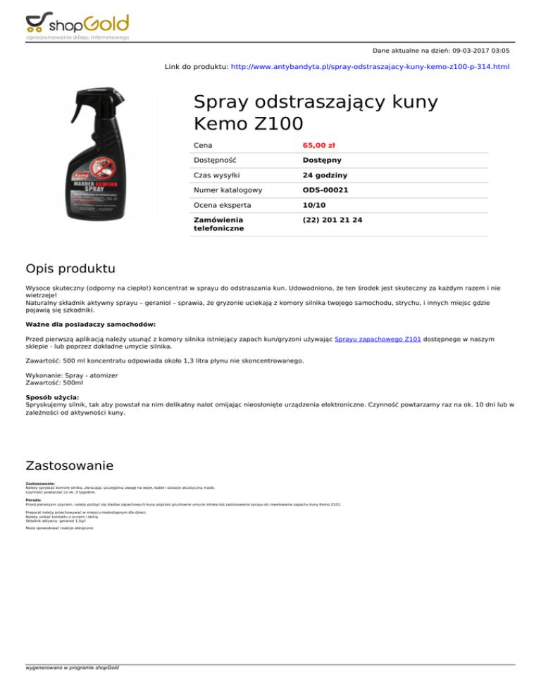 Dane aktualne na dzień: 09-03-2017 03:05 Link do produktu: http://www.antybandyta.pl/spray-odstraszajacy-kuny-kemo-z100-p-314.html Spray odstraszający kuny Kemo Z100 Cena 65,00 zł Dostępność Dostępny Czas wysyłki 24 godziny Numer katalogowy ODS-00021 Ocena eksperta 10/10 Zamówienia telefoniczne (22) 201 21 24 Opis produktu Wysoce skuteczny (odporny na ciepło!) koncentrat w sprayu do odstraszania kun. Udowodniono, że ten środek jest skuteczny za każdym razem i nie wietrzeje! Naturalny składnik aktywny sprayu – geraniol – sprawia, że gryzonie uciekają z komory silnika twojego samochodu, strychu, i innych miejsc gdzie pojawią się szkodniki. Ważne dla posiadaczy samochodów: Przed pierwszą aplikacją należy usunąć z komory silnika istniejący zapach kun/gryzoni używając Sprayu zapachowego Z101 dostępnego w naszym sklepie - lub poprzez dokładne umycie silnika. Zawartość: 500 ml koncentratu odpowiada około 1,3 litra płynu nie skoncentrowanego. Wykonanie: Spray - atomizer Zawartość: 500ml Sposób użycia: Spryskujemy silnik, tak aby powstał na nim delikatny nalot omijając nieosłonięte urządzenia elektroniczne. Czynność powtarzamy raz na ok. 10 dni lub w zależności od aktywności kuny. Zastosowanie Zastosowanie: Należy spryskać komorę silnika, zwracając szczególną uwagę na węże, kable i izolacje akustyczną maski. Czynność powtarzać co ok. 3 tygodnie. Porada: Przed pierwszym użyciem, należy pozbyć się śladów zapachowych kuny poprzez gruntowne umycie silnika lub zastosowanie sprayu do niwelowania zapachu kuny Kemo Z101. Preparat należy przechowywać w miejscu niedostępnym dla dzieci. Należy unikać kontaktu z oczami i skórą Składnik aktywny: geraniol 1,5g/l Może spowodować reakcje alergiczne wygenerowano w programie shopGold Powered by TCPDF (www.tcpdf.org)