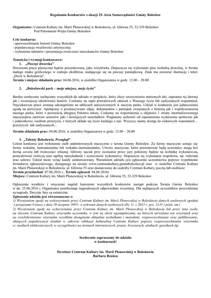 Regulamin Konkursów z okazji 25- lecia Samorządności Gminy Bolesław Organizator: Centrum Kultury im. Marii Płonowskiej w Bolesławiu, ul. Główna 55, 32-329 Bolesław Pod Patronatem Wójta Gminy Bolesław Cele konkursu: - upowszechnianie historii Gminy Bolesław - popularyzacja wrażliwości artystycznej - wyłonienie talentów i prezentacja twórczości mieszkańców Gminy Bolesław Tematyka i wymogi konkursowe: 1. „Pieczęć dworska” Stworzona praca plastyczna będzie prezentowana, jako wizytówka. Dopuszcza się wykonanie prac techniką dowolną, w formie małego znaku graficznego w rodzaju ekslibrisu, nadającego się na pieczęć pamiątkową. Znak ma zawierać ilustrację i tekst: „Dwór w Bolesławiu”. Termin i miejsce składania prac: 04.06.2016, w siedzibie Organizatora w godz. 12.00 – 20.00 2. „Bolesławski park – moje miejsce, moje życie” Bardzo serdecznie zachęcamy wszystkich do udziału w projekcie, który służy uwiecznieniu minionych dni, zapisaniu tej dawnej jak i wczorajszej (dosłownie) historii. Czekamy na zapis prawdziwych zdarzeń z Waszego życia lub zasłyszanych wspomnień. Najciekawsze prace zostaną udostępnione na tablicach umieszczonych w naszym parku. Udział w konkursie jest jednocześnie zgodą na powyższe. Apelujemy o przekazywanie zdjęć, dokumentów i pamiątek związanych z historią jak i współczesnością naszego parku, które z pewnością ubogacą Państwa teksty. Czekamy na wspomnienia o objętości 1 strony znormalizowanego maszynopisu zarówno seniorów jaki i dzisiejszych nastolatków. Pragniemy uchronić od zapomnienia wydarzenia społeczne jak i jednostkowe, osobiste przeżycia, z których składa się życie każdego z nas. Wszyscy mamy dostęp do ciekawych wspomnień… przeżytych lub zasłyszanych... Termin składania prac: 04.06.2016, w siedzibie Organizatora w godz. 12.00 – 20.00 3. „Talenty Bolesławia. Przegląd” Celem konkursu jest wyłonienie osób utalentowanych muzycznie z terenu Gminy Bolesław. Za formy muzyczne uznaje się: formy wokalne, instrumentalne lub wokalno-instrumentalne. Utwory muzyczne, które prezentować będą uczestnicy mogą być formą coveru lub twórczości własnej. Główny nacisk przy ocenianiu przez jury położony będzie na technikę wykonawczą, pomysłowość twórczą oraz ogólną muzykalność i sceniczność wykonawcy. Dopuszcza się wykonania zespołowe, np. rodzinne oraz solowe. Udział może wziąć każdy zainteresowany. Warunkiem udziału jest zgłoszenie uczestnictwa poprzez wypełnienie formularza zgłoszeniowego, dostępnego na stronie www.centrumkultury.gminaboleslaw.pl oraz w siedzibie Centrum Kultury im. Marii Płonowskiej w Bolesławiu, ul. Główna 55 oraz dostarczenie do siedziby Centrum Kultury, pocztą lub osobiście Termin przesłuchań: 07.06.2016 r., Termin zgłoszeń: 04.06.2016r. Miejsce: Centrum Kultury im. Marii Płonowskiej w Bolesławiu, ul. Główna 55, 32-329 Bolesław Ogłoszenie wyników i wręczenie nagród laureatom wszystkich konkursów nastąpi podczas Święta Gminy Bolesław w dn. 25.06.2016 r. Organizator poinformuje nagrodzonych odpowiednio wcześniej. Dla najlepszych uczestników przewidziane są nagrody. Decyzje Jury są ostateczne. Zgłoszenie udziału jest równoznaczne z: 1) Wyrażeniem zgody na wykorzystanie przez Centrum Kultury im. Marii Płonowskiej w Bolesławiu danych osobowych zgodnie z przepisami Ustawy z dnia 29 sierpnia 1997r. o ochronie danych osobowych (Dz. U. z 2015 r. poz. 2135 z późn. zm.) 2) Wyrażeniem zgody na wykorzystanie przez Centrum Kultury im. Marii Płonowskiej w Bolesławiu lub przez inne osoby na zlecenie Centrum Kultury wizerunku uczestnika, w tym na obrót egzemplarzami, na których utrwalono ten wizerunek oraz na zwielokrotnienie wizerunku wszelkimi dostępnymi aktualnie technikami i metodami, rozpowszechnianie oraz publikowanie, służących popularyzacji działań w zakresie edukacji kulturalnej Centrum Kultury poprzez rozpowszechnianie wizerunku w: mediach elektronicznych, w szczególności na stronach internetowych, prasie, broszurach, ulotkach, gazetkach itp. Serdecznie zapraszamy do udziału w konkursach! Dyrektor Centrum Kultury im. Marii Płonowskiej w Bolesławiu Barbara Rzońca