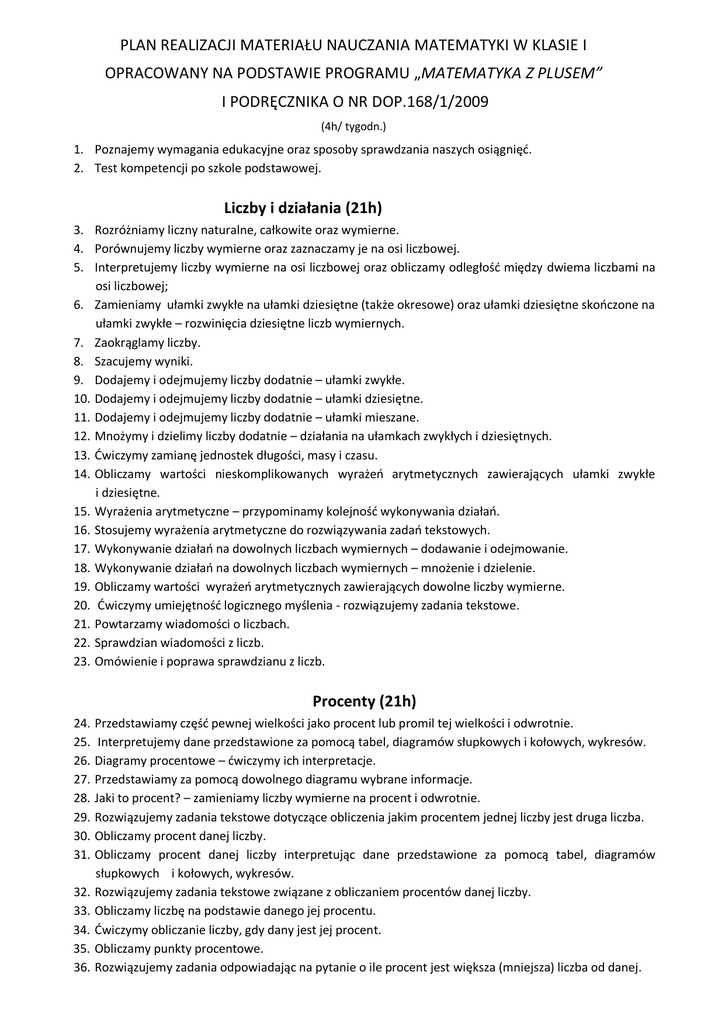 PLAN REALIZACJI MATERIAŁU NAUCZANIA MATEMATYKI W KLASIE I OPRACOWANY NA PODSTAWIE PROGRAMU „MATEMATYKA Z PLUSEM” I PODRĘCZNIKA O NR DOP.168/1/2009 (4h/ tygodn.) 1. Poznajemy wymagania edukacyjne oraz sposoby sprawdzania naszych osiągnięć. 2. Test kompetencji po szkole podstawowej. Liczby i działania (21h) 3. Rozróżniamy liczny naturalne, całkowite oraz wymierne. 4. Porównujemy liczby wymierne oraz zaznaczamy je na osi liczbowej. 5. Interpretujemy liczby wymierne na osi liczbowej oraz obliczamy odległość między dwiema liczbami na osi liczbowej; 6. Zamieniamy ułamki zwykłe na ułamki dziesiętne (także okresowe) oraz ułamki dziesiętne skończone na ułamki zwykłe – rozwinięcia dziesiętne liczb wymiernych. 7. Zaokrąglamy liczby. 8. Szacujemy wyniki. 9. Dodajemy i odejmujemy liczby dodatnie – ułamki zwykłe. 10. Dodajemy i odejmujemy liczby dodatnie – ułamki dziesiętne. 11. Dodajemy i odejmujemy liczby dodatnie – ułamki mieszane. 12. Mnożymy i dzielimy liczby dodatnie – działania na ułamkach zwykłych i dziesiętnych. 13. Ćwiczymy zamianę jednostek długości, masy i czasu. 14. Obliczamy wartości nieskomplikowanych wyrażeń arytmetycznych zawierających ułamki zwykłe i dziesiętne. 15. Wyrażenia arytmetyczne – przypominamy kolejność wykonywania działań. 16. Stosujemy wyrażenia arytmetyczne do rozwiązywania zadań tekstowych. 17. Wykonywanie działań na dowolnych liczbach wymiernych – dodawanie i odejmowanie. 18. Wykonywanie działań na dowolnych liczbach wymiernych – mnożenie i dzielenie. 19. Obliczamy wartości wyrażeń arytmetycznych zawierających dowolne liczby wymierne. 20. Ćwiczymy umiejętność logicznego myślenia - rozwiązujemy zadania tekstowe. 21. Powtarzamy wiadomości o liczbach. 22. Sprawdzian wiadomości z liczb. 23. Omówienie i poprawa sprawdzianu z liczb. Procenty (21h) 24. 25. 26. 27. 28. 29. 30. 31. 32. 33. 34. 35. 36. Przedstawiamy część pewnej wielkości jako procent lub promil tej wielkości i odwrotnie. Interpretujemy dane przedstawione za pomocą tabel, diagramów słupkowych i kołowych, wykresów. Diagramy procentowe – ćwiczymy ich interpretacje. Przedstawiamy za pomocą dowolnego diagramu wybrane informacje. Jaki to procent? – zamieniamy liczby wymierne na procent i odwrotnie. Rozwiązujemy zadania tekstowe dotyczące obliczenia jakim procentem jednej liczby jest druga liczba. Obliczamy procent danej liczby. Obliczamy procent danej liczby interpretując dane przedstawione za pomocą tabel, diagramów słupkowych i kołowych, wykresów. Rozwiązujemy zadania tekstowe związane z obliczaniem procentów danej liczby. Obliczamy liczbę na podstawie danego jej procentu. Ćwiczymy obliczanie liczby, gdy dany jest jej procent. Obliczamy punkty procentowe. Rozwiązujemy zadania odpowiadając na pytanie o ile procent jest większa (mniejsza) liczba od danej. 37. Stosujemy obliczenia procentowe w zadaniach. 38. Rozwiązuje typowe zadania tekstowe związane z zastosowaniem procentów. 39. Stosuje obliczenia procentowe do rozwiązywania problemów w kontekście praktycznym, np. oblicza ceny po podwyżce lub obniżce o dany procent, wykonuje obliczenia związane z VAT, oblicza odsetki dla lokaty rocznej. 40. Porównujemy oferty oprocentowania lokat w różnych bankach. 41. Rozwiązujemy nietypowe zadania tekstowe związane z procentami. 42. Powtarzamy wiadomości dotyczące procentów. 43. Sprawdzian wiadomości – procenty. 44. Omówienie i poprawa sprawdzianu z procentów. Figury na płaszczyźnie(21h) 45. Przypomnienie wiadomości o prostych i odcinkach. Konstruujemy prostą przechodzącą przez dany punkt A, prostopadłą do danej prostej. 46. Konstruujemy prostą przechodzącą przez dany punkt A, równoległą do danej prostej. 47. Rozróżniamy kąty i obliczamy ich miary. 48. Korzystamy ze związków między kątami utworzonymi przez prostą przecinającą dwie proste równoległe. 49. Trójkąty -przypominamy warunek istnienia trójkąta oraz klasyfikację trójkątów ze względu na boki oraz kąty między nimi zawarte. 50. Stosujemy zależności między bokami i kątami w trójkącie w zadaniach tekstowych 51. Poznajemy cechy przystawania trójkątów . 52. Konstruujemy trójkąty mając dane ich boki, dwa boki i kąt zawarty między nimi lub bok i dwa kąty leżące przy tym boku. 53. Uzasadniamy przystawanie trójkątów. 54. Przypominamy najważniejsze wiadomości o czworokątach. 55. Obliczamy miary kątów w poznanych czworokątach. 56. Korzystamy z własności kątów i przekątnych w prostokątach, równoległobokach, rombach i w trapezach. 57. Obliczamy pole prostokąta zwracając uwagę na jednostkę. 58. Obliczamy pola powierzchni czworokątów – przypomnienie wzorów. Ćwiczymy zamianę jednostek pola. 59. Stosujemy własności czworokątów do obliczania ich pól powierzchni. 60. Wykorzystujemy własności kątów i przekątnych w czworokątach – ćwiczenia. 61. Odczytujemy i zaznaczamy punkty w układzie współrzędnych. 62. Obliczamy pola i obwody wielokątów w układzie współrzędnych. 63. Powtarzamy i utrwalamy wiadomości dotyczące figur na płaszczyźnie. 64. Sprawdzian wiadomości – figury na płaszczyźnie. 65. Omówienie i poprawa sprawdzianu – figury na płaszczyźnie. 66. Rozwiązujemy zadania z 2 sesji z plusem. 67. Omawiamy i poprawiamy zadania z 2 sesji z plusem. Wyrażenia algebraiczne (19h) 68. 69. 70. 71. 72. 73. Opisujemy za pomocą wyrażeń algebraicznych związki między różnymi wielkościami. Ćwiczymy budowanie i odczytywanie wyrażeń algebraicznych. Obliczamy wartości liczbowe wyrażeń algebraicznych. Porządkujemy jednomiany. Zapisujemy warunki zadania w postaci jednomianów. Rozróżniamy jednomiany podobne oraz redukujemy wyrazy podobne. 74. Obliczamy wartości liczbowe wyrażeń algebraicznych po przekształceniu do postaci dogodnej do obliczeń. 75. Dodajemy i odejmujemy sumy algebraiczne. 76. Ćwiczymy zapisywanie wyrażeń algeb