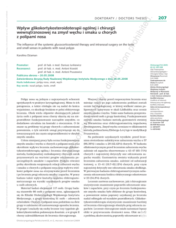 ibu tio np roh ibit 207 The influence of the systemic glucocorticosteroid therapy and intranasal surgery on the taste and smell senses in patients with nasal polyps Karolina Dżaman prof. dr hab. n med. Dariusz Jurkiewicz prof. dr hab. n. med. Antoni Krzeski prof. dr hab. n. med. Antoni Pruszewicz Publiczna obrona – 20.05.2008 Zatwierdzona decyzją Rady Naukowej Wojskowego Instytutu Medycznego z dnia 28.05.2008 -d istr Promotor: Recenzenci: Hasła indeksowe: polipy nosa, smak, węch us eo Wszyscy chorzy przed rozpoczęciem leczenia oraz miesiąc czasu po jego zakończeniu poddani zostali ocenie laryngologicznej, w której wielkość zmian polipowatych opisywano w skali Lildholdta oraz ocenie zmysłu smaku i węchu. Takie same badania przeprowadzono wśród osób z grupy kontrolnej. Funkcjonowanie zmysłu smaku badano metodą gustometrii swoistej wg Börnsteina oraz elektrogustometrią impulsową dwubiegunową. Zmysł węchu oceniano w olfaktometrii metodą podmuchową Elsberga-Levy’ego w modyfikacji Pruszewicza. Na podstawie uzyskanych wyników, przed leczeniem stwierdzono subiektywne zaburzenia węchu u 57 (86,36%) i smaku u 28 (42,42%) chorych. W badaniu olfaktometrycznym przed leczeniem zaburzenia węchu zależnie od zapachu obserwowano u 43-47 (65–71%) chorych i najczęściej dotyczyły one odczuwania zapachu wanilii. Gustometria swoista wykazała przed leczeniem zaburzenia smaku, zależnie od substancji testowej, u 13–41 (19,7–62,12%) chorych, przy czym najczęściej dotyczyły one odczuwania smaku słodkiego. W pierwszym badaniu elektrogustometrycznym zaburzenia odczuwania bodźca elektrycznego odnotowano w 23 (34,8%) chorych. Leczenie zarówno zachowawcze, jak i chirurgicznie statystycznie znamiennie poprawiło odczuwanie smaków i zapachów, przy czym po leczeniu funkcjonowanie zmysłu smaku było zbliżone do grupy kontrolnej, a powonienie mimo poprawy uzyskanej po leczeniu nadal odbiegało od wyników prawidłowych. Glikokortykosteroidoterapia statystycznie znamiennie bardziej od leczenia chirurgicznego obniżyła próg odczucia zapachów. Leczenie chirurgiczne miało natomiast lepszy efekt w przywracaniu drożności nosa. Obie metody z podobną skutecznością poprawiły odczuwanie smaku is c op y is for pe rs on al Polipy nosa są jednym z najczęstszych schorzeń spotykanych w praktyce laryngologicznej. Mimo to ich patogeneza, a także etiologia nie są nadal do końca wyjaśnione, co skutkuje brakiem w pełni efektywnego leczenia. Obok wielu objawów obniżających jakość życia osób z polipami nosa chorzy skarżą się na nieprawidłowe funkcjonowanie narządów zmysłów, co dodatkowo utrudnia im kontakt z otoczeniem. O ile znane są problemy tej grupy chorych z zaburzeniami powonienia, o tyle niewiele uwagi przywiązuje się do towarzyszących im często nieprawidłowości w obrębie zmysłu smaku. Celem niniejszej pracy była ocena funkcjonowania zmysłu smaku i węchu u chorych z polipami nosa oraz określenie wpływu leczenia zachowawczego glikokortykosteroidoterapią ogólną i leczenia chirurgicznego metodą funkcjonalnej endoskopowej chirurgii zatok przynosowych na wartości progów odczuwania poszczególnych smaków i zapachów. Podjęto również próbę określenia wzajemnych relacji zaburzeń węchu i smaku u chorych z polipami nosa oraz wpływu wielkości polipów nosa na otrzymywane przed leczeniem i po leczeniu progi odczucia smaku i zapachu. W pracy badano także wpływ kształtu impulsu elektrogustometrycznego na wyniki uzyskanych progów smaku u osób zdrowych. Materiał badań obejmował 117 osób. Grupę badaną stanowiło 66 osób z polipami nosa, zgłaszających się do Kliniki Otolaryngologii Wojskowego Instytutu Medycznego, a grupę kontrolną 51 osób – zdrowych ochotników. Chorych z polipami nosa podzielono na dwie grupy w zależności od zastosowanego sposobu leczenia. W grupie I znalazły się osoby leczone trzy tygodnie glikokortykosteroidem podawanym doustnie, a w grupie II chorzy zakwalifikowani do leczenia chirurgicznego. nly Key words: nasal polyps, taste, smell Th This copy is for personal use only - distribution prohibited. This copy is for personal use only - distribution prohibited. This copy is for personal use only - distribution prohibited. - ed . - Wpływ glikokortykosteroidoterapii ogólnej i chirurgii wewnątrznosowej na zmysł węchu i smaku u chorych z polipami nosa - This copy is for personal use only - distribution prohibited. DOKTORATY / DOCTORS THESES Otolar yngologia Polska tom 63, nr 2, mar zec – k wiecień 20 0 9 Otolaryngol Pol 2009; 63 (2): 207-208 ©by Towarzystwo Otorynolaryngologów – Chirurgów Głowy i Szyi Otrzymano/Received: 5.01.2009 Zaakceptowano do druku/Accepted: 8.01.2009 Klinika Otolaryngologii Wojskowy Instytut Medyczny w Warszawie Kierownik : prof. dr hab. n med. Dariusz Jurkiewicz Konflikt interesu/ Conflicts of interest: Autorzy pracy nie zgłaszają konfliktu interesów. Adres do korespondencji/ Address for correspondence: imię i nazwisko: Karolina Dżaman adres pocztowy: Klinika Otolaryngologii ul. Szaserów 128 00-909 Warszawa tel. 6816471 fax 6816462 ed . - przez chorych. Powrót prawidłowego funkcjonowania węchu i smaku po leczeniu nie zależał od wielkości zmian polipowatych stwierdzanych u chorych przed leczeniem. Przeprowadzona analiza statystyczna wykazała, że przed leczeniem subiektywna ocena zmysłu smaku przez chorych korelowała z oceną zmysłu węchu. Natomiast w badaniu przeprowadzonym po leczeniu tylko u osób leczonych zachowawczo poprawa węchu wiązała się z poprawą smaku. Na podstawie obserwacji przeprowadzonych w grupie kontrolnej stwierdzono, że kształt impulsu wykorzystywanego w elektrogustometrii nie miał statystycznie znamiennego wpływu na wyniki uzyskanych progów smaku. ibu tio np roh ibit This copy is for personal use only - distribution prohibited. DOKTORATY / DOCTORS THESES y is op is c Th - This copy is for personal use only - distributio