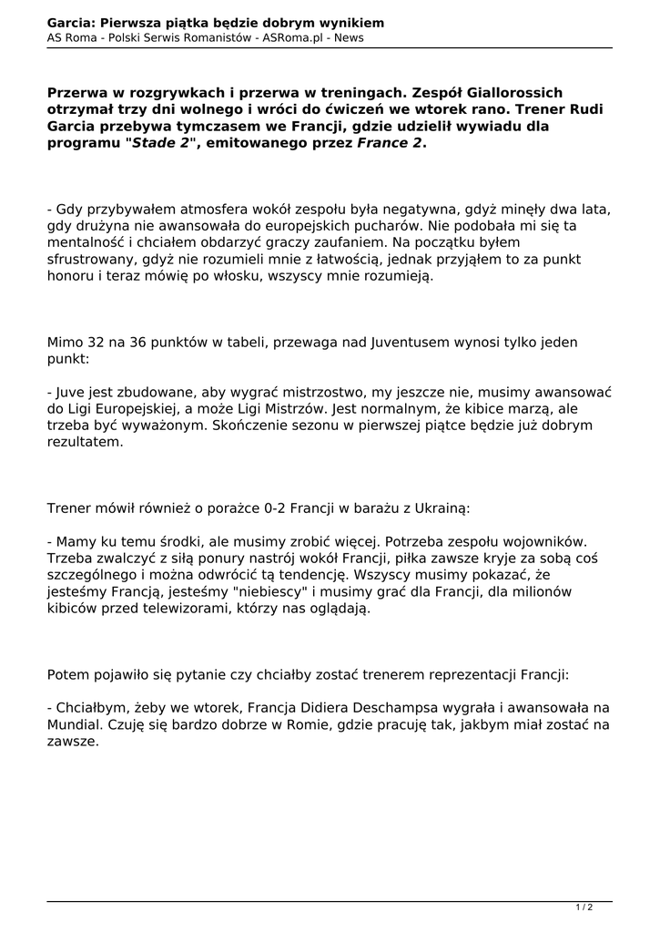 Garcia: Pierwsza piątka będzie dobrym wynikiem AS Roma - Polski Serwis Romanistów - ASRoma.pl - News Przerwa w rozgrywkach i przerwa w treningach. Zespół Giallorossich otrzymał trzy dni wolnego i wróci do ćwiczeń we wtorek rano. Trener Rudi Garcia przebywa tymczasem we Francji, gdzie udzielił wywiadu dla programu "Stade 2", emitowanego przez France 2. - Gdy przybywałem atmosfera wokół zespołu była negatywna, gdyż minęły dwa lata, gdy drużyna nie awansowała do europejskich pucharów. Nie podobała mi się ta mentalność i chciałem obdarzyć graczy zaufaniem. Na początku byłem sfrustrowany, gdyż nie rozumieli mnie z łatwością, jednak przyjąłem to za punkt honoru i teraz mówię po włosku, wszyscy mnie rozumieją. Mimo 32 na 36 punktów w tabeli, przewaga nad Juventusem wynosi tylko jeden punkt: - Juve jest zbudowane, aby wygrać mistrzostwo, my jeszcze nie, musimy awansować do Ligi Europejskiej, a może Ligi Mistrzów. Jest normalnym, że kibice marzą, ale trzeba być wyważonym. Skończenie sezonu w pierwszej piątce będzie już dobrym rezultatem. Trener mówił również o porażce 0-2 Francji w barażu z Ukrainą: - Mamy ku temu środki, ale musimy zrobić więcej. Potrzeba zespołu wojowników. Trzeba zwalczyć z siłą ponury nastrój wokół Francji, piłka zawsze kryje za sobą coś szczególnego i można odwrócić tą tendencję. Wszyscy musimy pokazać, że jesteśmy Francją, jesteśmy "niebiescy" i musimy grać dla Francji, dla milionów kibiców przed telewizorami, którzy nas oglądają. Potem pojawiło się pytanie czy chciałby zostać trenerem reprezentacji Francji: - Chciałbym, żeby we wtorek, Francja Didiera Deschampsa wygrała i awansowała na Mundial. Czuję się bardzo dobrze w Romie, gdzie pracuję tak, jakbym miał zostać na zawsze. 1/2 Garcia: Pierwsza piątka będzie dobrym wynikiem AS Roma - Polski Serwis Romanistów - ASRoma.pl - News Autor: abruzzi 2/2 Powered by TCPDF (www.tcpdf.org)