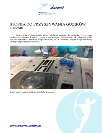 STOPKA DO PRZYSZYWANIA GUZIKÓW ŁUCZNIK Stopka ułatwia przyszywanie różnej wielkości guzików do materiału. Przyszywanie guzików wykonujemy ściegiem zyg-zag z wyłączonymi (schowanymi) lub zakrytymi płytką ząbkami transportera. Szerokość ściegu ustawiamy na „0”, natomiast długość ściegu ustawiamy według odległości rozstawu dziurek. Stopkę należy założyć niebieską końcówką do przodu. www.galerialucznik.pl Pod stopkę podkładamy materiał z zaznaczonym miejscem przyszycia guzika oraz guzik tak, aby dziurki znalazły się pomiędzy niebieskimi wypustkami w stopce. Wypustki te są wykonane z gumy dzięki temu stabilnie przytrzymują guzik, żeby się nie przesuwał podczas szycia. Po umieszczeniu guzika pod stopką należy opuścić stopkę za pomocą dźwigni podnoszenia i opuszczania stopki. Następnie kołem ręcznym musimy wymierzyć (dopasować) odległość między dziurkami i ustawić odpowiednią długość szycia. Teraz możemy zaryglować już mechanicznie kilkakrotnie przeszywając ściegiem zyg-zag guzik do materiału. www.galerialucznik.pl Po przyszyciu guzik wyjmujemy spod stopki i przycinamy nitki i gotowe. Przyszywanie guzika z czterema dziurkami należy zacząć od frontowych dziurek, a następnie na znajdujących się z tyłu. Jeżeli chcemy przyszyć guzik do grubszego materiału na tak zwanej stopce to należy umieścić igłę do cerowania lub szpilkę na guzik pomiędzy dziurkami. www.galerialucznik.pl