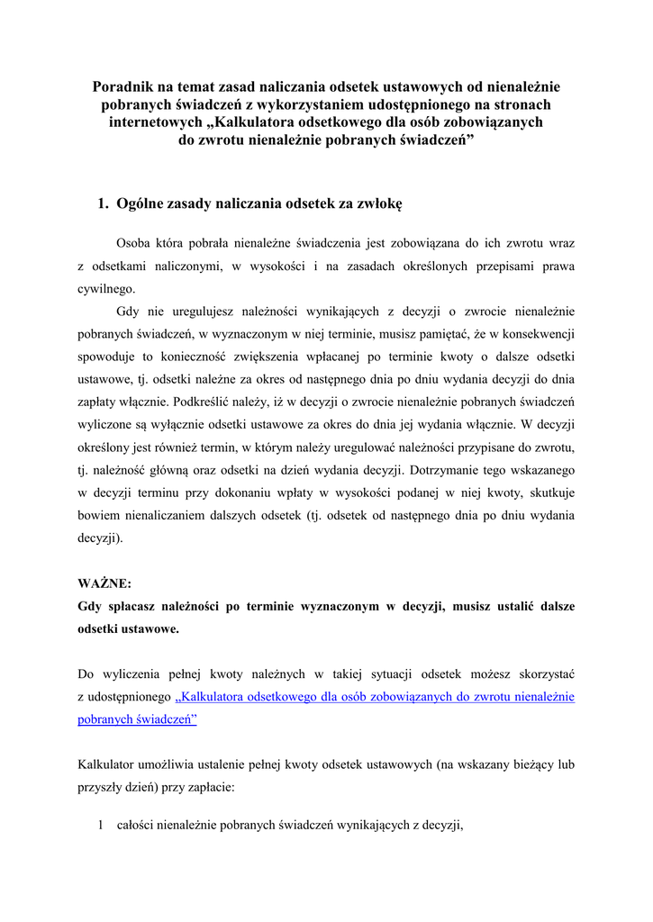 Poradnik na temat zasad naliczania odsetek ustawowych od nienależnie pobranych świadczeń z wykorzystaniem udostępnionego na stronach internetowych „Kalkulatora odsetkowego dla osób zobowiązanych do zwrotu nienależnie pobranych świadczeń” 1. Ogólne zasady naliczania odsetek za zwłokę Osoba która pobrała nienależne świadczenia jest zobowiązana do ich zwrotu wraz z odsetkami naliczonymi, w wysokości i na zasadach określonych przepisami prawa cywilnego. Gdy nie uregulujesz należności wynikających z decyzji o zwrocie nienależnie pobranych świadczeń, w wyznaczonym w niej terminie, musisz pamiętać, że w konsekwencji spowoduje to konieczność zwiększenia wpłacanej po terminie kwoty o dalsze odsetki ustawowe, tj. odsetki należne za okres od następnego dnia po dniu wydania decyzji do dnia zapłaty włącznie. Podkreślić należy, iż w decyzji o zwrocie nienależnie pobranych świadczeń wyliczone są wyłącznie odsetki ustawowe za okres do dnia jej wydania włącznie. W decyzji określony jest również termin, w którym należy uregulować należności przypisane do zwrotu, tj. należność główną oraz odsetki na dzień wydania decyzji. Dotrzymanie tego wskazanego w decyzji terminu przy dokonaniu wpłaty w wysokości podanej w niej kwoty, skutkuje bowiem nienaliczaniem dalszych odsetek (tj. odsetek od następnego dnia po dniu wydania decyzji). WAŻNE: Gdy spłacasz należności po terminie wyznaczonym w decyzji, musisz ustalić dalsze odsetki ustawowe. Do wyliczenia pełnej kwoty należnych w takiej sytuacji odsetek możesz skorzystać z udostępnionego „Kalkulatora odsetkowego dla osób zobowiązanych do zwrotu nienależnie pobranych świadczeń” Kalkulator umożliwia ustalenie pełnej kwoty odsetek ustawowych (na wskazany bieżący lub przyszły dzień) przy zapłacie: 1 całości nienależnie pobranych świadczeń wynikających z decyzji, w tym przypadku kalkulator nalicza dalsze odsetki ustawowe za okres po wydaniu decyzji i określa (poprzez sumowanie kwoty nienależnie pobranych świadczeń, odsetek ustawowych z decyzji i dalszych odsetek ustawowych) łączną kwotę do zapłaty. 2 części spłacanych nienależnie pobranych świadczeń (w tej sytuacji musisz dodatkowo wskazać kwotę spłacanej części nienależnie pobranych świadczeń), w tym przypadku kalkulator umożliwia ustalenie (w odpowiedniej proporcji): 1) podziału odsetek ustawowych z decyzji przypadających na wskazaną do spłaty kwotę nienależnie pobranych świadczeń, 2) dalszych odsetek za zwłokę od wskazanej do spłaty części nienależnie pobranych świadczeń, 3) sumowanie części nienależnie pobranych świadczeń zadeklarowanej do spłaty, wyliczonej kwoty przypadającej na tę część nienależnie pobranych świadczeń odsetek ustawowych z decyzji oraz wyliczonej od zadeklarowanej do spłaty części nienależnie pobranych świadczeń – dalszych odsetek ustawowych do dnia zapłaty włącznie. Kwotę należnych odsetek ustawowych, możesz wyliczyć również bez wsparcia „Kalkulatora odsetkowego dla osób zobowiązanych do zwrotu nienależnie pobranych świadczeń”. Aby wyliczyć samodzielnie odsetki ustawowe musisz uwzględnić poniższe zasady. 2. Szczegółowe zasady obliczania oraz zaokrąglania ustawowych odsetek za zwłokę należnych od zwracanej kwoty nienależnie pobranych świadczeń Aby wyliczyć kwotę dalszych odsetek ustawowych (za okres od dnia następującego po dniu wydania decyzji do dnia zapłaty włącznie), musisz: ustalić liczbę dni zwłoki, którą liczymy od następnego dnia po dacie wydania decyzji o zwrocie nienależnie pobranych świadczeń do dnia, w którym dokonana zostanie wpłata włącznie, ustalić obowiązującą za poszczególne okresy zwłoki (od – do) stopę procentową odsetek ustawowych, określić wysokość spłacanej kwoty nienależnie pobranych świadczeń (całość, część), 2 określić datę zapłaty (bieżący lub przyszły dzień). Wyliczona kwota odsetek z dokładnością do 4 miejsc po przecinku, podlega zaokrągleniu zgodnie z zasadą matematyczną do grosza do dwóch miejsc po przecinku. Oznacza to, że końcówka (trzecia i czwarta cyfra po przecinku) wyliczonej kwoty poniżej 50 groszy jest pomijana, natomiast końcówka (trzecia i czwarta cyfra po przecinku) wyliczonej kwoty jest równa lub wyższa od 50 groszy podlega zaokrągleniu w górę. (np.: gdy wyliczone odsetki wyniosą 7,1144 zł lub 7,1149 zł, to po zaokrągleniu stanowią kwotę 7,11 zł, natomiast w przypadku, gdy wyliczone odsetki wyniosą 7,1150 zł bądź 7,1157 zł, wówczas po zaokrągleniu będzie to kwota 7,12 zł). Należy pamiętać, iż stopa procentowa odsetek ustawowych może ulec zmianie. Gdy za okres zwłoki obowiązuje więcej niż jedna stopa procentowa, odsetki należy obliczać odrębnie dla każdej obowiązującej stopy procentowej, za okres jej obowiązywania. Kwoty odsetek z każdego wyliczenia dla okresów obowiązywania kolejnych stóp procentowych z dokładnością do 4 miejsc po przecinku, podlegają zsumowaniu; następnie ich suma podlega zaokrągleniu do 0,01 zł, według ogólnej, podanej wyżej zasady matematycznej. Zestawienie wysokości obowiązujących stóp procentowych odsetek ustawowych 3. Algorytm naliczania odsetek ustawowych za okres od dnia następnego po dniu wydania decyzji Dalsze odsetki ustawowe, tj., za okres od dnia następnego po dniu wydania decyzji do dnia zapłaty włącznie oblicza się korzystając z wzoru: KO = KN x LDZ x SPOU 365 x 100 KO – kwota dalszych odsetek ustawowych; KN – kwota wpłaty przeznaczona na poczet nienależnie pobranego świadczenia LDZ – liczba dni zwłoki (liczona od następnego dnia po dniu wydania decyzji o zwrocie nienależnie pobranych świadczeń do dnia zapłaty włącznie (na poczet kwoty z KN) SPOU – obowiązująca w okresie zawartym w LDZ stopa procentowa odsetek ustawowych. 3 Wyliczoną kwotę „dalszych odsetek ustawowych” (KO), po jej za