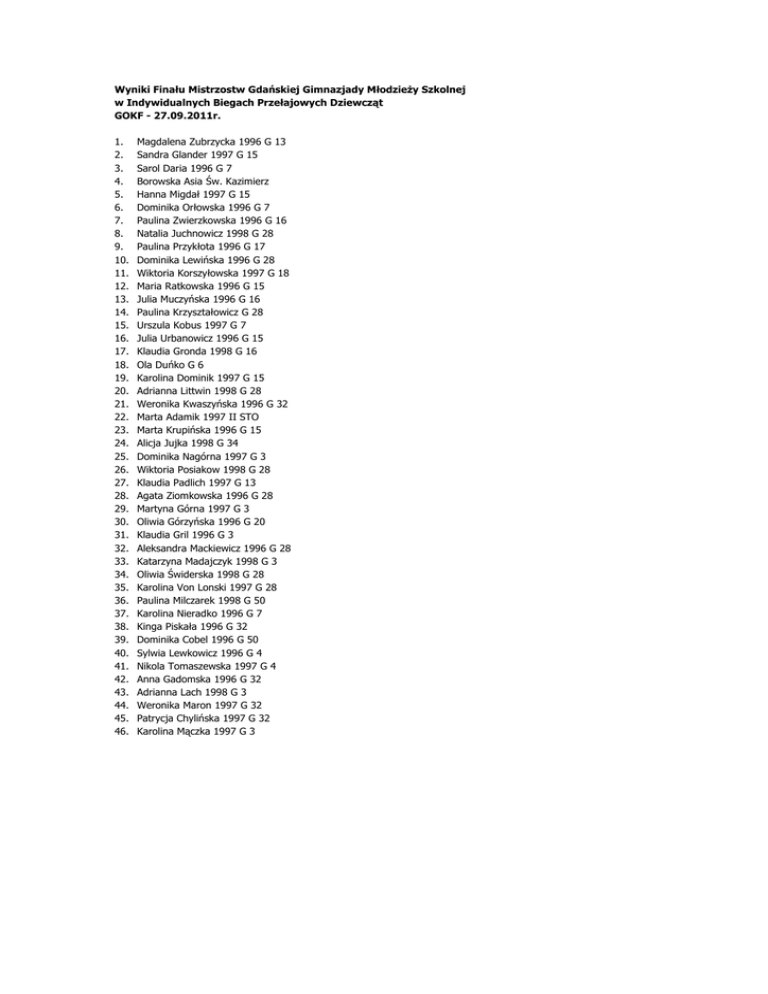 Wyniki Finału Mistrzostw Gdańskiej Gimnazjady Młodzieży Szkolnej w Indywidualnych Biegach Przełajowych Dziewcząt GOKF - 27.09.2011r. 1. 2. 3. 4. 5. 6. 7. 8. 9. 10. 11. 12. 13. 14. 15. 16. 17. 18. 19. 20. 21. 22. 23. 24. 25. 26. 27. 28. 29. 30. 31. 32. 33. 34. 35. 36. 37. 38. 39. 40. 41. 42. 43. 44. 45. 46. Magdalena Zubrzycka 1996 G 13 Sandra Glander 1997 G 15 Sarol Daria 1996 G 7 Borowska Asia Św. Kazimierz Hanna Migdał 1997 G 15 Dominika Orłowska 1996 G 7 Paulina Zwierzkowska 1996 G 16 Natalia Juchnowicz 1998 G 28 Paulina Przykłota 1996 G 17 Dominika Lewińska 1996 G 28 Wiktoria Korszyłowska 1997 G 18 Maria Ratkowska 1996 G 15 Julia Muczyńska 1996 G 16 Paulina Krzyształowicz G 28 Urszula Kobus 1997 G 7 Julia Urbanowicz 1996 G 15 Klaudia Gronda 1998 G 16 Ola Duńko G 6 Karolina Dominik 1997 G 15 Adrianna Littwin 1998 G 28 Weronika Kwaszyńska 1996 G 32 Marta Adamik 1997 II STO Marta Krupińska 1996 G 15 Alicja Jujka 1998 G 34 Dominika Nagórna 1997 G 3 Wiktoria Posiakow 1998 G 28 Klaudia Padlich 1997 G 13 Agata Ziomkowska 1996 G 28 Martyna Górna 1997 G 3 Oliwia Górzyńska 1996 G 20 Klaudia Gril 1996 G 3 Aleksandra Mackiewicz 1996 G 28 Katarzyna Madajczyk 1998 G 3 Oliwia Świderska 1998 G 28 Karolina Von Lonski 1997 G 28 Paulina Milczarek 1998 G 50 Karolina Nieradko 1996 G 7 Kinga Piskała 1996 G 32 Dominika Cobel 1996 G 50 Sylwia Lewkowicz 1996 G 4 Nikola Tomaszewska 1997 G 4 Anna Gadomska 1996 G 32 Adrianna Lach 1998 G 3 Weronika Maron 1997 G 32 Patrycja Chylińska 1997 G 32 Karolina Mączka 1997 G 3