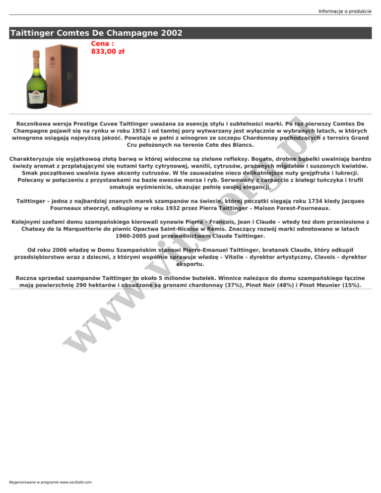Informacje o produkcie Taittinger Comtes De Champagne 2002 Cena : 833,00 zł pl Rocznikowa wersja Prestige Cuvee Taittinger uważana za esencję stylu i subtelności marki. Po raz pierwszy Comtes De Champagne pojawił się na rynku w roku 1952 i od tamtej pory wytwarzany jest wyłącznie w wybranych latach, w których winogrona osiągają najwyższą jakość. Powstaje w pełni z winogron ze szczepu Chardonnay pochodzących z terroirs Grand Cru położonych na terenie Cote des Blancs. or g. Charakteryzuje się wyjątkowoą złotą barwą w której widoczne są zielone refleksy. Bogate, drobne bąbelki uwalniają bardzo świeży aromat z przplatającymi się nutami tarty cytrynowej, wanilii, cytrusów, prażonych migdałów i suszonych kwiatów. Smak początkowo uwalnia żywe akcenty cutrusów. W tle zauważalne nieco delikatniejsze nuty grejpfruta i lukrecji. Polecany w połączeniu z przystawkami na bazie owoców morza i ryb. Serwowany z carpaccio z białegi tuńczyka i trufli smakuje wyśmienicie, ukazując pełnię swojej elegancji. Taittinger – jedna z najbardziej znanych marek szampanów na świecie, której początki sięgają roku 1734 kiedy Jacques Fourneaux stworzył, odkupiony w roku 1932 przez Pierra Taittinger – Maison Forest-Fourneaux. it o. Kolejnymi szefami domu szampańskiego kierowali synowie Pierra – Francois, Jean i Claude – wtedy też dom przeniesiono z Chateay de la Marquetterie do piwnic Opactwa Saint-Nicaise w Remis. Znaczący rozwój marki odnotowano w latach 1960-2005 pod przewodnictwem Claude Taittinger. w .v Od roku 2006 władzę w Domu Szampańskim stanowi Pierre-Emanuel Taittinger, bratanek Claude, który odkupił przedsiębiorstwo wraz z dziecmi, z którymi wspólnie sprawuje władzę – Vitalie – dyrektor artystyczny, Clavois – dyrektor eksportu. w w Roczna sprzedaż szampanów Taittinger to około 5 milionów butelek. Winnice należące do domu szampańskiego łączine mają powierzchnię 290 hektarów i obsadzone są gronami chardonnay (37%), Pinot Noir (48%) i Pinot Meunier (15%). Wygenerowano w programie www.oscGold.com