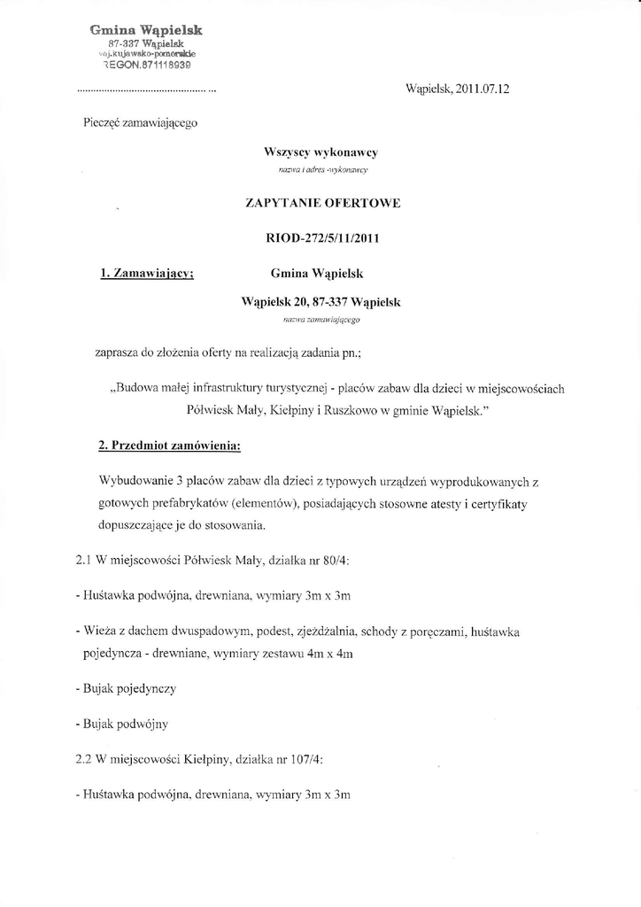 G'nina Wąpielslr' 87-337 Wąpielsk !.}j.kqiaw8ko_p@orrŁb 1EGON.871116039 Wąpielsk, 2011.07.12 Pieczęć zamawiaj ącego Wsryscy wykonawcy na^ta i adrcs rryko/tdttc.t, ZAPYTANIE OFERTOWE RIOD-2',12t5/tu20t1 1. Zamawiaiacyl Gmina Wąpielsk Wąpielsk 20' 87-337 Wąpielsk n a ^+, a z a m 6,1, i aj ąc e Eo zaprasza do złożenia olęrty na realizacjązadania pn; ,,Budowa małej infrastruktury turystycznej - placów zabaw dla dzieci w miejscowościach Póhłiesk Mały, Kiełpiny i Ruszkowo w gminie Wąpielsk.'' 2. Przedmiot zamówienia: Wybudowanie 3 placów zabaw dla dzieci z typowych urządzeń wyprodukowanych z gotowych plefabrykatów (elementów), posiadających stosowne atesty i cerlyfikaty dopuszczające je do stosowania. 2'1 W miejscowości Półwiesk MĄ' - Huśtawka podwójna, drewniana' działka rrr 80/4: wymialy 3m x 3m - WieŻa z dachem dwuspadowym, podęSt, zjeŹdża\nia, schody z poręczami, huśtawka pojedyncza - drewniane, wymiary zestawu 4m x 4m - Bujak pojedynczy - Bujak podwójny 2.2 W miejscowości Kiełpiny' działka nr 10714: - Huśtawka podwójna, drewniana, wymiary 3m x 3m - Wieża z dachem dwuspadowym wysoka' podest wysoki, podest, zjeżdża\nia mniejsza, zjeżdżalniaduża, drabina pozioma, most wiszący na łańcuchach, trap wejściowy 2m, schody z poręczarni, huśtawka podwójna - _ drewniane' wymiary Zestawu 12m x 1 1m Bujak poj edynczy - Buj ak podwójny 2.3 W miejscowości Ruszkowo, działka nr 21124: - Wieża z dachem dwuspadowym, podest, zjeżdżalnia,schody z poręczami, huśtawka pojedyncza - drewniane, wymiary zęstawu 4m x 4m Zamówienie obejmuje dostawę i montaż Wządzeń. Zamontowane urządzenia muszą Spełniaó wszystkie normy techniczne przewidziane polskim prawem dla tego typll vządzen oIaZ odpowiadaó przepisom dopuszczającym użylkowanie tego typu urządzę na terytorium polski. 3. 14 dni Termin realizacii i zamówienia: kalendarzowych od dnia podpisania umowy. 4. Termin zwiazania z oferta: Wykonawca jest zwia&any złoŻonąofertąprzez 30 dni. Bieg terminu, złvięania ofeftą Tozpoczynawtz z upłyrvem terminu składania ofert. 5 Kryteria wvboru ofertv: Najniższa cena brutto oferty spełniającej wszystkie wymagania Zamawiającego opisane w niniej szym Zaplaniu oferlowym. W przypadku złoŻenia takich samych ofert z najniższąceną brutto przez kilku Wykonawców Zanawiający wezwie tych Wykonawców do ńoŻęnia oferl dodatkowych, Montaż lrządzeń odbędzie się po uprzednim uzgodnieniu terminu - najpóŹniej 14 dni kalendarzowych od dnia podpisania umowy Z Zamawiającym. Utządzenia Zostanę ząmontowane w miejscu wskazanym przęz zamawiającego W obecności jego przedstawiciela z zachowaniem Zapisów punktu 2. Po tej czynności nastąpi podpisanie plotokołu odbioru, który będzie podstawą do ubiegania się przez zamadtającego zapłaty. 6 Składanie ofeń cześciowvch: Zamawiający nie dopuszcza składania olert częściowych. 7. Do Dorozumiewania si9 z wykonawcami upoważnione sa nastgpuiące osobv: Marcin Rempuszewski pokój nr 6 tel. (0-56) 49 38321 w 30 fax. (0-s6) 49 38322 w godz. 8oo-1400 e-mail : [email protected] 8. Sposób przygotowania oferty; Wykonawca obowiąa'ny jest przygotowaó oferlę zgodnie z wynaganiami Zap1.tania. ofertę naleĄ złoĄó w języku polskim z zachowaniem formy pisemnej pod rygorem nieważrości.oferta musi byó podpisana przez Wykonawcę lub upowaŹnionego przedstawiciela Wykonawcy. Ceny w ofercie musząbyó podane w źoĘ'chpolskich. 9. Mieisce i termin złożenia ofert: oferty naleŹy składaó osobiście,w siedzibię zamawiającego - Urząd Gminy w Wąlielsku, 87_ 337 Wąielsk, w pokoju 1 1 (sekretariat). oferty można także przesłać pocztą faksem lub przesłaÓ na adres e-mail podany w ofercie. o terminowości przesłania oferty decyduje wpływu do zamawiaj ącego. ostateczny temin składania ofęrt to do dnia 22 lipca 2011 r. do godz. 14:00 10' Do oferty należy załączyć: Wypełniony druk oferty, stanowiący Załącznik Nr 11. 1 do rriniejszego Zapytania ofer1owego. Załącznili : 1' Załącznik Nr 1 _ Druk oferly. G'nina Wąpielsk 87-3i17 Wqpielsh voJ.krłJa wsŁ(}.portrofakie Ż. ZałącznkNr 2 _ Przedmim 1E@ .871118s30 data