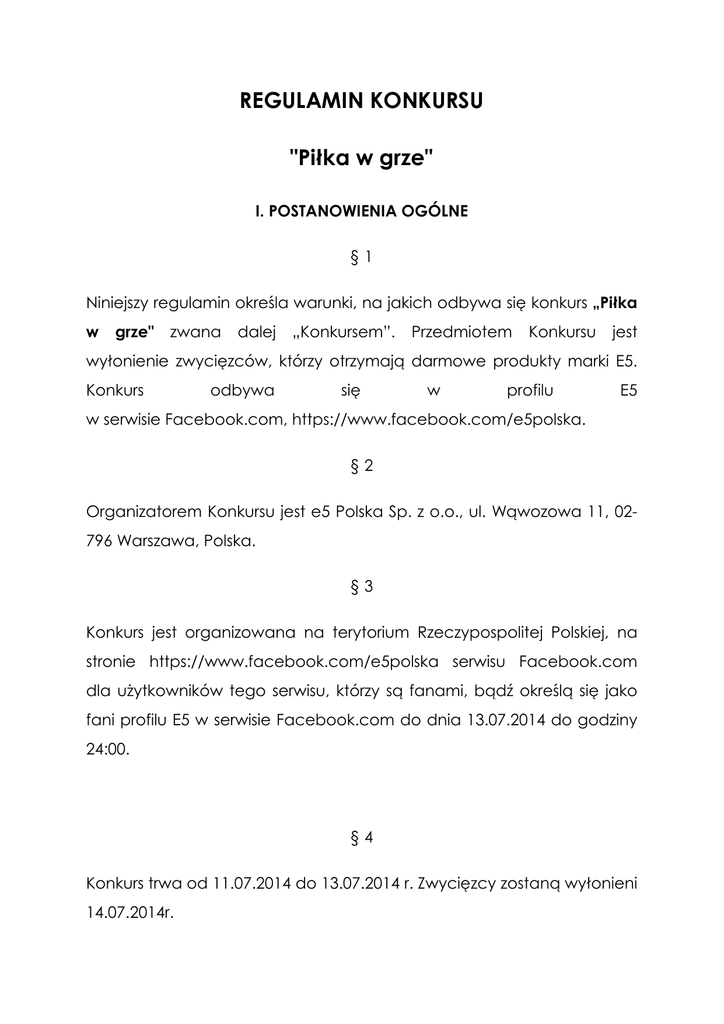 REGULAMIN KONKURSU "Piłka w grze" I. POSTANOWIENIA OGÓLNE §1 Niniejszy regulamin określa warunki, na jakich odbywa się konkurs „Piłka w grze" zwana dalej „Konkursem”. Przedmiotem Konkursu jest wyłonienie zwycięzców, którzy otrzymają darmowe produkty marki E5. Konkurs odbywa się w profilu E5 w serwisie Facebook.com, https://www.facebook.com/e5polska. §2 Organizatorem Konkursu jest e5 Polska Sp. z o.o., ul. Wąwozowa 11, 02796 Warszawa, Polska. §3 Konkurs jest organizowana na terytorium Rzeczypospolitej Polskiej, na stronie https://www.facebook.com/e5polska serwisu Facebook.com dla użytkowników tego serwisu, którzy są fanami, bądź określą się jako fani profilu E5 w serwisie Facebook.com do dnia 13.07.2014 do godziny 24:00. §4 Konkurs trwa od 11.07.2014 do 13.07.2014 r. Zwycięzcy zostaną wyłonieni 14.07.2014r. §5 Konkurs nie jest grą hazardową w rozumieniu ustawy z dnia 19 listopada 2009 r. o grach hazardowych (Dz.U.2009,Nr 201,poz.1540 ze zm.) i nie podlega rygorom określonym w ww. ustawie. Organizator jest przyrzekającym nagrodę w rozumieniu art. 919 kodeksu cywilnego. II. UCZESTNICY KONKURSU §6 Uczestnikami Konkursu mogą być osoby pełnoletnie, które są fanami profilu E5 na Facebooku, polubiły fanpage E5, zaprosiły swoich znajomych do wzięcia udziału w Konkursie oraz odpowiedziały na pytanie konkursowe. §7 Uczestnikami Konkursu nie mogą być pracownicy, ani osoby pozostające w stosunku zlecenia lub w innym stosunku prawnym, do którego stosuje się przepisy o zleceniu z Organizatorem Konkursu oraz członkowie rodzin wskazanych osób, do drugiego stopnia pokrewieństwa. §8 Administratorem danych osobowych Uczestników Konkursu jest Organizator. Dane będą przetwarzane zgodnie z ustawą z dnia 29 sierpnia 1997 r. o ochronie danych osobowych (t.j.Dz.U.2002r.,Nr 101, poz.926 z późn. zm.) w celach uczestnictwa i rozstrzygnięcia Konkursu, w tym realizacji Nagrody. Zasady przetwarzania danych osobowych określa Polityka prywatności. §9 Podanie danych, w tym danych osobowych, dla celów związanych z Konkursem jest dobrowolne,ale nie zbędne do wzięcia udziału w Konkursie. III. ZASADY I PRZEBIEG KONKURSU § 10 1. Nad prawidłowym przebiegiem Konkursu i przyznaniem nagród czuwają Osoby Odpowiedzialne powołane przez Organizatora (Jury). W skład Jury wchodzą 2 osoby ze strony e5 Poslska Sp. z o.o., ul. Wąwozowa 11, 02-796 Warszawa, Polska. 2. Konkurs ma jeden etap: od 11.07.2014 do 13.07.2014 zgłoś swój udział w Konkursie poprzez polubienie fanpage'a E5 w serwisie Facebook.com. Odpowiedz na pytanie konkursowe i polecaj Konkurs swoim znajomym i zachęcaj ich do wzięcia w niej udziału, promując Konkurs zwiększasz swoją szansę na zdobycie nagrody. Odpowiedź na pytanie konkursowe wyślij na adres [email protected] § 11 1. Aby przystąpić do Konkursu należy: mieć status fana profilu E5 w serwisie Facebook.com zapoznać się z Regulaminem Loterii, który znajduje się na stronie: www.e5.pl odpowiedzieć na pytanie konkursowe i wysłać odpowiedź na mail [email protected] udostępnić i zaprosić znajomych do wzięcia udziału w konkursie, przez co zwiększa się swoją szansę na wylosowanie nagrody. 2. Udział w Konkursie mają tylko fani E5 na Facebooku. 4. Celem postawionym przed uczestnikami Konkursu jest poprawna odpowiedź na pytanie konkursowe. 5. Nie wszyscy biorący udział w Konkursie zostaną nagrodzeni. 6. W Konkursie zostanie nagrodzonych 20 osób. Zwycięzcy zostaną wyłonieni 14.07.2014r do godziny 16:00 7. Warunkiem udziału w Konkursie jest polubienie fanpage'a E5 w serwisie Facebook.com, https://www.facebook.com/e5polska od 11.07.2014 r. od godz. 12.00 do 13.07. 2014 r. do godziny 24:00 oraz poprawna odpowiedź na pytanie konkursowe. 8. Zgłaszając się do Konkursu, Uczestnik oświadcza i potwierdza, że podane przez niego dane są prawdziwe i że nie używa on danych osobistych nie należących do niego. 9. Każdy z uczestników Konkursu może zgłosić się do Konkursu tylko raz. 10. Organizator zastrzega, że wszelkie formy nieuczciwej rywalizacji (m.in. spamowanie na stronach serwisu Facebook oraz innych serwisów internetowych), mające na celu mataczenie w konkursie, są zabronione. Tym samym, w uzasadnionych przypadkach, gdy któryś z Uczestników dopuści się takich praktyk, Organizator ma prawo usunąć jego zgłoszenie z Konkursu. 11. Rozstrzygnięcie Konkursu nastąpi 14.07.2014r. o godzinie 16:00. Zwycięzcy nagród o wygranej zostaną poinformowani drogą mailową na adres, który został podany w mailu zwrotnym z odpowiedzią na pytanie konkursowe. 12. Imiona i nazwiska laureatów (zgodnie z danymi udostępnionymi przez uczestników serwisowi Facebook.com) zostaną opublikowane w serwisie Facebook.com na profilu E5 przez Osoby Odpowiedzialne powołane przez Organizatora. 13. Laureaci Konkursu będą proszeni o podanie danych do wysyłki nagród drogą pocztową. Koszty wysyłki nagród ponosi Organizator. IV. NAGRODY § 12 W konkursie przewidziano następujące nagrody dla laureatów, o kolejności wręczania których zadecyduje jury konkursowe: produkty marki E5 W łącznej ilości minimum 20 sztuk. V. POSTANOWIENIA KOŃCOWE § 13 1. Zgłoszenie uczestnictwa w Konkursie oznacza wyrażenie przez Uczestnika Konkursie zgody na zamieszczenie niektórych danych wymienionych w § 9 (w szczególności imienia i nazwiska) we wszystkich materiałach, niezależnie od formy ich wyrażenia, mających za przedmiot propagowanie Konkursie oraz relacje z jego przebiegu na stronie https://www.facebook.com/e5polska przez czas określony przez Organizatora Konkursu. 2. Organizator zastrzega sobie prawo do zmiany zasad Konkursu nawet w trakcie jego trwania. Informacja o zmianach będzie umieszczona w profilu E5 w serwisie Facebook.com oraz na stronie internetowej www.e5.pl. Zmiany wchodzą w życie z dniem ich ogłoszenia na stronach internetowych. 3. Organizator nie ponosi kosztów związanych z dostarcze