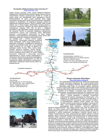 Europejski miêdzynarodowy szlak rowerowy R 1 www.euroroute-r1.de Czæúã Europy prowadzi przez powiat Märkisch-Oderland: Odkryjcie ten 130-kilometrowy odcinek miædzy Hönow / Erkner i Küstrin-Kietz! Ostatnie zlodowacenie 40.000 do 15.000 lat przed naszà erà uksztaùtowaùo profil geologiczny Marchii Nadodrzañskiej. W owym czasie powstaùy zùoýa wægla brunatnego na wyýynach i úlady erozji lodowcowej w pokùadach wapienia w Rüdersdorf. Po stopnieniu làdolodu wyùoniù siæ pagórkowaty krajobraz Barnim i Ziemi Lubuskiej. Masy wodne zebraùy siæ w niecce Ùægów Odrzañskich, tworzàc jezioro o znacznych rozmiarach, podobne do Jeziora Bodeñskiego. Po obwaùowaniu brzegów Odry 250 lat temu i nastæpnie zasiedleniu Ùægi Odrzañskie nabraùy zupeùnie innego oblicza. Na obszarze 32.500 ha powstaùa najwiæksza obwaùowana powierzchnia nizinna nad niemieckà rzekà. Miùoúników przyrody i poszukujàcych odpoczynek na trasie miædzy Berlinem i Odrà zapraszamy do krajobrazu lasów, jezior, alei i ùagodnych pagórków Szwajcarii Marchijskiej oraz na rozlegùe pola i nizinne tereny Ùægów Oder-Neiße-Radweg Odrzañskich. Fascynujàcy krajobraz oczarowaù Ostsee wiele osobistoúci, które swojà dziaùalnoúcià w n dziedzinie architektury, ksztaùtowania krajobrazu i ol i Seebad Ahlbeck W winouj cie rolnictwa pozostawiùy trwaùy úlad w tym regionie. Anklam Stettiner Zalew Haff Szlak rowerowy R1 na trasie od Berlina do Szczecinski Ueckermünde Naturpark polskiego miasta Gorzów Wlkp. moýna takýe Rieth “Am Stettiner Haff” okreúliã zielonym szlakiem „Grüne Route”, Rothenklempenow Pomorze Vorpommern Zachodnie bowiem zarówno na niemieckiej jak i na polskiej Löcknitz Szczecin stronie przebiega przez jedyny w swoim rodzaju naturalny krajobraz i rezerwaty przyrody. Penkun Niespotykanà w swoim rodzaju osobliwoúcià w Mescherin Gryfino Niemczech, która otwiera siæ przed zwiedzajùcym, Nationalpark Unteres Odertal Dolina Odry to kontrast miædzy kultywowanym od 250 lat Schwedt Krajnik Dln. (Oder) krajobrazem Ùægów Odrzañskich i zachowanà w Chojna Oderberg Cedynia pierwotnym naturalnym stanie Nizinà Warty na Osin w Dln. Hohenwutzen polskiej stronie. Mory Bad Freienwalde Park Neuhardenberg: Denkmal ed Us om Letschin: Schinkelturm undw Haffr eg Kontaktadresse: Arbeitsinitiative Letschin e. V. Bahnhofstraße 30 a, D-15324 Letschin Tel./Fax: 033475/ 57070 E-Mail: [email protected] Internet: www.oderbruch-warthe.de St. Petersburg e Od Tallinn r Oderbruch D bno ra Od Europafernradweg R1 Küstrin-Kietz Altlandsberg Strausberg Den Haag Brügge Münster Arnhem Höxter Berlin Calais Hönow Dessau Naturpark Märkische Schweiz Waldsieversdorf Rehfelde Kagel Erkner Seelow Neuhardenberg Buckow Lebus Tartu Riga Uj cie Warty Kostrzyn nad Odr Warta Gorzow G rzyca Ziemia Gorzowska Jarnatow Miechow Kaliningrad Klaipeda Grongow Pila Chelmno Czarnow Frankfurt Trebnitz (Oder) Oder-Spree Seengebiet S ubice Sulecin Osno Lubuskie Pojezierze Lubuskie Lubien Brzezno Cybinka Eisenhüttenstadt Neuzelle Kontaktadresse: www.oderneisse-radweg.de Tam, gdzie kiedyú úwiat siæ koñczyù, otwiera siæ dzisiaj przed Lubsko turystà rowerowym prawdziwy raj. Z korony grobli wzrok Forst Zasieki wiedzie po rozlegùych bùoniach. Na niebie ptaki drapieýne zataczajà swoje krægi, po soczystych ùàkach spacerujà Bad Muskau knica bociany. A jest to tylko jeden z wielu obrazów, jakie oferuje droga Weißwasser rowerowa Odra-Nysa. Wije siæ ona przez 591 kilometrów od Gór Oberlausitzer Heide- und Izerskich aý do Baùtyku i prowadzi przez miasta z wielkà Teichlandschaft Nizina przeszùoúcià i europejskà przyszùoúcià. Kto odpoczywa w tym l ska Niesky Oberlausitz regionie, znajdzie wiele moýliwoúci by spojrzeã na „tamtà Niederschlesien Görlitz Zgorzelec Luba stronæ” i szukaã spotkania z sàsiadem. Przeýyciem Ostritz przekroczenia granicy rozpoczyna siæ takýe trasa - przy zaùoýeniu, ýe wystartujecie Pañstwo od êródùa Nysy, w Zittau czeskiej Nowej Wsi. Co prawda, tutaj w Górach Izerskich i CHKO Jizersk hory w Górnoùuýyckim trójkàcie trzech pañstw nie macie Liberec Pañstwo jeszcze przed oczyma rozlegùych nadrzecznych Nova Ves CHKO Lu ick hory bùoni - za to spotkacie Pañstwo okazaùe lasy, wyýyny z zapierajàcymi dech widokami i ustronnie poùoýonymi górskimi miejscowoúciami. Kto pragnie poznaã bieg rzeki od êródùa aý do ujúcia, nie moýe ýyczyã sobie piækniejszego startu. Na dalszej drodze towarzyszàcej najpierw Nysie, potem Odrze dominujà pùaskie nadrzeczne krajobrazy o prawie dziewiczym charakterze. Znaczne odcinki trasy to obszary chronionej fauny i flory, jakiej prawie juý nigdzie indziej nie moýna spotkaã. Jeýeli w Parku Narodowym Dolnej Doliny Odry na chwilæ opuúcicie Pañstwo drogæ rowerowà, moýecie siæ poinformowaã w Centrum Parku Narodowego o ratowaniu przyrody. Park o romantycznym nastroju otworzy siæ przed Pañstwem w Bad Muskau: sùynny park krajobrazowy ksiæcia Pücklera, dwie trzecie którego leýà teraz na terytorium Polski. Ale przejúcie na jednà lub na drugà stronæ - to ýaden problem ani tutaj ani gdzie indziej. Wræcz przeciwnie: Zobaczcie Zgorzelec, polskà dzielnicæ miasta Görlitz lub Sùubice naprzeciwko Frankfurtu nad Odrà. Tu zadomowiùa siæ wspólna kultura, tu otwierajà siæ nowe horyzonty. Dopiero na Póùnocy, na Przedpomorzu, droga rowerowa Odra-Nysa odchodzi od biegu rzeki. Oczekujà Pañstwa spokojne leúne i polne drogi - a na Zalewie Szczeciñskim wielka przyjemnoúã kàpieli. Guben Gubin Wzniesienia Gubi skie Niederlausitz (Lausitz) -Bar e- Nysa Drei Eichen Königstraße 62, D-15377 Buckow Tel.: 033433/ 201, Fax: 033433/ 6815 E-Mail: [email protected] Internet: www.dreichen.de Droga rowerowa Odra-Nysa Odra Ratzdorf (Muzakow) (Bela Woda) Neiss e (Niska) St. Marienthal Park Narodowy Ujúcia Warty Naturpark Zittauer Gebirge Nysa Nationalpark Warthemündung Dom zu Gorzów