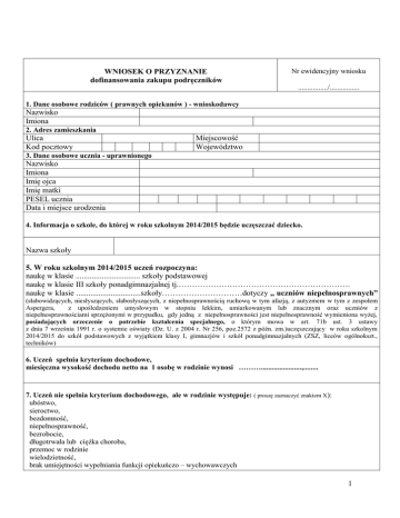 WNIOSEK O PRZYZNANIE dofinansowania zakupu podręczników Nr ewidencyjny wniosku ................/................ 1. Dane osobowe rodziców ( prawnych opiekunów ) - wnioskodawcy Nazwisko Imiona 2. Adres zamieszkania Ulica Kod pocztowy Miejscowość Województwo 3. Dane osobowe ucznia - uprawnionego Nazwisko Imiona Imię ojca Imię matki PESEL ucznia Data i miejsce urodzenia 4. Informacja o szkole, do której w roku szkolnym 2014/2015 będzie uczęszczać dziecko. Nazwa szkoły 5. W roku szkolnym 2014/2015 uczeń rozpoczyna: naukę w klasie ................................ szkoły podstawowej naukę w klasie III szkoły ponadgimnazjalnej tj.………………………………………………………. naukę w klasie ................................szkoły…………………………dotyczy ,, uczniów niepełnosprawnych” (słabowidzących, niesłyszących, słabosłyszących, z niepełnosprawnością ruchową w tym afazją, z autyzmem w tym z zespołem Aspergera, z upośledzeniem umysłowym w stopniu lekkim, umiarkowanym lub znacznym oraz uczniów z niepełnosprawnościami sprzężonymi w przypadku, gdy jedną z niepełnosprawności jest niepełnosprawność wymieniona wyżej, posiadających orzeczenie o potrzebie kształcenia specjalnego, o którym mowa w art. 71b ust. 3 ustawy z dnia 7 września 1991 r. o systemie oświaty (Dz. U. z 2004 r. Nr 256, poz.2572 z późn. zm.)uczęszczający w roku szkolnym 2014/2015 do szkół podstawowych z wyjątkiem klasy I, gimnazjów i szkół ponadgimnazjalnych (ZSZ, liceów ogólnokszt., techników) 6. Uczeń spełnia kryterium dochodowe, miesięczna wysokość dochodu netto na 1 osobę w rodzinie wynosi ………......................,........ 7. Uczeń nie spełnia kryterium dochodowego, ale w rodzinie występuje: ( proszę zaznaczyć znakiem X): ubóstwo, sieroctwo, bezdomność, niepełnosprawność, bezrobocie, długotrwała lub ciężka choroba, przemoc w rodzinie wielodzietność, brak umiejętności wypełniania funkcji opiekuńczo – wychowawczych 1 alkoholizm, narkomania, klęska żywiołowa lub ekologiczna zdarzenie losowe, sytuacja kryzysowa (wymienić jakie ? ) .................................................................................................................................... UZASADNIENIE .............................................................................................................................................................................................. .............................................................................................................................................................................................. .............................................................................................................................................................................................. .............................................................................................................................................................................................. .............................................................................................................................................................................................. .............................................................................................................................................................................................. .............................................................................................................................................................................................. ………………………………………………………………………………………………………………………….. 8. Wnioskowana forma pomocy - dofinansowanie zakupu podręczników tylko do kształcenia ogólnego, do kształcenia ogólnego i specjalnego, tylko do kształcenia specjalnego, materiałów edukacyjnch* Wyrażam zgodę na przetwarzanie danych osobowych wyłącznie dla potrzeb programu dofinansowania zakupu podręczników. …….......................….......................................... miejscowość, data ………………………………………................................................................. podpis rodzica ucznia (opiekuna prawnego) Oświadczenie o sytuacji rodzinnej i materialnej ucznia Dane dotyczące dochodów uzyskiwanych przez członków rodziny Oświadczam, że moja rodzina składa się z niżej wymienionych osób pozostających we wspólnym gospodarstwie domowym. Do niniejszego oświadczenia załączam odrębne zaświadczenia o dochodach dla każdej niżej wymienionej osoby lub zaświadczenie o korzystaniu ze świadczeń pieniężnych z pomocy społecznej. Dochód oblicza się w sposób wskazany w ustawie o pomocy społecznej (patrz objaśnienia). Stopień L.p Imię i nazwisko Miejsce pracy / nauki pokrewieństwa z Wysokość uzyskiwanego wnioskodawcą dochodu netto w zł 1. ……….………….…….. ……………..………….. …………………..… …………………….. ………………..….. ………….…….…………………… 2. ………………..……….. ………………..……….. …………………..… …………………….. …………………… ………………..…………………… 3. ………………..……….. ……………......……….. …………………..… …………………….. ……..…………….. ………………..…………………… 2 4. ………………………… ……………………..….. …………………..… …………………….. ……..…………….. ………………..…………………… 5. ……………..………….. ……………...…………. …………………..… …………………….. …..……………….. …………………..………………… ……………………