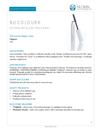 KARTA INFORMACYJNA PRODUKTU NU SKIN® KARTA INFORMACYJNA PRODUKTU NU SKIN® NU COLOUR® NUTRIOL® EYELASH TREATMENT 5 ml OPIS SYSTEMU OPIS PRODUKTU pozyskanego z wodorostów bogatego w polis lub jako baza pod tusz Nu Colour Curling Mascara. GRUPA DOCELOWA Przeznaczony ZALETY PRODUKTU Tricalgoxyl 1 www.nuskin.com KARTA INFORMACYJNA PRODUKTU NU SKIN® KARTA INFORMACYJNA PRODUKTU NU SKIN® Sposób stosowania: baza opakowania. CE Nu Colour Curling Mascara Black i rozmazywania. Nu Colour Defining Effects Smooth Eye Liner Nu Colour Desired Effects Eye Shadow nowoczesna maskara o zakrzywionej szczoteczce zaprojektowanej ich oddzielenia bez zlepiania a Smooth Eye Liner PYTANIA ze i grubsze. produkt lub jako baza pod tusz. Jako baza pokry wyspie Ouessant we Francji brunatnic. w nocy? je 2 www.nuskin.com KARTA INFORMACYJNA PRODUKTU NU SKIN® rises rises www.nuskin.com 3 PiP_NuColourNutriolEyelashTreatment_WEB_PL_EMEA_1607_INT © 2016 NSE Products, Inc. KARTA INFORMACYJNA PRODUKTU NU SKIN® Hamamelis Virginiana Water, Aqua, Butylene Glycol, PVP, Caprylyl Glycol, Ascophyllum Nodosum Extract, Saccharomyces/Zinc Ferment, Saccharomyces/Copper Ferment, Saccharomyces/Magnesium Ferment, Saccharomyces/Iron Ferment, Saccharomyces/Silicon Ferment, Sodium Nitrate, Polysorbate 20, Disodium EDTA, Citric Acid, Aminomethyl Propanol, Disodium Phosphate, Sodium Phosphate, Leuconostoc/Radish Root Ferment Filtrate, Phenoxyethanol, Potassium Sorbate, Sodium Benzoate, Glyoxal.