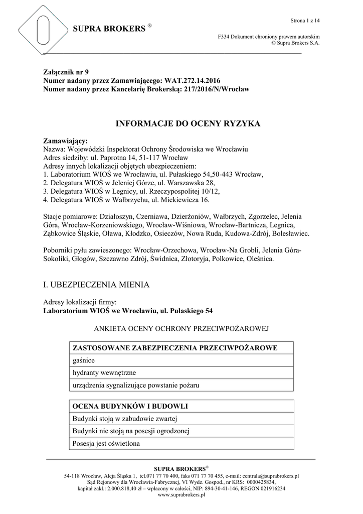 Strona 1 z 14 SUPRA BROKERS ® F334 Dokument chroniony prawem autorskim © Supra Brokers S.A. _____________________________________________________________________________ Załącznik nr 9 Numer nadany przez Zamawiającego: WAT.272.14.2016 Numer nadany przez Kancelarię Brokerską: 217/2016/N/Wrocław INFORMACJE DO OCENY RYZYKA Zamawiający: Nazwa: Wojewódzki Inspektorat Ochrony Środowiska we Wrocławiu Adres siedziby: ul. Paprotna 14, 51-117 Wrocław Adresy innych lokalizacji objętych ubezpieczeniem: 1. Laboratorium WIOŚ we Wrocławiu, ul. Pułaskiego 54,50-443 Wrocław, 2. Delegatura WIOŚ w Jeleniej Górze, ul. Warszawska 28, 3. Delegatura WIOŚ w Legnicy, ul. Rzeczypospolitej 10/12, 4. Delegatura WIOŚ w Wałbrzychu, ul. Mickiewicza 16. Stacje pomiarowe: Działoszyn, Czerniawa, Dzierżoniów, Wałbrzych, Zgorzelec, Jelenia Góra, Wrocław-Korzeniowskiego, Wrocław-Wiśniowa, Wrocław-Bartnicza, Legnica, Ząbkowice Śląskie, Oława, Kłodzko, Osieczów, Nowa Ruda, Kudowa-Zdrój, Bolesławiec. Poborniki pyłu zawieszonego: Wrocław-Orzechowa, Wrocław-Na Grobli, Jelenia GóraSokoliki, Głogów, Szczawno Zdrój, Świdnica, Złotoryja, Polkowice, Oleśnica. I. UBEZPIECZENIA MIENIA Adresy lokalizacji firmy: Laboratorium WIOŚ we Wrocławiu, ul. Pułaskiego 54 ANKIETA OCENY OCHRONY PRZECIWPOŻAROWEJ ZASTOSOWANE ZABEZPIECZENIA PRZECIWPOŻAROWE gaśnice hydranty wewnętrzne urządzenia sygnalizujące powstanie pożaru OCENA BUDYNKÓW I BUDOWLI Budynki stoją w zabudowie zwartej Budynki nie stoją na posesji ogrodzonej Posesja jest oświetlona SUPRA BROKERS® 54-118 Wrocław, Aleja Śląska 1, tel.071 77 70 400, faks 071 77 70 455, e-mail: [email protected] Sąd Rejonowy dla Wrocławia-Fabrycznej, VI Wydz. Gospod., nr KRS: 0000425834, kapitał zakł.: 2.000.818,40 zł – wpłacony w całości, NIP: 894-30-41-146, REGON 021916234 www.suprabrokers.pl Strona 2 z 14 SUPRA BROKERS ® F334 Dokument chroniony prawem autorskim © Supra Brokers S.A. _____________________________________________________________________________ Konstrukcja budynków: materiały mieszane Budynki są wykonane z płyt warstwowych z palnym wypełnieniem np. styropianem lub pianką poliuretanową. Ściany działowe wykonane są z: materiałów niepalnych Wystrój wnętrz budynków wykonany jest z materiałów: materiałów palnych, materiałów palnych zabezpieczonych ognioodpornie Obiekty posiadają wymaganą i sprawną instalację odgromową Istnieją centralne wyłączniki prądu odcinające dopływ energii do wszystkich urządzeń OCENA OCHRONY PRZECIWPOŻAROWEJ Odległość od najbliższej jednostki straży pożarnej- 2 km Czas dojazdu jednostek straży pożarnej- 15 min Istnieje możliwość dojazdu jednostek straży pożarnej o każdej porze roku Oznakowane są: drogi pożarowe drogi i wyjścia ewakuacyjne lokalizacje sprzętu ppoż. Budynki są wyposażone w sprzęt ratowniczo-gaśniczy zgodnie z wymaganiami Istnieje regulamin ppoż. Pracownicy przechodzą szkolenie na wypadek pożaru i prowadzenia akcji gaśniczej Na terenie zakładu istnieje zakaz palenia Zatrudniony jest specjalista z zakresu ochrony ppoż. Prowadzi się kontrole sprzętu ratowniczo-gaśniczego Źródła dostarczenia wody (proszę wymienić) WODOCIĄG MIEJSKI INFORMACJE DODATKOWE 1 2 3 TAK NIE Wykazane w arkuszu technicznym lokalizacje znajdują się na terenie X zalewowym Na terenie wymienionych w arkuszu technicznym lokalizacji począwszy od X 1997 r. wystąpiła powódź W odniesieniu do obiektów posiadających w swej konstrukcji elementy TAK drewniane – instalacja elektryczna prowadzona jest w niepalnych peszlach SUPRA BROKERS® 54-118 Wrocław, Aleja Śląska 1, tel.071 77 70 400, faks 071 77 70 455, e-mail: [email protected] Sąd Rejonowy dla Wrocławia-Fabrycznej, VI Wydz. Gospod., nr KRS: 0000425834, kapitał zakł.: 2.000.818,40 zł – wpłacony w całości, NIP: 894-30-41-146, REGON 021916234 www.suprabrokers.pl Strona 3 z 14 SUPRA BROKERS ® F334 Dokument chroniony prawem autorskim © Supra Brokers S.A. _____________________________________________________________________________ 4 5 6 7 8 W odniesieniu do obiektów zawierających w konstrukcji elementy drewniane – elementy te zostały zaimpregnowane ognioochronnie (impregnacja wykonana przez wyspecjalizowane firmy posiadające odpowiednie certyfikaty) Mienie będące przedmiotem ubezpieczenia lub pozostające w związku z ubezpieczeniem odpowiedzialności cywilnej jest zabezpieczone w sposób przewidziany obowiązującymi przepisami aktów prawnych w zakresie ochrony przeciwpożarowej, w szczególności: Ustawą z dnia 24.08.1991 r. o ochronie przeciwpożarowej (Dz.U. z 2009 r. Nr 178 poz. 1380 z późn. zm.) Rozporządzeniem Ministra Infrastruktury z dnia 12.04.2002 r. w sprawie warunków technicznych, jakimi powinny odpowiadać budynki i ich usytuowanie (Dz.U. z 2015 r. poz. 1422) Rozporządzeniem Ministra Spraw Wewnętrznych i Administracji z dnia 7.06.2010 r. w sprawie ochrony przeciwpożarowej budynków, innych obiektów budowlanych i terenów (Dz.U z 2010 r. Nr 109 poz. 719) Stanowiska pracy spełniają wymagania dotyczące bezpieczeństwa i higieny pracy w środowisku pracy, w szczególności zapisane w Rozporządzeniu Ministra Gospodarki z dnia 8.07.2010 r. w sprawie minimalnych wymagań, dotyczących bezpieczeństwa i higieny pracy, związanych z możliwością wystąpienia w miejscu pracy atmosfery wybuchowej (Dz.U. z 2010 r. Nr 138 poz. 931) Obiekty budowlane są użytkowane i utrzymywane zgodnie z przepisami Ustawy z dnia 7.07.1994 r. Prawo budowlane (Dz.U. z 2013 r. poz. 1409 z późn. zm.) Obiekty budowlane oraz wykorzystywane instalacje techniczne podlegają regularnym przeglądom okresowym stanu technicznego i/lub dozorowi technicznemu, wykonywanym przez uprawnione podmioty. W protokołach z dokonanych przeglądów nie stwierdzono zastrzeżeń warunkujących ich użytkowanie. W szczególności przeglądy okresowe dotyczą: przydatności do użytkowania obiek