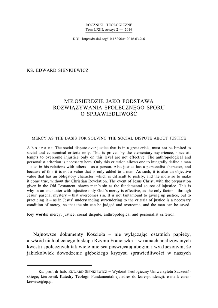 ROCZNIKI TEOLOGICZNE Tom LXIII, zeszyt 2 — 2016 DOI: http://dx.doi.org/10.18290/rt.2016.63.2-6 KS. EDWARD SIENKIEWICZ MIŁOSIERDZIE JAKO PODSTAWA ROZWIAZYWANIA ˛ SPOŁECZNEGO SPORU O SPRAWIEDLIWOŚĆ MERCY AS THE BASIS FOR SOLVING THE SOCIAL DISPUTE ABOUT JUSTICE A b s t r a c t. The social dispute over justice that is in a great crisis, must not be limited to social and economical criteria only. This is proved by the elementary experience, since attempts to overcome injustice only on this level are not effective. The anthropological and personalist criterion is necessary here. Only this criterion allows one to integrally define a man – also in his relations with others – as a person. Also justice has a personalist character, and because of this it is not a value that is only added to a man. As such, it is also an objective value that has an obligatory character, which is difficult to justify, and the more so to make it come true, without the Christian Revelation. The event of Jesus Christ, with the preparation given in the Old Testament, shows man’s sin as the fundamental source of injustice. This is why in an encounter with injustice only God’s mercy is effective, as the only factor – through Jesus’ paschal mystery – that overcomes sin. It is not tantamount to giving up justice, but to practicing it – as in Jesus’ understanding surrendering to the criteria of justice is a necessary condition of mercy, so that the sin can be judged and overcome, and the man can be saved. Key words: mercy, justice, social dispute, anthropological and personalist criterion. Najnowsze dokumenty Kościoła – nie wyłaczaj ˛ ac ˛ ostatnich papieży, a wśród nich obecnego biskupa Rzymu Franciszka – w ramach analizowanych kwestii społecznych tak wiele miejsca poświe˛caja˛ ubogim i wykluczonym, że jakiekolwiek dowodzenie głe˛bokiego kryzysu sprawiedliwości w naszych Ks. prof. dr hab. EDWARD SIENKIEWICZ − Wydział Teologiczny Uniwersytetu Szczecińskiego; kierownik Katedry Teologii Fundamentalnej; adres do korespondencji: e-mail: [email protected] KS. EDWARD SIENKIEWICZ 116 czasach wydaje sie˛ zbe˛dne. Można wprawdzie dyskutować na temat samego poje˛cia sprawiedliwości; jak ja˛ rozumieć i do jakiej w tym celu odwoływać sie˛ tradycji. I dyskusje takie nie sa˛ tylko hipotetyczne. W wielu miejscach przekształcaja˛ sie˛ nawet w burzliwe spory. Trudno to postrzegać inaczej jak dość niewyszukana˛ próbe˛ zwalniania z odpowiedzialności w obliczu jaskrawej niesprawiedliwości, niezależnie – jak sie˛ okazuje – od poste˛pu oraz poziomu życia współczesnych społeczeństw i pomimo – co musi dziwić, a przynajmniej powinno niepokoić – wielu starań podejmowanych w celu przezwycie˛żenia niesprawiedliwości czy choćby jej zmniejszenia. Zakładajac ˛ klasyczna˛ definicje˛ sprawiedliwości, odwołujac ˛ a˛ sie˛ do filozofii starogreckiej, zgodnie z która˛ postapić ˛ sprawiedliwie znaczy oddać każdemu to, co mu sie˛ słusznie należy, wszelkie próby kontestowania jej lub poszukiwania innej interpretacji traktujemy jako zabarwione ideologicznie. Wystarczy w tym miejscu wspomnieć kolektywistyczne rozumienie sprawiedliwości społecznej, czy też podyktowane liberalna˛ koncepcja˛ społeczeństwa. Szczegółowe analizowanie tego problemu, choćby ze wzgle˛du na bardzo bogata˛ literature˛ i dość powszechna˛ znajomość, wolno – jak sie˛ wydaje – uznać za zbe˛dne. Niezależnie bowiem od ilości wydrukowanych stron i poświe˛conej temu zagadnieniu energii, w dwóch, wzmiankowanych koncepcjach, wspomniany kryzys sprawiedliwości nie tylko nie został przezwycie˛żony, ale w wielu obszarach jeszcze sie˛ pogłe˛bił, przybierajac ˛ nowe, złowrogie oblicze1. W takiej sytuacji trudno pominać ˛ pytanie o właściwa˛ nature˛ niesprawiedliwości, z którym to pytaniem wiaże ˛ sie˛ także potrzeba zastanowienia sie˛ nad jej przyczynami. Naturalnie mieści sie˛ w tym pytaniu także kwestia interpretacji oraz oceny, niejednokrotnie złożonych procesów, mimo że w swoich skutkach dość prostych, jeśli chodzi o doświadczenie niesprawiedliwości i poczucie krzywdy. Przede wszystkim jednak błe˛dnego rozumienia sprawiedliwości i jej niewystarczalności zawłaszcza tam, gdzie sie˛ ja˛ rozumie zbyt jednostronnie, na co zwraca uwage˛ papież Franciszek ogłaszajac ˛ nadzwyczajny Jubileusz Miłosierdzia i ukazujac ˛ miłosierdzie jako wypełnienie i zarazem podstawe˛ sprawiedliwości2. 1 FRANCISZEK, Adhortacja apostolska Evangelii gaudium, Watykan 2013, nr 53-57. „Nie be˛dzie bezużyteczne w tym kontekście opisanie relacji pomie˛dzy sprawiedliwościa˛ a miłosierdziem. Nie sa˛ to dwa aspekty sobie przeciwne, ale dwa wymiary tej samej rzeczywistości, która rozwija sie˛ stopniowo, aż do osiagnie ˛ ˛ cia swego szczytu w pełni miłości”. FRANCISZEK, Misericordiae vultus. Bulla ustanawiajaca ˛ nadzwyczajny Jubileusz Miłosierdzia, Watykan 2015. 2 MIŁOSIERDZIE JAKO PODSTAWA ROZWIAZYWANIA ˛ SPORU O SPRAWIEDLIWOŚĆ 117 1. FAŁSZYWA DIAGNOZA Chcac ˛ dokonać oceny najbardziej rozpowszechnionych sposobów interpretacji niesprawiedliwości społecznej oraz przeciwdziałania jej, musimy wkroczyć na grunt ekonomii i socjologii. Wiaże ˛ sie˛ to z dodatkowymi trudnościami wynikajacymi ˛ z właściwej im metodologii i tradycji, z których należy zdawać sobie sprawe˛, podobnie jak z braku kompetencji w rozstrzyganiu na ich gruncie złożonych, właściwych tym dziedzinom problemów. Nie znaczy to jednak, że na gruncie chrześcijańskiej refleksji wiary jesteśmy całkowicie pozbawieni możliwości formułowania sadów ˛ na ten temat i zajmowania stanowiska. Do tego problemu odnosi sie˛ choćby papież Franciszek, szanujacy ˛ metodologiczna˛ odmienność zagadnień społecznych oraz ich nature˛ w spotkaniu z teologia, ˛ jednak domagajacy ˛ sie˛ od duszpasterzy i teologów społecznego zaangażowania,
