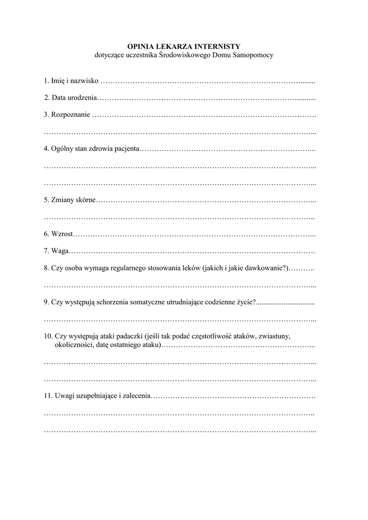 OPINIA LEKARZA INTERNISTY dotyczące uczestnika Środowiskowego Domu Samopomocy 1. Imię i nazwisko ………………………………………………………………………........ 2. Data urodzenia……………………………………………………………………….......... 3. Rozpoznanie ………………………………………………………………………………. ………………………………………………………………………………………………... 4. Ogólny stan zdrowia pacjenta……………………………………………………………... ………………………………………………………………………………………………... ………………………………………………………………………………………………... 5. Zmiany skórne……………………………………………………………………………... ……………………………………………………………………………………………….. 6. Wzrost……………………………………………………………………………………... 7. Waga………………………………………………………………………………………. 8. Czy osoba wymaga regularnego stosowania leków (jakich i jakie dawkowanie?)……….. ………………………………………………………………………………………………... 9. Czy występują schorzenia somatyczne utrudniające codzienne Ŝycie?................................ ………………………………………………………………………………………………... 10. Czy występują ataki padaczki (jeśli tak podać częstotliwość ataków, zwiastuny, okoliczności, datę ostatniego ataku)……………………………………………………... ………………………………………………………………………………………………... ………………………………………………………………………………………………... 11. Uwagi uzupełniające i zalecenia…………………………………………………………. ……………………………………………………………………………………………….. ………………………………………………………………………………………………... 12. Konsultacje specjalistyczne (jakie?)……………………………………………………... ………………………………………………………………………………………………... 13. Czy stan zdrowia pacjenta pozwala na uczestniczenie w zajęciach grupowych w ŚDS? TAK ……………………… (miejscowość i data) NIE …………………………. (pieczęć i podpis lekarza)
