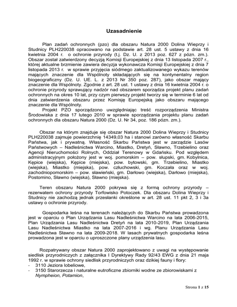 Uzasadnienie Plan zadań ochronnych (pzo) dla obszaru Natura 2000 Dolina Wieprzy i Studnicy PLH220038 opracowano na podstawie art. 28 ust. 5 ustawy z dnia 16 kwietnia 2004 r. o ochronie przyrody (t.j. Dz. U. z 2013 poz. 627 z pózn. zm.). Obszar został zatwierdzony decyzją Komisji Europejskiej z dnia 13 listopada 2007 r., której aktualne brzmienie zawiera decyzja wykonawcza Komisji Europejskiej z dnia 7 listopada 2013 r. w sprawie przyjęcia siódmego zaktualizowanego wykazu terenów mających znaczenie dla Wspólnoty składających się na kontynentalny region biogeograficzny (Dz. U. UE. L. z 2013 Nr 350 poz. 287), jako obszar mający znaczenie dla Wspólnoty. Zgodnie z art. 28 ust. 1 ustawy z dnia 16 kwietnia 2004 r. o ochronie przyrody sprawujący nadzór nad obszarem sporządza projekt planu zadań ochronnych na okres 10 lat, przy czym pierwszy projekt tworzy się w terminie 6 lat od dnia zatwierdzenia obszaru przez Komisję Europejską jako obszaru mającego znaczenie dla Wspólnoty. Projekt PZO sporządzono uwzględniając treść rozporządzenia Ministra Środowiska z dnia 17 lutego 2010 w sprawie sporządzania projektu planu zadań ochronnych dla obszaru Natura 2000 (Dz. U. Nr 34, poz. 186 pózn. zm.). Obszar na którym znajduje się obszar Natura 2000 Dolina Wieprzy i Studnicy PLH220038 zajmuje powierzchnię 14349,03 ha i stanowi zarówno własność Skarbu Państwa, jak i prywatną. Własność Skarbu Państwa jest w zarządzie Lasów Państwowych – Nadleśnictwa Warcino, Miastko, Dretyń, Sławno, Trzebielino oraz Agencji Nieruchomości Rolnych, Oddział Terenowy w Gdańsku. Pod względem administracyjnym położony jest w woj. pomorskim – pow. słupski, gm. Kobylnica, Kępice (wiejska), Kępice (miejska), pow. bytowski, gm. Trzebielino, Miastko (wiejska), Miastko (miejska), pow. człuchowski, gm. Koczała oraz w woj. zachodniopomorskim – pow. sławieński, gm. Darłowo (wiejska), Darłowo (miejska), Postomino, Sławno (wiejska), Sławno (miejska). Teren obszaru Natura 2000 pokrywa się z formą ochrony przyrody – rezerwatem ochrony przyrody Torfowisko Potoczek. Dla obszaru Dolina Wieprzy i Studnicy nie zachodzą jednak przesłanki określone w art. 28 ust. 11 pkt 2, 3 i 3a ustawy o ochronie przyrody. Gospodarka leśna na terenach należących do Skarbu Państwa prowadzona jest w oparciu o Plan Urządzania Lasu Nadleśnictwa Warcino na lata 2006-2015, Plan Urządzania Lasu Nadleśnictwa Dretyń na lata 2010-2019, Plan Urządzania Lasu Nadleśnictwa Miastko na lata 2007-2016 i wg. Planu Urządzania Lasu Nadleśnictwa Sławno na lata 2009-2018. W lasach prywatnych gospodarka leśna prowadzona jest w oparciu o uproszczone plany urządzenia lasu. Rozpatrywany obszar Natura 2000 zaprojektowano z uwagi na występowanie siedlisk przyrodniczych z załącznika I Dyrektywy Rady 92/43 EWG z dnia 21 maja 1992 r. w sprawie ochrony siedlisk przyrodniczych oraz dzikiej fauny i flory: - 3110 Jeziora lobeliowe, - 3150 Starorzecza i naturalne eutroficzne zbiorniki wodne ze zbiorowiskami z Nympheion, Potamion, Strona 1 z 15 - 3160 Naturalne, dystroficzne zbiorniki wodne, 3260 Nizinne i podgórskie rzeki ze zbiorowiskami włosieniczników Ranunculion fluitantis, 3270 Zalewane muliste brzegi rzek z roślinnością Chenopodion rubri p. p. i Bidention p. p. 4030 Suche wrzosowiska (Calluno-Genistion, Pohlio-Callunion, CallunoArctostaphylion) 6120 Ciepłolubne, śródlądowe murawy napiaskowe (Koelerion glaucae) 6150 Niżowe i górskie świeże łąki użytkowane ekstensywnie (Arrhenatherion elatioris), 6410 Zmiennowilgotne łąki trzęślicowe (Molinion) 6430 Ziołorośla górskie (Adenostylion alliariae) i ziołorośla nadrzeczne (Convolvuletalia sepium) 7110 Torfowiska wysokie z roślinnością torfotwórczą (żywe), 7140 Torfowiska przejściowe i trzęsawiska (przeważnie z roślinnością z Scheuchzerio-Caricetea), 7120 Torfowiska wysokie zdegradowane, lecz zdolne do naturalnej i stymulowanej regeneracji 7150 Obniżenia na podłożu torfowym z roślinnością ze związku Rhynchosporion 7220 Źródliska wapienne ze zbiorowiskami Cratoneurion commutati, 7230 Górskie i nizinne torfowiska zasadowe o charakterze młak, turzycowisk i mechowisk, 9110 Kwaśne buczyny (Luzulo-Fagenion), 9130 Żyzne buczyny (Dentario glandulosae-Fagenion, Galio odorati-Fagenion), 9160 Grąd subatlantycki (Stellario-Carpinetum), 91D0 Bory i lasy bagienne (Vaccinio uliginosi-Betuletum pubescentis, Vaccinio uliginosi-Pinetum, Pino mugo-Sphagnetum, Sphagno girgensohnii-Piceetum) i brzozowo-sosnowe bagienne lasy borealne. 91E0 Łęgi wierzbowe, topolowe, olszowe i jesionowe (Salicetum albo-fragilis, Populetum albae, Alnenion glutinoso-incanae), olsy źródliskowe 9190 Kwaśne dąbrowy (Quercion robori – petraeae) oraz gatunków z załącznika II ww. Dyrektywy: - 1096 minóg strumieniowy Lampetra planeri, - 1099 minóg rzeczny Lampetra fluviatilis, - 1106 łosoś atlantycki Salmo salar, - 5339 różanka Rhodeus sericeus amarus, - 1149 koza Cobitis taenia - 1163 głowacz białopłetwy Cottus gobio, - 1355 wydra Lutra Lutra, - 1166 traszka grzebieniasta Triturus cristatus, - 1188 kumak nizinny Bombina bombina, W trakcie opracowywania PZO podczas prac terenowych nie udało się odnaleźć gatunków: minoga rzecznego i łososia atlantyckiego. Dla tych gatunków, pomimo braku możliwości dokonania oceny stanu ochrony kierując się zasadą przezorności wskazano zagrożenia, a także działania ochronne – przyjmując że są one tożsame z zagrożeniami i działaniami ochronnymi dla pozostałych gatunków ryb i minoga, które udało się odnaleźć podczas prac terenowych. Po uzupełnieniu stanu Strona 2 z 15 wiedzy o gatunkach minoga rzecznego i łososia atlantyckiego zostaną one zweryfikowane. Z uwagi na brak odnalezienia w trakcie prac terenowych gatunków traszki grzebieniastej i kumaka nizinnego, ocenie stanu ochrony zostały poddane jedynie ich potencjalne siedliska. Dla siedlisk stanowiących siedlisko w/w p