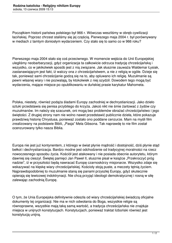 Rodzina katolicka - Religijny nihilizm Europy sobota, 13 czerwca 2009 15:13 Początkiem historii państwa polskiego był 966 r. Wówczas weszliśmy w obręb cywilizacji łacińskiej. Poprzez chrzest staliśmy się jej częścią. Pierwszego maja 2004 r. był porównywany w mediach z tamtym doniosłym wydarzeniem. Czy stało się to samo co w 966 roku? Pierwszego maja 2004 stało się coś przeciwnego. W momencie wejścia do Unii Europejskiej ulegliśmy neobarbaryzacji, gdyż organizacja ta całkowicie odrzuca tradycję chrześcijańską i wszystko, co w jakikolwiek sposób jest z nią związane. Jak słusznie zauważa Waldemar Łysiak, zastanawiającym jest fakt, iż walczy ona z chrześcijaństwem, a nie z religią w ogóle. Dzieje się tak, ponieważ sami chrześcijanie godzą się na to, aby opluwano ich religię. Muzułmanie są pewni własnej wiary i nie pozwalają, by ktokolwiek z niej szydził. Dowodem tego mogą być wydarzenia, mające miejsce po opublikowaniu w duńskiej prasie karykatur Mahometa. Polska, niestety, również podąża śladami Europy zachodniej w dechrystianizacji. Jako dzieło sztuki przedstawia się penisa przybitego do krzyża. Jakoś nikt nie śmie żartować z żydów czy muzułmanów. Im należy się szacunek, oni mogą bez problemów obrażać chrześcijaństwo i jego świętości. Z drugiej strony nam nie wolno nawet przedstawić publicznie dzieła, które pokazuje prawdziwą historię Chrystusa, ponieważ zostało ono poddane cenzurze. Mam na myśli film zrealizowany na podstawie Biblii, „Pasja” Mela Gibsona. Tak naprawdę to nie film został ocenzurowany tylko nasza Biblia. Europa nie jest już kontynentem, z którego w świat płynie mądrość i dostojność, dziś płynie stąd bełkot i dechrystianizacja. Bardzo modne jest odchodzenie od tradycyjnej moralności na rzecz nowoczesnego sposobu życia. Kościół jest atakowany i nie posiada obecnie autorytetu, którym dawniej się cieszył. Świętej pamięci Jan Paweł II, słusznie pisał w książce „Przekroczyć próg nadziei”, iż w przyszłości będą nawracać Europę czarnoskórzy misjonarze. Wszystko zdaje się wskazywać na klęskę wiary chrześcijańskiej. Kościoły stoją puste, a meczety tętnią życiem. Najprawdopodobniej to muzułmanie staną się panami przyszłej Europy, gdyż skutecznie opierają się lewicowej indoktrynacji. Nie chcą przyjąć ideologii demokratycznej i rosną w siłę zalewając zachodnią Europę. O tym, że Unia Europejska definitywnie odeszła od wiary chrześcijańskiej świadczą oficjalne dokumenty tej organizacji. Nie ma w nich odwołania do Boga, wszystkie religie są równoprawne, wszystkie mają taką samą wartość, a tradycja chrześcijańska nie znajduje miejsca w unijnych konstytucjach. Konstytucjach, ponieważ traktat lizboński również jest konstytucją unijną. 1/2 Rodzina katolicka - Religijny nihilizm Europy sobota, 13 czerwca 2009 15:13 Uwagę na tworzenie nowej religii zwraca Maciej Rybiński. W dzisiejszej Europie powstaje nowe wyznanie, to demokracja prawa człowieka i tolerancja wszystkiego co tylko się da. Dlatego chrześcijaństwo musi zostać usunięte ze świadomości przyszłych obywateli „Stanów Zjednoczonych Europy”. Gabriel Karczewski Źródło: Konserwatyzm.pl 2/2