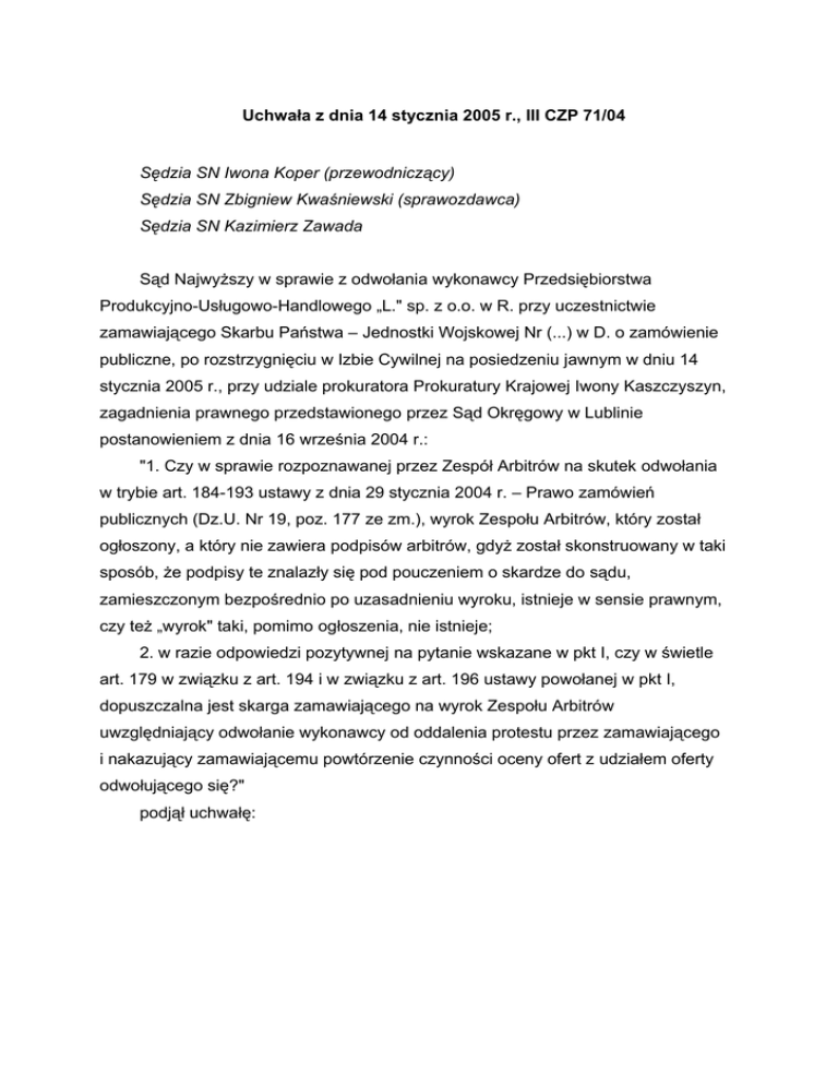 Uchwała z dnia 14 stycznia 2005 r., III CZP 71/04 Sędzia SN Iwona Koper (przewodniczący) Sędzia SN Zbigniew Kwaśniewski (sprawozdawca) Sędzia SN Kazimierz Zawada Sąd Najwyższy w sprawie z odwołania wykonawcy Przedsiębiorstwa Produkcyjno-Usługowo-Handlowego „L." sp. z o.o. w R. przy uczestnictwie zamawiającego Skarbu Państwa – Jednostki Wojskowej Nr (...) w D. o zamówienie publiczne, po rozstrzygnięciu w Izbie Cywilnej na posiedzeniu jawnym w dniu 14 stycznia 2005 r., przy udziale prokuratora Prokuratury Krajowej Iwony Kaszczyszyn, zagadnienia prawnego przedstawionego przez Sąd Okręgowy w Lublinie postanowieniem z dnia 16 września 2004 r.: "1. Czy w sprawie rozpoznawanej przez Zespół Arbitrów na skutek odwołania w trybie art. 184-193 ustawy z dnia 29 stycznia 2004 r. – Prawo zamówień publicznych (Dz.U. Nr 19, poz. 177 ze zm.), wyrok Zespołu Arbitrów, który został ogłoszony, a który nie zawiera podpisów arbitrów, gdyż został skonstruowany w taki sposób, że podpisy te znalazły się pod pouczeniem o skardze do sądu, zamieszczonym bezpośrednio po uzasadnieniu wyroku, istnieje w sensie prawnym, czy też „wyrok" taki, pomimo ogłoszenia, nie istnieje; 2. w razie odpowiedzi pozytywnej na pytanie wskazane w pkt I, czy w świetle art. 179 w związku z art. 194 i w związku z art. 196 ustawy powołanej w pkt I, dopuszczalna jest skarga zamawiającego na wyrok Zespołu Arbitrów uwzględniający odwołanie wykonawcy od oddalenia protestu przez zamawiającego i nakazujący zamawiającemu powtórzenie czynności oceny ofert z udziałem oferty odwołującego się?" podjął uchwałę: 1. Wyrok zespołu arbitrów podpisany przez arbitrów w sposób określony przepisami rozporządzenia Prezesa Rady Ministrów z dnia 30 marca 2004 r. w sprawie regulaminu postępowania przy rozpatrywaniu odwołań (Dz.U. Nr 56, poz. 547) spełnia wymagania formalne. 2. Zamawiającemu przysługuje legitymacja do wniesienia skargi do sądu na wyrok zespołu arbitrów. Uzasadnienie Przedstawione Sądowi Najwyższemu do rozstrzygnięcia zagadnienie prawne powstało w sprawie o zamówienie publiczne wszczętej wniesieniem przez zamawiającego skargi na wyrok zespołu arbitrów z dnia 14 czerwca 2004 r., którym uwzględniono odwołanie wykonawcy i nakazano zamawiającemu powtórzenie czynności oceny ofert z udziałem oferty odwołującego się. Przy rozpoznawaniu skargi zamawiającego Sąd Okręgowy powziął poważne wątpliwości prawne przedstawione Sądowi Najwyższemu do rozstrzygnięcia w zagadnieniu prawnym. (...) Sąd Najwyższy zważył, co następuje: Ocena spełniania wymogów formalnych przez wyrok zespołu arbitrów powołanych przez Prezesa Urzędu Zamówień Publicznych musi uwzględniać szczególny charakter unormowań zawartych w ustawie z dnia 29 stycznia 2004 r. – Prawo zamówień publicznych (Dz.U. Nr 19, poz. 177 ze zm. – dalej: „Pr.z.p.”). Unormowania te stanowią lex specialis w stosunku do przepisów kodeksu postępowania cywilnego; przepisy o sądzie polubownym w odniesieniu do postępowania odwoławczego i o apelacji w odniesieniu do postępowania toczącego się wskutek wniesienia skargi mają odpowiednie zastosowanie wówczas, jeżeli przepisy ustawy nie stanowią inaczej (art. 184 ust. 3 i art. 194 ust. 2 Pr.z.p.). W orzecznictwie podkreślono już, że wydany w postępowaniu odwoławczym wyrok zespołu arbitrów nie może być postrzegany jako forma orzeczenia w kategoriach zwykłego odpowiednika wyroku sądu państwowego, uzyska on bowiem moc prawną dopiero po zatwierdzeniu jego wykonalności przez sąd państwowy (uzasadnienie uchwały Sądu Najwyższego z dnia 6 listopada 2002 r., III CZP 68/02, OSNC 2003, nr 7-8, poz. 103). Skoro zatem wyrok zespołu arbitrów wykazuje raczej podobieństwo do wyroku sądu polubownego, to oceny wymogów formalnych w zakresie m.in. poszczególnych elementów i struktury tego wyroku należy przede wszystkim poszukiwać w przepisach Prawa zamówień publicznych i w przepisach aktu wykonawczego wydanego na mocy art. 193 pkt 1 tej ustawy, a nie w art. 328330 k.p.c., które przewidują m.in. że zarówno sentencja wyroku, jak i uzasadnienie podlegają odrębnemu podpisaniu. Przepisy Prawa zamówień publicznych nie zawierają szczególnej regulacji dotyczącej struktury wyroku zespołu arbitrów i miejsca złożenia na nim podpisów przez arbitrów. Odróżnia to Prawo zamówień publicznych od przepisów kodeksu postępowania cywilnego, na tle których rozwinęło się najnowsze orzecznictwo Sądu Najwyższego dotyczące wyroków i postanowień nieistniejących (uchwały Sądu Najwyższego z dnia 26 września 2000 r., III CZP 29/00, OSNC 2001, nr 2, poz. 25 i z dnia 13 marca 2002 r., III CZP 12/02, OSNC 2003, nr 2, poz. 17 oraz postanowienie Sądu Najwyższego z dnia 21 stycznia 2003 r., III CZP 84/02, OSNC 2003, nr 10, poz. 140). W świetle tych przepisów jest oczywiste, że sporządzenie i podpisanie sentencji orzeczenia oraz sporządzenie i podpisanie jego uzasadnienia stanowi dwie odrębne czynności procesowe, z których każda musi odpowiadać obowiązującym wymaganiom procesowym (uzasadnienie uchwały Sądu Najwyższego z dnia 13 marca 2002 r., III CZP 12/02). Jednakże w postępowaniu odwoławczym przed zespołem arbitrów w sprawie o zamówienie publiczne nie ma podstaw nawet do odpowiedniego zastosowania przepisów kodeksu postępowania cywilnego regulujących zasady sporządzania wyroku, art. 184 ust. 3 Pr.z.p. pozwala bowiem na odpowiednie zastosowanie jedynie przepisów tego kodeksu o sądzie polubownym, a więc przepisów zawartych w art. 705-715, a nie zamieszczonych w art. 316-332. Ponadto, nie ma w Prawie zamówień publicznych regulacji zasad sporządzania i wydawania wyroku przez zespół arbitrów. Brak ten został uzupełniony przepisami § 24-26 rozporządzenia Prezesa Rady Ministrów z dnia 30 marca 2004 r. w sprawie regulaminu postępowania przy rozpatrywaniu odwołań (Dz.U. Nr 56, 