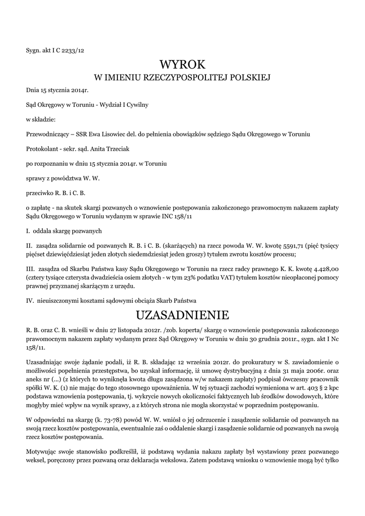 Sygn. akt I C 2233/12 WYROK W IMIENIU RZECZYPOSPOLITEJ POLSKIEJ Dnia 15 stycznia 2014r. Sąd Okręgowy w Toruniu - Wydział I Cywilny w składzie: Przewodniczący – SSR Ewa Lisowiec del. do pełnienia obowiązków sędziego Sądu Okręgowego w Toruniu Protokolant - sekr. sąd. Anita Trzeciak po rozpoznaniu w dniu 15 stycznia 2014r. w Toruniu sprawy z powództwa W. W. przeciwko R. B. i C. B. o zapłatę - na skutek skargi pozwanych o wznowienie postępowania zakończonego prawomocnym nakazem zapłaty Sądu Okręgowego w Toruniu wydanym w sprawie INC 158/11 I. oddala skargę pozwanych II. zasądza solidarnie od pozwanych R. B. i C. B. (skarżących) na rzecz powoda W. W. kwotę 5591,71 (pięć tysięcy pięćset dziewięćdziesiąt jeden złotych siedemdziesiąt jeden groszy) tytułem zwrotu kosztów procesu; III. zasądza od Skarbu Państwa kasy Sądu Okręgowego w Toruniu na rzecz radcy prawnego K. K. kwotę 4.428,00 (cztery tysiące czterysta dwadzieścia osiem złotych - w tym 23% podatku VAT) tytułem kosztów nieopłaconej pomocy prawnej przyznanej skarżącym z urzędu. IV. nieuiszczonymi kosztami sądowymi obciąża Skarb Państwa UZASADNIENIE R. B. oraz C. B. wnieśli w dniu 27 listopada 2012r. /zob. koperta/ skargę o wznowienie postępowania zakończonego prawomocnym nakazem zapłaty wydanym przez Sąd Okręgowy w Toruniu w dniu 30 grudnia 2011r., sygn. akt I Nc 158/11. Uzasadniając swoje żądanie podali, iż R. B. składając 12 września 2012r. do prokuratury w S. zawiadomienie o możliwości popełnienia przestępstwa, bo uzyskał informację, iż umowę dystrybucyjną z dnia 31 maja 2006r. oraz aneks nr (...) (z których to wyniknęła kwota długu zasądzona w/w nakazem zapłaty) podpisał ówczesny pracownik spółki W. K. (1) nie mając do tego stosownego upoważnienia. W tej sytuacji zachodzi wymieniona w art. 403 § 2 kpc podstawa wznowienia postępowania, tj. wykrycie nowych okoliczności faktycznych lub środków dowodowych, które mogłyby mieć wpływ na wynik sprawy, a z których strona nie mogła skorzystać w poprzednim postępowaniu. W odpowiedzi na skargę (k. 73-78) powód W. W. wniósł o jej odrzucenie i zasądzenie solidarnie od pozwanych na swoją rzecz kosztów postępowania, ewentualnie zaś o oddalenie skargi i zasądzenie solidarnie od pozwanych na swoją rzecz kosztów postępowania. Motywując swoje stanowisko podkreślił, iż podstawą wydania nakazu zapłaty był wystawiony przez pozwanego weksel, poręczony przez pozwaną oraz deklaracja wekslowa. Zatem podstawą wniosku o wznowienie mogą być tylko okoliczności odnoszące się do weksla lub deklaracji, a takowych pozwani w ogóle nie przedstawili. W sprawie nie zachodzi wymieniona w art. 403 § 2 kpc podstawa wznowienia postępowania, tj. wykrycie nowych okoliczności faktycznych lub środków dowodowych, które mogłyby mieć wpływ na wynik sprawy, a z których strona nie mogła skorzystać w poprzednim postępowaniu. Pozwani otrzymując nakaz zapłaty z dnia 30 grudnia 2011r. wraz z pozwem mogli podjąć niezwłocznie czynności zmierzające do wyjaśnienia czy weksel został wypełniony zgodnie z podpisaną przez nich deklaracją wekslową, tym bardziej, iż byli wcześniej wzywani do wykupu weksla. Pozwani jednak nie podjęli żadnych czynności w tym kierunku. Pozwani nie wykazali również, iż złożenie jako dowodu umowy z 2006r. i powiadomienie prokuratury o możliwości popełnienia przestępstwa nie mogło nastąpić w poprzednim postępowaniu, niezwłocznie po otrzymaniu nakazu zapłaty i zorientowaniu się o rzekomym przekroczeniu uprawnień przez swego pracownika. Podobnie ma się rzecz z niewykazaniem przez pozwanych żadnych dowodów na to, że wynik postępowania karnego przeciwko pracownikowi będzie miał jakikolwiek wpływ na prawidłowość wypełnienia weksla przez powoda. W ocenie powoda złożenie skargi obyło się z przekroczeniem trzymiesięcznego terminu z art. 407 § 1 kpc. Sam fakt złożenia zawiadomienia do prokuratury dopiero 12 września 2012r. nie dowodzi tego, iż pozwany faktycznie dopiero wtedy dowiedział się rzekomym przekroczeniu uprawnień przez swojego pracownika, tym bardziej, iż wcześniej otrzymał w/w nakaz zapłaty. Z powyższych względów złożona skarga winna – zdaniem powoda - zostać odrzucona. Uzasadniając ewentualne żądanie oddalenia skargi powód wskazał, iż dług objęty nakazem zapłaty wynika z weksla, a nie umowy dystrybucyjnej z dnia 31 maja 2006r. Poza tym umowa z 31 maja 2006r. nie obowiązywała miedzy stronami już od 2009r., jako że została zastąpiona umową handlową z dnia 1 listopada 2009r. Zatem przedstawiona przez pozwanych umowa dystrybucyjna z 2006r. pozostaje bez jakiegokolwiek znaczenia dla niniejszej sprawy. Co więcej – treść podpisanej przez pozwanych deklaracji wekslowej jednoznacznie wskazuje na to, że weksel został wystawiony na zabezpieczenie wszelkich roszczeń powoda wynikających z umów wcześniej z nim zawartych. Poza tym – podpisanie weksla przez pozwanych nastąpiło już po rozwiązaniu z pracownikiem W. K. (2) umowy o pracę. Zatem zobowiązanie wekslowe zaciągnął osobiście pozwany, potwierdzając jednocześnie obowiązywanie umowy miedzy jego spółką a powodem. Pismem z dnia 13 września 2013r. (k. 150-151) pełnomocnik skarżących poparł złożoną skargę. Zgłosił też zarzut niezgodnego z deklaracją wekslową wypełnienia weksla in blanco. Niezgodność ta – jego zdaniem - polegała na wpisaniu do weksla kwoty dotyczącej umów sprzedaży zawartych po 24 marca 2011r. (data wystawienia weksla i deklaracji wekslowej), gdy tymczasem deklaracja wekslowa odnosiła się jedynie do umów zawartych przed tą datą. Dodał, iż pozwani zaprzeczają, jakoby umowa z 31 maja 2006r. nie obowiązywała między stronami od 2009r. i została zastąpiona umową handlową z dnia 1 listopada 2009r. Pismem z dnia 21 października 2013r. (k. 180-186) powód podtrzymał swoje dotychc
