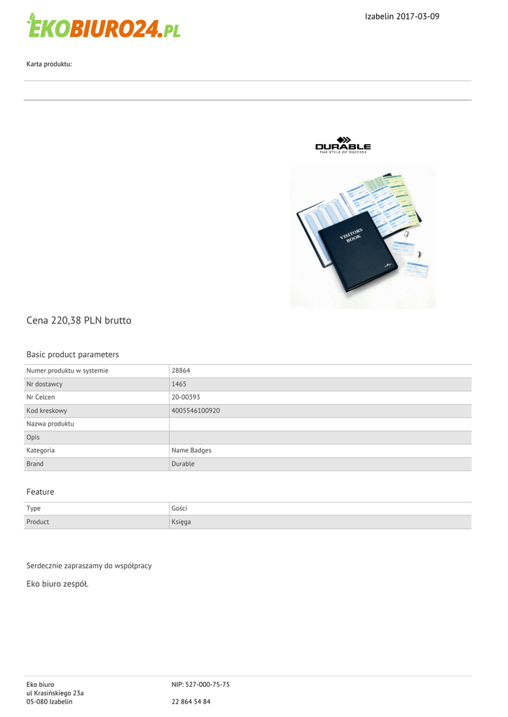 Izabelin 2017-03-09 Karta produktu: Cena 220,38 PLN brutto Basic product parameters Numer produktu w systemie 28864 Nr dostawcy 1465 Nr Celcen 20-00393 Kod kreskowy 4005546100920 Nazwa produktu Opis Kategoria Name Badges Brand Durable Feature Type Gości Product Księga Serdecznie zapraszamy do współpracy Eko biuro zespół. Eko biuro ul Krasińskiego 23a 05-080 Izabelin NIP: 527-000-75-75 22 864 54 84