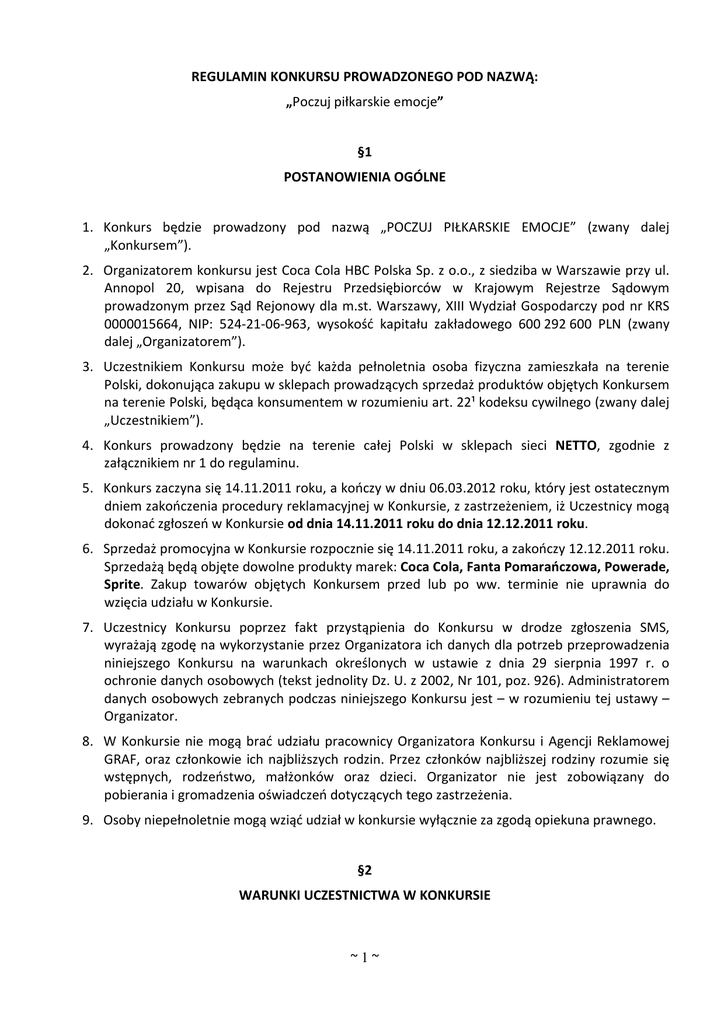 REGULAMIN KONKURSU PROWADZONEGO POD NAZWĄ: „Poczuj piłkarskie emocje” §1 POSTANOWIENIA OGÓLNE 1. Konkurs będzie prowadzony pod nazwą „POCZUJ PIŁKARSKIE EMOCJE” (zwany dalej „Konkursem”). 2. Organizatorem konkursu jest Coca Cola HBC Polska Sp. z o.o., z siedziba w Warszawie przy ul. Annopol 20, wpisana do Rejestru Przedsiębiorców w Krajowym Rejestrze Sądowym prowadzonym przez Sąd Rejonowy dla m.st. Warszawy, XIII Wydział Gospodarczy pod nr KRS 0000015664, NIP: 524-21-06-963, wysokość kapitału zakładowego 600 292 600 PLN (zwany dalej „Organizatorem”). 3. Uczestnikiem Konkursu może być każda pełnoletnia osoba fizyczna zamieszkała na terenie Polski, dokonująca zakupu w sklepach prowadzących sprzedaż produktów objętych Konkursem na terenie Polski, będąca konsumentem w rozumieniu art. 22¹ kodeksu cywilnego (zwany dalej „Uczestnikiem”). 4. Konkurs prowadzony będzie na terenie całej Polski w sklepach sieci NETTO, zgodnie z załącznikiem nr 1 do regulaminu. 5. Konkurs zaczyna się 14.11.2011 roku, a kończy w dniu 06.03.2012 roku, który jest ostatecznym dniem zakończenia procedury reklamacyjnej w Konkursie, z zastrzeżeniem, iż Uczestnicy mogą dokonać zgłoszeń w Konkursie od dnia 14.11.2011 roku do dnia 12.12.2011 roku. 6. Sprzedaż promocyjna w Konkursie rozpocznie się 14.11.2011 roku, a zakończy 12.12.2011 roku. Sprzedażą będą objęte dowolne produkty marek: Coca Cola, Fanta Pomarańczowa, Powerade, Sprite. Zakup towarów objętych Konkursem przed lub po ww. terminie nie uprawnia do wzięcia udziału w Konkursie. 7. Uczestnicy Konkursu poprzez fakt przystąpienia do Konkursu w drodze zgłoszenia SMS, wyrażają zgodę na wykorzystanie przez Organizatora ich danych dla potrzeb przeprowadzenia niniejszego Konkursu na warunkach określonych w ustawie z dnia 29 sierpnia 1997 r. o ochronie danych osobowych (tekst jednolity Dz. U. z 2002, Nr 101, poz. 926). Administratorem danych osobowych zebranych podczas niniejszego Konkursu jest – w rozumieniu tej ustawy – Organizator. 8. W Konkursie nie mogą brać udziału pracownicy Organizatora Konkursu i Agencji Reklamowej GRAF, oraz członkowie ich najbliższych rodzin. Przez członków najbliższej rodziny rozumie się wstępnych, rodzeństwo, małżonków oraz dzieci. Organizator nie jest zobowiązany do pobierania i gromadzenia oświadczeń dotyczących tego zastrzeżenia. 9. Osoby niepełnoletnie mogą wziąć udział w konkursie wyłącznie za zgodą opiekuna prawnego. §2 WARUNKI UCZESTNICTWA W KONKURSIE ~1~ 1. Aby wziąć udział w Konkursie należy w terminie od godz. 00:00:00 dnia 14.11.2011 roku do godz. 23:59:59 dnia 12.12.2011 roku: a. dokonać zakupu dowolnego produktu marek: Coca Cola, Fanta Pomarańczowa, Powerade, Sprite w jednym z obiektów handlowych wymienionych w załaczniku nr 1 do regulaminu (zwane dalej „zestawem promocyjnym”) b. wysłać SMS o treści NETTO na numer 7043 – zgłoszenie udziału w konkursie c. w odpowiedzi na SMS zwrotny wykonać zadanie konkursowe polegające na jak najszybszej odpowiedzi na zadane pytanie drogą SMS na nr 7043 d. przesłać prawidłową odpowiedź w Konkursie w drodze SMS wraz z wykonanym zadaniem konkursowym. 2. Uczestnik jest zobowiązany zachować oryginał dowodu/dowodów zakupu zestawu promocyjnego produktów objętych Konkursem (paragon fiskalny, faktura VAT) w celu potwierdzenia uprawnień do ewentualnej nagrody, z warunkiem, że data na dowodzie/dowodach zakupu nie może być późniejsza niż data dokonania zgłoszenia w Konkursie. 3. W Konkursie mogą brać udział Uczestnicy, którzy dokonali minimum jednej prawidłowej Rejestracji SMS – czynności z paragrafu 2, punkt 1 a - d 4. Prawidłowe zgłoszenie udziału w Konkursie, dla swej ważności i skuteczności polega na: a. przesłaniu wiadomości tekstowej SMS zawierającej słowo NETTO b. SMS należy przesłać na numer 7043. Koszt przesłania SMS wynosi 0,50 zł netto (0,62 zł z VAT) niezależnie od operatora. Opłata w wysokości 0,62 zł brutto zostanie pobrana niezależnie od tego czy zgłoszenie udziału w Konkursie będzie prawidłowe. c. przesłane zgłoszenie zostanie potwierdzone SMS-em zwrotnym na numer telefonu, z którego zostało wysłane zgłoszenie bezpośrednio po dokonaniu zgłoszenia w terminie od 14.11.2011 roku do 12.12.2011 roku 5. Wszystkie prawidłowe zgłoszenia będą brały udział w konkursie polegającym na jak najszybszym udzieleniu prawidłowej odpowiedzi na zadane pytanie w SMS-ie zwrotnym 6. W odpowiedzi na zgłoszenie SMS, o którym mowa w punkcie 4, Uczestnik otrzyma od Organizatora pytanie konkursowe, za pomocą zwrotnej wiadomości SMS. Spełnienie następujących warunków gwarantuje rejestrację w bazie SMS Konkursu: a. Odpowiedź na wiadomość zwrotną może zostać udzielona wyłącznie poprzez wysłanie SMS-a pod numer 7043 zawierającego odpowiedź na pytanie zamknięte – polegającej na wpisaniu wybranej wersji odpowiedzi z pośród podanych od „a” do „c”. b. Odpowiedź na pytanie konkursowe należy wysłać po zapoznaniu się z jego treścią. c. Czas między otrzymaniem SMS-a z pytaniem konkursowym i udzieleniem na nie odpowiedzi nie może być krótszy niż 10 sekund. Zgłoszenia, które wpłyną do systemu w czasie krótszym niż 10 sekund zostaną zdyskwalifikowane i pozbawione prawa do nagrody. Odpowiedzi przesłane przed otrzymaniem pytania konkursowego nie będą uwzględniane. d. Pytania konkursowe będą zawierały treści związane z tematyką sportową lub tematyką związaną z produktami Coca Cola, firmą Coca Cola, a zadaniem Uczestników Konkursu będzie udzielenie prawidłowej odpowiedzi na pytanie konkursowe w najkrótszym czasie. ~2~ e. Na każde otrzymane pytanie konkursowe Uczestnik może wysłać tylko jedną wiadomość SMS z wybranym wariantem odpowiedzi. W przypadku wysłania więcej niż jednej odpowiedzi przez Uczestnika na to samo pytanie konkursowe, Organizator do weryfikacji pra