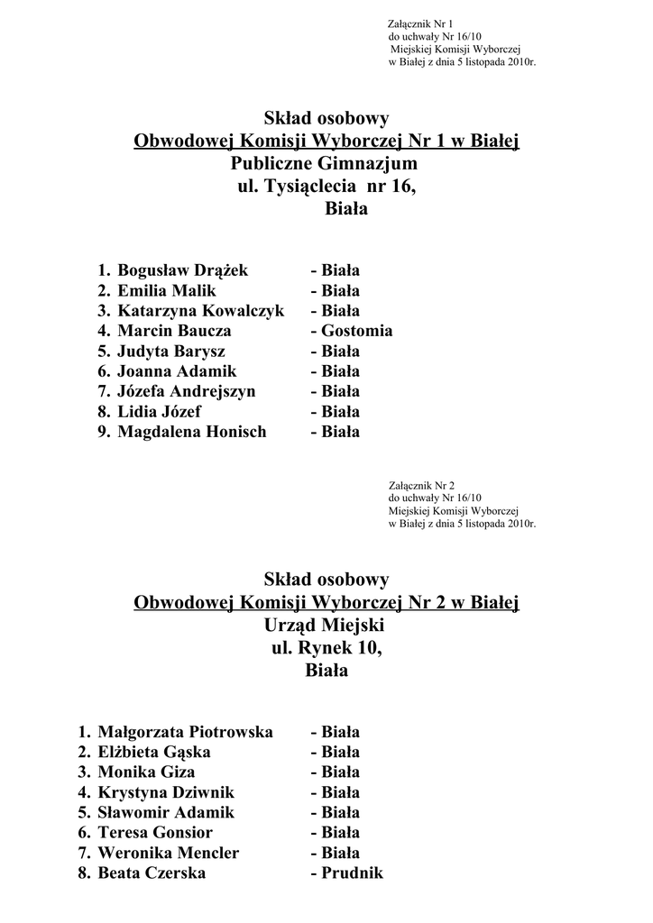 Załącznik Nr 1 do uchwały Nr 16/10 Miejskiej Komisji Wyborczej w Białej z dnia 5 listopada 2010r. Skład osobowy Obwodowej Komisji Wyborczej Nr 1 w Białej Publiczne Gimnazjum ul. Tysiąclecia nr 16, Biała 1. 2. 3. 4. 5. 6. 7. 8. 9. Bogusław Drążek Emilia Malik Katarzyna Kowalczyk Marcin Baucza Judyta Barysz Joanna Adamik Józefa Andrejszyn Lidia Józef Magdalena Honisch - Biała - Biała - Biała - Gostomia - Biała - Biała - Biała - Biała - Biała Załącznik Nr 2 do uchwały Nr 16/10 Miejskiej Komisji Wyborczej w Białej z dnia 5 listopada 2010r. Skład osobowy Obwodowej Komisji Wyborczej Nr 2 w Białej Urząd Miejski ul. Rynek 10, Biała 1. 2. 3. 4. 5. 6. 7. 8. Małgorzata Piotrowska Elżbieta Gąska Monika Giza Krystyna Dziwnik Sławomir Adamik Teresa Gonsior Weronika Mencler Beata Czerska - Biała - Biała - Biała - Biała - Biała - Biała - Biała - Prudnik Załącznik Nr 3 do uchwały Nr 16/10 Miejskiej Komisji Wyborczej w Białej z dnia 5 listopada 2010r. Skład osobowy Obwodowej Komisji Wyborczej Nr 3 w Białej Miejsko- Gminny Ośrodek Kultury, ul. Prudnicka 35, Biała 1. 2. 3. 4. 5. 6. 7. 8. 9. Julia Piotrowska Olaf Scholz Wojciech Szukalski Magda Sławik Helena Falińska Agata Rzeźnik Sybilla Przyklenk Damian Galler Teresa Chawarska - Biała - Biała - Wilków - Biała - Biała - Biała - Radostynia - Biała - Biała Załącznik Nr 4 do uchwały Nr 16/10 Miejskiej Komisji Wyborczej w Białej z dnia 5 listopada 2010r Skład osobowy Obwodowej Komisji Wyborczej Nr 4 w Chrzelicach Wiejskie Centrum Kultury i Rekreacji, Chrzelice 177, Chrzelice 1. 2. 3. 4. 5. 6. 7. 8. 9. Patrycja Nowicka Katarzyna Kosz Sławomir Tromsa Michał Ofiera Monika Pelka Monika Haimann Magdalena Barysz Elżbieta Cybis Andrea Sokol - Łącznik - Łącznik - Biała - Chrzelice - Chrzelice - Grabina - Łącznik - Chrzelice - Pogórze Załącznik Nr 5 do uchwały Nr 16/10 Miejskiej Komisji Wyborczej w Białej z dnia 5 listopada 2010r.. Skład osobowy Obwodowej Komisji Wyborczej Nr 5 w Łączniku Publiczne Gimnazjum, ul. Świerczewskiego 79d, Łącznik 1. 2. 3. 4. 5. 6. 7. 8. Bartosz Nowicki Marcin Scholz Jan Szandurski Janina Kłuś Monika Kontny Aneta Bryndza Karol Biskup Leokadia Schneider - Łącznik - Biała - Biała - Łącznik - Grabina - Łącznik - Mokra - Łącznik Załącznik Nr 6 do uchwały Nr 16/10 Miejskiej Komisji Wyborczej w Białej z dnia 5 listopada 2010r.. Skład osobowy Obwodowej Komisji Wyborczej Nr 6 w Pogórzu Szkoła Podstawowa, Pogórze 162, Pogórze 1. 2. 3. 4. 5. 6. 7. 8. Aurelia Glombik Łukasz Scholz Andrzej Bogdziewicz Tomasz Kudłacz Damian Kontny Justyna Barysz Monika Helfeier Aneta Weniger - Pogórze - Biała - Biała - Pogórze - Grabina - Łącznik - Pogórze - Pogórze Załącznik Nr 7 do uchwały Nr 16/10 Miejskiej Komisji Wyborczej w Białej z dnia 5 listopada 2010r.. Skład osobowy Obwodowej Komisji Wyborczej Nr 7 w Grabinie Remiza OSP, Grabina 62, Grabina 1. 2. 3. 4. 5. 6. 7. 8. Ewa Osiewacz Bogusława Rygiel Melita Szyroki Danuta Heda Józef Augustyn Karina Mochnik Anna Augustyn Henryk Adamik - Grabina - Biała - Wasiłowice - Grabina - Grabina - Otoki - Grabina - Biała Załącznik Nr 8 do uchwały Nr 16/10 Miejskiej Komisji Wyborczej w Białej z dnia 5 listopada 2010r.. Skład osobowy Obwodowej Komisji Wyborczej Nr 8 w Ligocie Bialskiej Sala Samorządu Mieszkańców, Ligota Bialska 60, Ligota Bialska 1. 2. 3. 4. 5. 6. 7. 8. Natalia Dorożyńska Dawid Tkacz Patrycja Szyroki Bogusława Michalik Roman Semerga Natalia Himanek Roland Wybraniec Monika Gibas - Biała - Ligota Bialska - Wasiłowice - Biała - Biała - Ligota Bialska - Radostynia - Ligota Bialska Załącznik Nr 9 do uchwały Nr 16/10 Miejskiej Komisji Wyborczej w Białej z dnia 5 listopada 2010r. Skład osobowy Obwodowej Komisji Wyborczej Nr 9 w Śmiczu Szkoła Podstawowa, Śmicz 106 Śmicz 1. 2. 3. 4. 5. 6. 7. 8. Paweł Dziwnik Janina Karmelita Kazimiera Tromsa Anna Kosz Damian Bania Kamila Wolder Piotr Wysocki Beata Babula - Biała - Biała - Biała - Łącznik - Biała - Radostynia - Śmicz - Śmicz Załącznik Nr 10 do uchwały Nr 16/10 Miejskiej Komisji Wyborczej w Białej z dnia 5 listopada 2010r.. Skład osobowy Obwodowej Komisji Wyborczej Nr 10 w Olbrachcicach Sala Samorządu Mieszkańców, Olbrachcice 69a, Olbrachcice 1. 2. 3. 4. 5. 6. 7. 8. Małgorzta Kasperska Katarzyna Kaczmarz Katarzyna Kowalczyk Ewa Adamik Tomasz Ekalt Tadeusz Andrejszyn Kornelia Szuster Anna Smiatek - Biała - Biała - Biała - Biała - Biała - Biała - Olbrachcice - Olbrachcice Załącznik Nr 11 do uchwały Nr 16/10 Miejskiej Komisji Wyborczej w Białej z dnia 5 listopada 2010r.. Skład osobowy Obwodowej Komisji Wyborczej Nr 11 w Gostomi Szkoła Podstawowa, Gostomia 46a, Gostomia 1. 2. 3. 4. 5. 6. 7. 8. Justyna Drążek Barbara Gaworek Józef Kubata Artur Kauczor Grzegorz Szczyrba Robert Tokarski Beata Tomala- Sameć Ewelina Wróblewska- Łysoń - Biała - Biała - Olbrachcice - Biała - Biała - Biała - Gostomia - Radostynia Załącznik Nr 12 do uchwały Nr 16/10 Miejskiej Komisji Wyborczej w Białej z dnia 5 listopada 2010r.. Skład osobowy Obwodowej Komisji Wyborczej Nr 12 w Rostkowicach Rolnicza Spółdzielnia Produkcyjna, Rostkowice 38, Rostkowice 1. 2. 3. 4. 5. 6. 7. 8. Katarzyna Byra Katarzyna Niewiadomska Barbara Botta Joanna Bar Krystyna Puzio Urszula Bryndza Mirosław Lasar Barbara Opiłka - Biała - Biała - Olbrachcice - Biała - Biała - Łącznik - Rostkowice - Biała Załącznik Nr 13 do uchwały Nr 16/10 Miejskiej Komisji Wyborczej w Białej z dnia 5 listopada 2010r. Skład osobowy Obwodowej Komisji Wyborczej Nr 13 w Nowej Wsi Remiza OSP, Nowa Wieś Prudnicka 51b, Nowa Wieś Prudnicka 1. 2. 3. 4. 5. 6. 7. 8. Halina Mularczyk Szymon Bujakiewicz Zofia Szandurska Wanda Botta Teresa Rak Magdalena Pelcer Wiktor Kwiotek Romana Mokry - Biała - Biała - Biała - Nowa Wieś Prudnicka - Nowa Wieś Prudnicka - Łącznik - Krobusz - Biała Załącznik Nr 14 do uchwały Nr 16/10 Miejskiej Komisji Wyborczej w