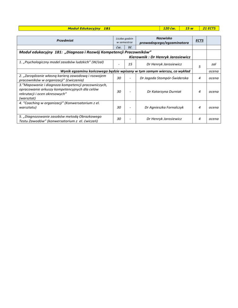 Moduł Edukacyjny 181 Przedmiot 120 ćw. Liczba godzin w semestrze ćw. 15 w Nazwisko prowadzącego/egzaminatora 21 ECTS ECTS W. Moduł edukacyjny 181: „Diagnoza i Rozwój Kompetencji Pracowników” Kierownik : Dr Henryk Jarosiewicz 1. „Psychologiczny model zasobów ludzkich” (W/zal) - 15 Dr Henryk Jarosiewicz Wynik egzaminu końcowego będzie wpisany w tym samym wierszu, co wykład 2. „Zarządzanie własną karierą zawodową i rozwojem 30 Dr Jagoda Stompór-Świderska pracowników w organizacji” (ćwiczenia) 3.”Mapowanie i diagnoza kompetencji pracowniczych, opracowanie arkuszy kompetencyjnych dla celów 30 Dr Katarzyna Durniat rekrutacji i ocen okresowych” (warsztat) 4. ”Coaching w organizacji” (Konwersatorium z el. warsztatu) 30 Dr Agnieszka Fornalczyk 5. „Diagnozowanie zasobów metodą Obrazkowego Testu Zawodów” (konwersatorium z el. ćwiczeń) 30 - Dr Henryk Jarosiewicz 5 zal ocena 4 ocena 4 ocena 4 ocena 4 ocena