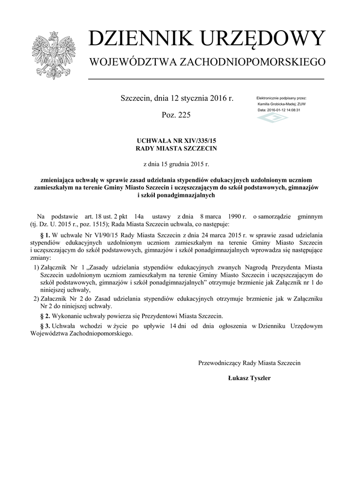 DZIENNIK URZĘDOWY WOJEWÓDZTWA ZACHODNIOPOMORSKIEGO Szczecin, dnia 12 stycznia 2016 r. Elektronicznie podpisany przez: Kamilla Grobicka-Madej; ZUW Data: 2016-01-12 14:08:31 Poz. 225 UCHWAŁA NR XIV/335/15 RADY MIASTA SZCZECIN z dnia 15 grudnia 2015 r. zmieniająca uchwałę w sprawie zasad udzielania stypendiów edukacyjnych uzdolnionym uczniom zamieszkałym na terenie Gminy Miasto Szczecin i uczęszczającym do szkół podstawowych, gimnazjów i szkół ponadgimnazjalnych Na podstawie art. 18 ust. 2 pkt 14a ustawy z dnia 8 marca 1990 r. (tj. Dz. U. 2015 r., poz. 1515); Rada Miasta Szczecin uchwala, co następuje: o samorządzie gminnym § 1. W uchwale Nr VI/90/15 Rady Miasta Szczecin z dnia 24 marca 2015 r. w sprawie zasad udzielania stypendiów edukacyjnych uzdolnionym uczniom zamieszkałym na terenie Gminy Miasto Szczecin i uczęszczającym do szkół podstawowych, gimnazjów i szkół ponadgimnazjalnych wprowadza się następujące zmiany: 1) Załącznik Nr 1 „Zasady udzielania stypendiów edukacyjnych zwanych Nagrodą Prezydenta Miasta Szczecin uzdolnionym uczniom zamieszkałym na terenie Gminy Miasto Szczecin i uczęszczającym do szkół podstawowych, gimnazjów i szkół ponadgimnazjalnych” otrzymuje brzmienie jak Załącznik nr 1 do niniejszej uchwały, 2) Załacznik Nr 2 do Zasad udzielania stypendiów edukacyjnych otrzymuje brzmienie jak w Załączniku Nr 2 do niniejszej uchwały. § 2. Wykonanie uchwały powierza się Prezydentowi Miasta Szczecin. § 3. Uchwała wchodzi w życie po upływie 14 dni od dnia ogłoszenia w Dzienniku Urzędowym Województwa Zachodniopomorskiego. Przewodniczący Rady Miasta Szczecin Łukasz Tyszler Dziennik Urzędowy Województwa Zachodniopomorskiego –2– Poz. 225 Załącznik Nr 1 do uchwały Nr XIV/335/15 Rady Miasta Szczecin z dnia 15 grudnia 2015 r. Zasady udzielania stypendiów edukacyjnych zwanych Nagrodą Prezydenta Miasta Szczecin uzdolnionym uczniom zamieszkałym na terenie Gminy Miasto Szczecin i uczęszczającym do szkół podstawowych, gimnazjów i szkół ponadgimnazjalnych. § 1. Stypendium edukacyjne Prezydenta Miasta Szczecin za wybitne osiągnięcia w nauce, zwane dalej „Nagrodą Prezydenta Miasta Szczecin”, może zostać przyznane uczniom szkół podstawowych, gimnazjów i szkół ponadgimnazjalnych zamieszkałym na terenie Gminy Miasto Szczecin. § 2. Nagrodę Prezydenta Miasta Szczecin, o której mowa w §1 przyznaje się na wniosek dyrektora szkoły. § 3. 1. O Nagrodę Prezydenta Miasta Szczecin może się ubiegać uczeń, który posiada w danym roku szkolnym wybitne osiągnięcia w nauce w zakresie wiedzy i umiejętności z przedmiotów objętych programem nauczania oraz z dziedzin nieprzewidzianych programem nauczania w danej szkole, z wyjątkiem konkursów artystycznych (np. recytatorskich, teatralnych, muzycznych, plastycznych, tanecznych) i sportowych. 2. Przez wybitne osiągnięcia w nauce, o których mowa w ust. 1, należy rozumieć: - osiągnięcia ucznia szkoły podstawowej i gimnazjum w konkursach i olimpiadach przedmiotowych lub innych ogólnopolskich i międzynarodowych konkursach punktowanych zgodnie z pkt 1 i 2 Załącznika nr 2 do niniejszych Zasad, - osiągnięcia ucznia szkoły ponadgimnazjalnej w konkursach i olimpiadach przedmiotowych lub innych ogólnopolskich i międzynarodowych konkursach punktowanych zgodnie z pkt 3 Załącznika nr 2 do niniejszych Zasad. § 4. 1. Wniosek, którego wzór stanowi Załącznik nr 1 do niniejszych Zasad, należy składać w terminie do dnia 31 maja każdego roku szkolnego do Dyrektora Wydziału Oświaty za pośrednictwem Biura Obsługi Interesantów Urzędu Miasta Szczecin. 2. Wniosek należy wypełnić elektronicznie i wydrukować, podając nazwy konkursów, olimpiad oraz organizatorów w pełnym brzmieniu. Wnioski wypełnione ręcznie nie są rozpatrywane 3. Do wniosku należy załączyć kserokopie dyplomów lub kserokopie zaświadczeń organizatora przeprowadzającego konkurs, potwierdzone za zgodność z oryginałem przez dyrektora szkoły. 4. Dołączone do wniosku kserokopie dyplomów/zaświadczeń potwierdzających sukcesy ucznia muszą zawierać pełną nazwę i datę konkursu, nazwisko i imię ucznia. 5. Sukces ucznia nie podlega punktacji w przypadku braku na dyplomie/ zaświadczeniu daty oraz stosownej pieczątki i podpisu organizatora. 6. Osiągnięcia ucznia we wniosku należy wpisywać rozpoczynając od konkursów i olimpiad zwalniających ze sprawdzianu, egzaminu gimnazjalnego, egzaminu maturalnego lub egzaminu potwierdzającego kwalifikacje zawodowe. 7. W przypadku udziału ucznia w kilku etapach tego samego konkursu należy podać ostatni etap lub ten, który wnioskodawca uważa za korzystny dla ucznia. Nie podlegają punktacji wszystkie etapy tego samego konkursu. W przypadku konkursów wielosesyjnych należy podać jedną najlepszą sesję. Kolejne sesje tego samego konkursu nie podlegają ocenie. 8. W przypadku udziału ucznia w olimpiadzie/ konkursie dla wyższego etapu edukacyjnego, punkty za osiągnięcia przyznawane są zgodnie z tabelą wyższego etapu edukacyjnego. Dziennik Urzędowy Województwa Zachodniopomorskiego –3– Poz. 225 9. W przypadku osiągnięć drużynowych (zespołowych) i braku nazwisk oraz imion uczniów na dyplomie szkoła dołącza spis drużyny (zespołu) potwierdzony przez dyrektora szkoły. 10. Wnioski o przyznanie uczniom Nagrody Prezydenta Miasta Szczecin opiniuje w drodze uchwały Rada Pedagogiczna i Rada Rodziców szkoły, do której uczęszcza uczeń typowany do nagrody. § 5. 1. Nagrodę przyznaje Prezydent Miasta Szczecin poprzez zatwierdzenie listy nagrodzonych uczniów sporządzonej przez Komisję Nagród Prezydenta Miasta Szczecin, zwanej dalej „Komisją”. 2. Prezydent Miasta Szczecin w drodze Zarządzenia powołuje Komisję, określa jej skład osobowy oraz wyznacza przewodniczącego, który kieruje pracami Komisji. 3. W skład Komisji wchodzi: a) przedstawiciel Komisji ds. Edukacji Rady Miasta Szc