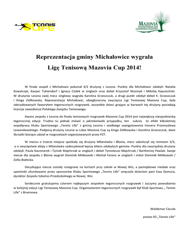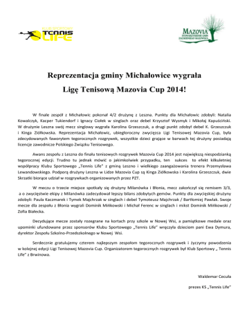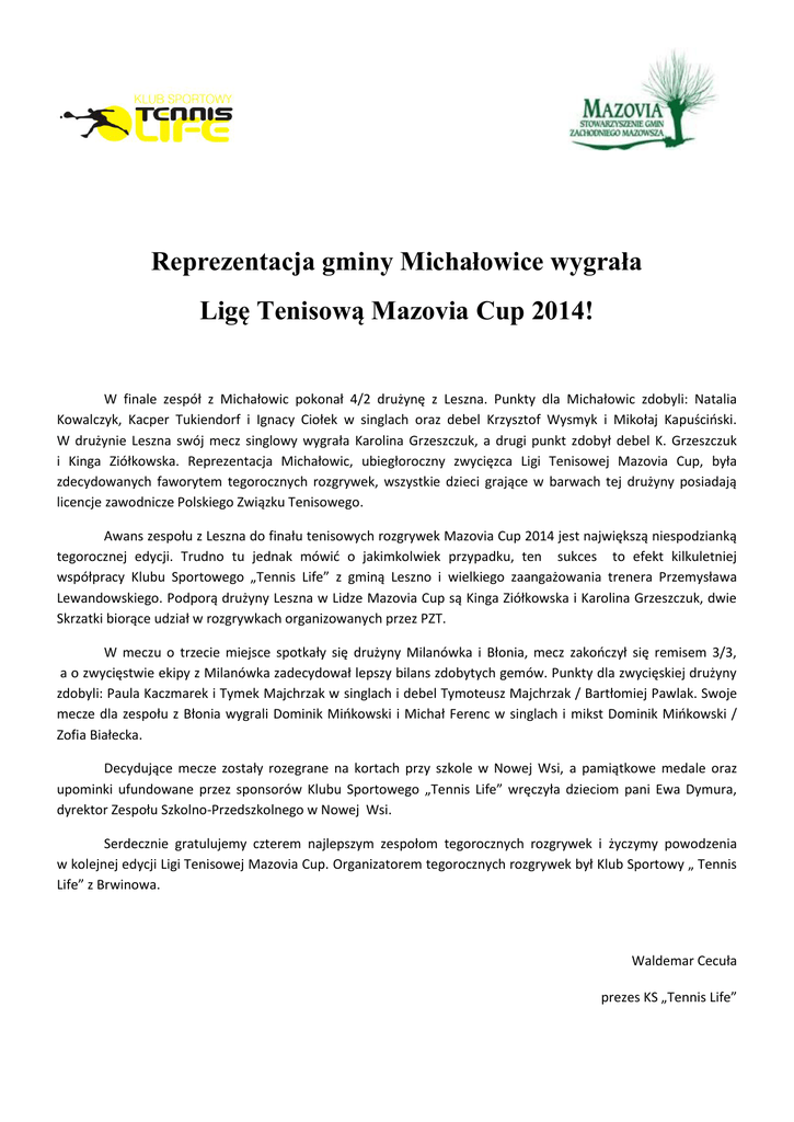 Reprezentacja gminy Michałowice wygrała Ligę Tenisową Mazovia Cup 2014! W finale zespół z Michałowic pokonał 4/2 drużynę z Leszna. Punkty dla Michałowic zdobyli: Natalia Kowalczyk, Kacper Tukiendorf i Ignacy Ciołek w singlach oraz debel Krzysztof Wysmyk i Mikołaj Kapuścioski. W drużynie Leszna swój mecz singlowy wygrała Karolina Grzeszczuk, a drugi punkt zdobył debel K. Grzeszczuk i Kinga Ziółkowska. Reprezentacja Michałowic, ubiegłoroczny zwycięzca Ligi Tenisowej Mazovia Cup, była zdecydowanych faworytem tegorocznych rozgrywek, wszystkie dzieci grające w barwach tej drużyny posiadają licencje zawodnicze Polskiego Związku Tenisowego. Awans zespołu z Leszna do finału tenisowych rozgrywek Mazovia Cup 2014 jest największą niespodzianką tegorocznej edycji. Trudno tu jednak mówid o jakimkolwiek przypadku, ten sukces to efekt kilkuletniej współpracy Klubu Sportowego „Tennis Life” z gminą Leszno i wielkiego zaangażowania trenera Przemysława Lewandowskiego. Podporą drużyny Leszna w Lidze Mazovia Cup są Kinga Ziółkowska i Karolina Grzeszczuk, dwie Skrzatki biorące udział w rozgrywkach organizowanych przez PZT. W meczu o trzecie miejsce spotkały się drużyny Milanówka i Błonia, mecz zakooczył się remisem 3/3, a o zwycięstwie ekipy z Milanówka zadecydował lepszy bilans zdobytych gemów. Punkty dla zwycięskiej drużyny zdobyli: Paula Kaczmarek i Tymek Majchrzak w singlach i debel Tymoteusz Majchrzak / Bartłomiej Pawlak. Swoje mecze dla zespołu z Błonia wygrali Dominik Miokowski i Michał Ferenc w singlach i mikst Dominik Miokowski / Zofia Białecka. Decydujące mecze zostały rozegrane na kortach przy szkole w Nowej Wsi, a pamiątkowe medale oraz upominki ufundowane przez sponsorów Klubu Sportowego „Tennis Life” wręczyła dzieciom pani Ewa Dymura, dyrektor Zespołu Szkolno-Przedszkolnego w Nowej Wsi. Serdecznie gratulujemy czterem najlepszym zespołom tegorocznych rozgrywek i życzymy powodzenia w kolejnej edycji Ligi Tenisowej Mazovia Cup. Organizatorem tegorocznych rozgrywek był Klub Sportowy „ Tennis Life” z Brwinowa. Waldemar Cecuła prezes KS „Tennis Life”