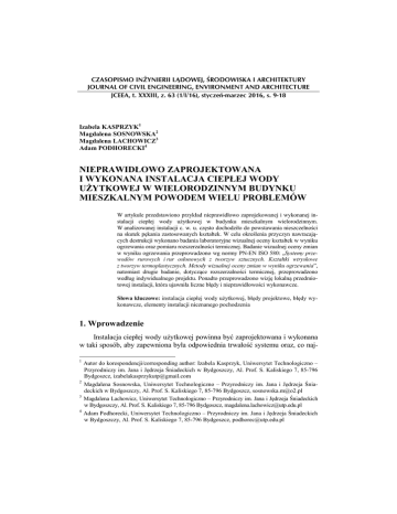 CZASOPISMO INŻYNIERII LĄDOWEJ, ŚRODOWISKA I ARCHITEKTURY JOURNAL OF CIVIL ENGINEERING, ENVIRONMENT AND ARCHITECTURE JCEEA, t. XXXIII, z. 63 (1/I/16), styczeń-marzec 2016, s. 9-18 Izabela KASPRZYK1 Magdalena SOSNOWSKA2 Magdalena LACHOWICZ3 Adam PODHORECKI4 NIEPRAWIDŁOWO ZAPROJEKTOWANA I WYKONANA INSTALACJA CIEPŁEJ WODY UŻYTKOWEJ W WIELORODZINNYM BUDYNKU MIESZKALNYM POWODEM WIELU PROBLEMÓW W artykule przedstawiono przykład nieprawidłowo zaprojekowanej i wykonanej instalacji ciepłej wody użytkowej w budynku mieszkalnym wielorodzinnym. W analizowanej instalacji c. w. u. często dochodziło do powstawania nieszczelności na skutek pękania zastosowanych kształtek. W celu określenia przyczyn nawracających destrukcji wykonano badania laboratoryjne wizualnej oceny kształtek w wyniku ogrzewania oraz pomiaru rozszerzalności termicznej. Badanie wizualnej oceny zmian w wyniku ogrzewania przeprowadzono wg normy PN-EN ISO 580: „Systemy przewodów rurowych i rur osłonowych z tworzyw sztucznych. Kształtki wtryskowe z tworzyw termoplastycznych. Metody wizualnej oceny zmian w wyniku ogrzewania”, natomiast drugie badanie, dotyczące rozszerzalności termicznej, przeprowadzono według indywidualnego projektu. Ponadto przeprowadzono wizję lokalną przedmiotowej instalacji, która ujawniła liczne błędy i nieprawidłowości wykonawcze. Słowa kluczowe: instalacja ciepłej wody użytkowej, błędy projektowe, błędy wykonawcze, elementy instalacji nieznanego pochodzenia 1. Wprowadzenie Instalacja ciepłej wody użytkowej powinna być zaprojektowana i wykonana w taki sposób, aby zapewniona była odpowiednia trwałość systemu oraz, co naj1 2 3 4 Autor do korespondencji/corresponding author: Izabela Kasprzyk, Uniwersytet Technologiczno – Przyrodniczy im. Jana i Jędrzeja Śniadeckich w Bydgoszczy, Al. Prof. S. Kaliskiego 7, 85-796 Bydgoszcz, [email protected] Magdalena Sosnowska, Uniwersytet Technologiczno – Przyrodniczy im. Jana i Jędrzeja Śniadeckich w Bydgoszczy, Al. Prof. S. Kaliskiego 7, 85-796 Bydgoszcz, [email protected] Magdalena Lachowicz, Uniwersytet Technologiczno – Przyrodniczy im. Jana i Jędrzeja Śniadeckich w Bydgoszczy, Al. Prof. S. Kaliskiego 7, 85-796 Bydgoszcz, [email protected] Adam Podhorecki, Uniwersytet Technologiczno – Przyrodniczy im. Jana i Jędrzeja Śniadeckich w Bydgoszczy, Al. Prof. S. Kaliskiego 7, 85-796 Bydgoszcz, [email protected] 10 I. Kasprzyk, M. Sosnowska, M. Lachowicz, A. Podhorecki ważniejsze bezpieczeństwo użytkowania. Z uwagi na kontakt rur z wodą pitną, użyte materiały i wyroby muszą bezwzględnie posiadać certyfikat CE (dopuszczający je do obrotu) oraz atest Państwowego Zakładu Higieny. Do wykonania instalacji wodnej najczęściej stosuje się rury miedziane lub z tworzyw sztucznych, takich jak: polietylen (PE), polipropylen (PP), czy polichlorek winylu (PCW). Ważne jest to, aby nie stosować w jednej instalacji elementów z różnych materiałów. Błędem jest także łączenie rur i kształtek różnych producentów. W artykule zostanie omówiony przykład nieprawidłowo wykonanej instalacji ciepłej wody użytkowej (c. w. u.) w budynku wielorodzinnym. Analizowana instalacja c. w. u. została wykonana z tworzywa sztucznego. Zastosowane w niej kształtki zaczęły ulegać uszkodzeniu, co wielokrotnie powodowało nieszczelność instalacji. Po wymianie spękanych elementów, uszkodzenia odnawiały się po pewnym czasie. Autorzy artykułu wykonali ekspertyzę, której celem było ustalenie przyczyn powstających uszkodzeń kształtek stosowanych w instalacjach wewnętrznych ciepłej wody użytkowej. 2. Badania laboratoryjne kształtek (próbek) W analizowanym przypadku wielokrotnie dochodziło do rozszczelnienia instalacji ciepłej wody na skutek pękania kształtek. Aby sprawdzić jakość kształtek oraz ocenić ich pracę w przypadku znacznych zmian temperatury, poddano kilka próbek (stanowiących fragment wykonanej instalacji) następującym badaniom: • wizualnej ocenie zmian w wyniku ogrzania, • pomiarom rozszerzalności termicznej. Do badań przeznaczono 5 kształtek ponumerowanych od 1-5 (fot. 1), które służyły do łączenia rur o średnicy zewnętrznej 32 mm w badanym budynku. Próbki Fot. 1. Badane kształtki, próbki Phot. 1. Tested fittings Nieprawidłowo zaprojektowana i wykonana instalacja ciepłej wody użytkowej… 11 wykonane były z polipropylenu (PP). Polipropylen jest jednym z najczęściej stosowanych tworzyw sztucznych. Powstaje on w wyniku niskociśnieniowej polimeryzacji propylenu. Do kształtek dołączone były fragmenty rur polipropylenowych (połączenie zgrzewane). Brakowało dokładnych danych źródłowych odnoszących się do typów poszczególnych kształtek. Na podstawie opisów zawartych na kształtkach ustalono, że mają one następujące symbole i oznaczenia: • kolanko nr 1 - typ PP-R PN 2.5 WB L32, producent nieznany, • kolanko nr 2 - typ ustalony, producent ustalony, • kolanko nr 3 - typ PP-R PN 2.5 WBL32, producent nieznany, • kolanko nr 4 - typ nieznany, producent ustalony, • kolanko nr 5 - typ PP-R PN 2.5 WBL 32, producent nieznany. Pierwsze badanie to ocena wizualna kształtek w wyniku ogrzania. Badanie przeprowadzono wg normy PN-EN ISO 580: „Systemy przewodów rurowych i rur osłonowych z tworzyw sztucznych. Kształtki wtryskowe z tworzyw termoplastycznych. Metody wizualnej oceny zmian w wyniku ogrzewania” [1]. Celem badania było ustalenie tego, w jaki sposób wzrost temperatury wpływa na stan techniczny kształtek. Kształtki poddano działaniu podwyższonej temperatury (150°C), w suszarce z obiegiem powietrza w określonym czasie (30 minut), zależnym od grubości ścianki i materiału, z którego wykonana jest kształtka (polipropylen, gr. ścianki 3÷10 mm). Powierzchnie kształtek sprawdzane były przed ogrzewaniem i po ogrzewaniu. Dokładnie obserwowano powstałe destrukcje, tj. pęknięcia, pęcherze, rozwarstwienia. Wyniki badań przedstawi