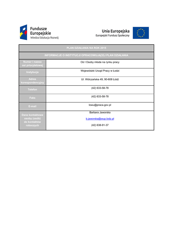 Plan Działania na rok 2015 - Wojewódzki Urząd Pracy w Łodzi