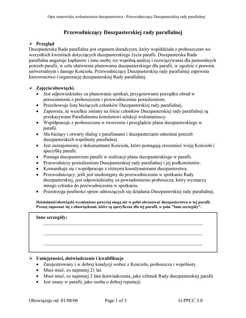 Opis stanowiska wolontariusza duszpasterstwa - Przewodniczący Duszpasterskiej rady parafialnej Przewodniczący Duszpasterskiej rady parafialnej Przegląd Duszpasterska Rada parafialna jest organem doradczym, który współdziała z proboszczem we wszystkich kwestiach dotyczących duszpasterskiego życia parafii. Duszpasterska Rada parafialna angażuje kapłanów i inne osoby we wspólną analizę i rozwiązywania dla pastoralnych potrzeb parafii, w celu ułatwienia planowania duszpasterskiego dla parafii, w zgodzie z prawem uniwersalnym i danego Kościoła. Przewodniczący Duszpasterskiej rady parafialnej zapewnia kierownictwo i organizację duszpasterskiej Rady parafialnej. Zajęcia/obowiązki. Jest odpowiedzialny za planowanie spotkań, przygotowanie porządku obrad w porozumieniu z proboszczem i przewodniczenie posiedzeniom. Przechowuje listę bieżących członków Duszpasterskiej rady parafialnej. Zapewnia, że wszelkie zmiany na liście członków Duszpasterskiej rady parafialnej są przekazywane Parafialnemu komitetowi selekcji wolontariuszy. Współpracuje z proboszczem w tworzeniu i przeglądzie planu duszpasterskiego w parafii. Ma bieżący i otwarty dialog z parafianami i duszpasterzami odnośnie potrzeb duszpasterskich wspólnoty parafialnej. Jest zaznajomiony z dokumentami Kościoła, które pomagają zrozumieć wizję Kościoła i specyfikę parafii. Pomaga duszpasterzom parafii w realizacji planu duszpasterskiego w parafii. Przewodniczy posiedzeniom Duszpasterskiej rady parafialnej i jej podkomitetów. Komunikuje się i współpracuje z różnymi koordynatorami duszpasterstwa. Przewodniczący, jeśli jest niedostępny do przewodniczenia w spotkaniu Rady duszpasterskiej, jest odpowiedzialny za powiadomienie proboszcza, który wyznaczy innego członka do przewodniczenia w spotkaniu. Przestrzega poufności spraw odnoszących się działania Duszpasterskiej rady parafialnej. Działalność/obowiązki wymienione powyżej mogą nie w pełni obrazować duszpasterstwa w tej parafii. Proszę zapoznać się z obowiązkami, które są specyficzne dla tej parafii, w polu "Inne szczegóły". Inne szczegóły: ________________________________________________________________________ ________________________________________________________________________ ________________________________________________________________________ Umiejętności, doświadczenie i kwalifikacje Zarejestrowany i w dobrej kondycji wobec z Kościoła, proboszcza i wspólnoty. Musi mieć, co najmniej 21 lat. Musi mieć, co najmniej 2 lata doświadczenia, jako członek Rady duszpasterskiej parafii Jest znany w parafii, jako osoba o dobrej reputacji. Obowiązuje od: 01/08/06 Page 1 of 3 G-PPCC 3.0 Opis stanowiska wolontariusza duszpasterstwa - Przewodniczący Duszpasterskiej rady parafialnej Ma zrozumienie zobowiązania wobec Kościoła w znaczeniu wyrażonym w naukach Kościoła. Ma odpowiednie umiejętności kierowania, organizacji i podejmowania decyzji. Ma zrozumienia charakterystycznych cech parafii, duszpasterstwa i ludzi. Powinien mieć duchowe i czasowe możliwości konieczne do rozpoznania potrzeb parafii i świadczenia odpowiednich usług w związku z tymi potrzebami. Powinien posiadać umiejętność współpracy, komunikacji interpersonalnej i procesu grupy. Dodatkowe umiejętności, które byłyby dodatkowym atutem to studia teologiczne zwłaszcza teologii Kościoła, historia kościoła, formacja duszpasterstwa, itp. Jest chętny do stałego uczestnictwa w formacji. Osobiste cechy i zalety Pragnie służyć Wspólnocie i przeznacza na to czas i talent. Uczciwy, niezawodny i mogący utrzymywać ścisłą poufność. Ma zdolność do słuchania i artykulacji tego, co usłyszał. Musi być elastyczny i mieć dobre umiejętności relacji. Pragnie rozwoju duchowego i jest otwarty na modlitwę i reflekcje. Ma zdolność do motywowania i wspierania innych. Orientacja i szkolenia Standardowy program orientacyjny parafii i i znajomość przepisów Archidiecezji Toronto oraz konstytucji lub statutu w parafii. Grupa uczestników Parafianie, członkowie Duszpasterskiej rady parafialnej i wszyscy zaangażowani w duszpasterstwo na parafii. Wsparcie, nadzór i ewaluacja Proboszcz jest pierwszą instancją oferującą wsparcie, nadzór i ewaluacje. Długość kadencji Trzy do pięciu lat z możliwością odnowienia. Korzyści i warunki pracy Mają bezpośredni wpływ na decyzje duchowe w parafii. Będzie rozwijać umiejętności przywódcze oraz organizacyjne. Będą dalej rozwijać własny rozwój duchowy. Jest to pozycja wolontariusza, wymagające zaangażowania czasu ___ godzin na tydzień/___ miesięcznie. Musi być w stanie uczestniczyć w regularnie odbywających się zebraniach. Obowiązuje od: 01/08/06 Page 2 of 3 G-PPCC 3.0 Opis stanowiska wolontariusza duszpasterstwa - Przewodniczący Duszpasterskiej rady parafialnej Zalecenia przy selekcji To jest stanowisko wiążące się z ryzykiem ogólnym. Wymagane jest wypełnienie formularza Dane wolontariusza. Szkolenie i orientacja są wymagane. Będzie nadzór i okresowe ewaluacje. Ten opis stanowiska dokładnie odzwierciedla opis pozycji wolontariusza- Przewodniczący Parafialnej rady duszpasterskiej obecnie praktykowane w ________________________________. (Nazwa parafii) ___________________________________ Parafialny komitet selekcji wolontariuszy ___________________________________ Proboszcz __________________________________ Data Przygotowane przez: Archidiecezja Toronto Obowiązuje od: 01/08/06 Page 3 of 3 G-PPCC 3.0
