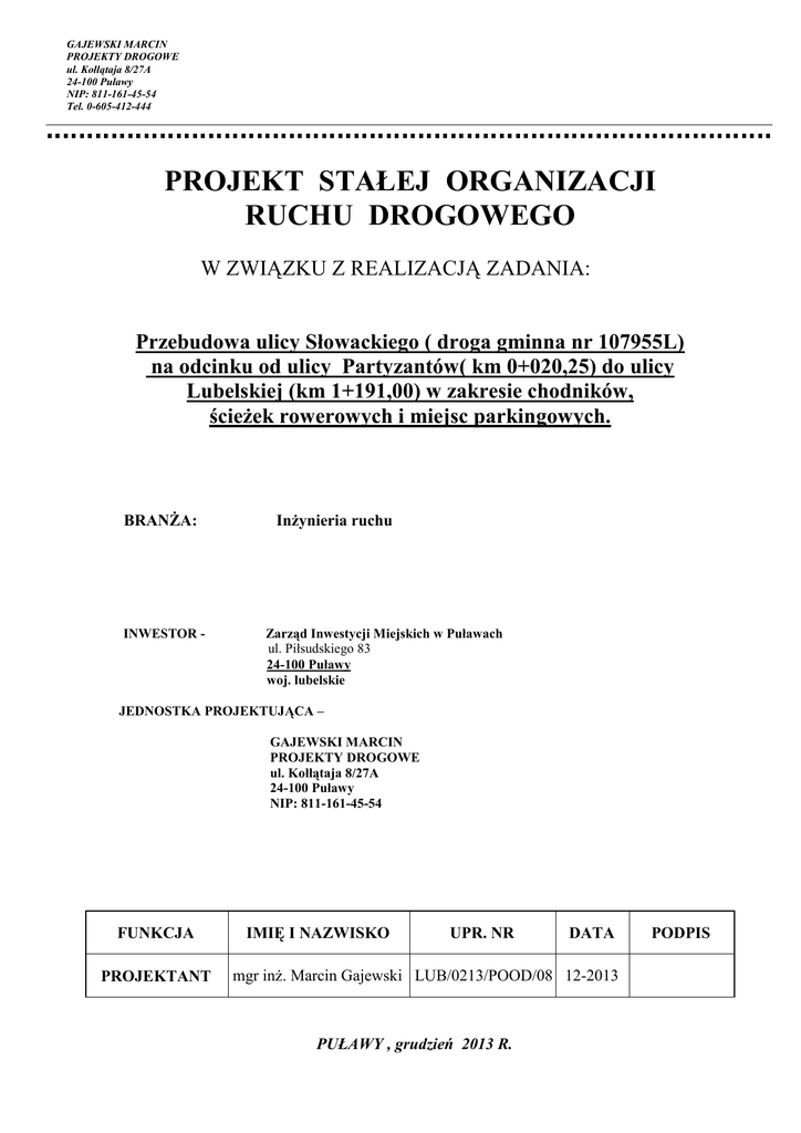 GAJEWSKI MARCIN PROJEKTY DROGOWE ul. Kołłątaja 8/27A 24-100 Puławy NIP: 811-161-45-54 Tel. 0-605-412-444 PROJEKT STAŁEJ ORGANIZACJI RUCHU DROGOWEGO W ZWIĄZKU Z REALIZACJĄ ZADANIA: Przebudowa ulicy Słowackiego ( droga gminna nr 107955L) na odcinku od ulicy Partyzantów( km 0+020,25) do ulicy Lubelskiej (km 1+191,00) w zakresie chodników, ścieżek rowerowych i miejsc parkingowych. BRANŻA: INWESTOR - Inżynieria ruchu Zarząd Inwestycji Miejskich w Puławach ul. Piłsudskiego 83 24-100 Puławy woj. lubelskie JEDNOSTKA PROJEKTUJĄCA – GAJEWSKI MARCIN PROJEKTY DROGOWE ul. Kołłątaja 8/27A 24-100 Puławy NIP: 811-161-45-54 FUNKCJA PROJEKTANT IMIĘ I NAZWISKO UPR. NR DATA mgr inż. Marcin Gajewski LUB/0213/POOD/08 12-2013 PUŁAWY , grudzień 2013 R. PODPIS Zawartość opracowania: 1. Część opisowa Opis techniczny I. Zakres opracowania II. Podstawa opracowania III. Opis sytuacji istniejącej IV. Charakterystyka drogi i ruchu na drodze V. Projektowana organizacja ruchu VI. Technologia wykonywania znaków 2. Część rysunkowa Rys. Nr 1 – Plan orientacyjny w skali 1 : 20 000 Rys. Nr 2 – Plan sytuacyjny (3 arkusze) w skali 1 : 500 1 OPIS TECHNICZNY I. ZAKRES OPRACOWANIA Przedmiotem opracowania jest projekt stałej organizacji ruchu obejmujący lokalizację oznakowania pionowego, poziomego w związku z planowaną realizacją zadania: „Przebudowa ulicy Słowackiego ( droga gminna nr 107955L) na odcinku od ulicy Partyzantów ( km 0+020,25) do ulicy Lubelskiej (km 1+191,00) w zakresie chodników, ścieżek rowerowych i miejsc parkingowych.” II. PODSTAWA OPRACOWANIA 1. Zlecenie Inwestora; 2. Ustawa o drogach publicznych z dnia 21 marca 1985 roku (tekst jednolity Dz. U. z 2013 r., poz. 260 z dnia 30.01.2013 r.); 3. Ustawa z dnia 20 czerwca 1997 r. Prawo o ruchu drogowym (tekst jednolity Dz. U. z 2012 r., poz.1137 z dnia 30 sierpnia 2012 r.); 4. Rozporządzenie Ministra Infrastruktury w sprawie szczegółowych warunków zarządzania ruchem na drogach oraz wykonywania nadzoru nad tym zarządzaniem z dnia 23 września 2003 r. (Dz. U. Nr 177 z 2003 r., poz. 1729); 5. Rozporządzenie Ministrów Infrastruktury z dnia 3 lipca 2003 r. w sprawie warunków technicznych dla znaków i sygnałów drogowych oraz urządzeń bezpieczeństwa ruchu drogowego i warunków ich umieszczania na drogach (Dz. U. nr 220 z dn. 23.12.2003, poz. 2181 z późn. zmianami); 6. Szczegółowe warunki techniczne dla znaków i sygnałów drogowych oraz urządzeń bezpieczeństwa ruchu drogowego i warunki ich umieszczania na drogach – Załącznik do Rozporządzenia Ministra Infrastruktury z dnia 3 lipca 2003 r. (Dz.U. Nr 220 z dn. 23.12.2003 r., poz. 2181) – w szczególności Załącznik nr 1 Szczegółowe warunki techniczne dla znaków drogowych pionowych i warunki ich umieszczania na drogach oraz Załącznik nr 2 Szczegółowe warunki techniczne dla znaków drogowych poziomych i warunki ich umieszczania na drogach; 7. Inwentaryzacja istniejącego oznakowania przeprowadzona w trakcie wizji lokalnej. III. OPIS SYTUACJI ISTNIEJĄCEJ Teren przeznaczony pod przebudowę stanowi działka 3242/1- tj. działka stanowiąca pas drogowy drogi gminnej – ulicy Słowackiego. Jezdnia na odcinku objętym opracowaniem posiada przekrój uliczny, z jezdnią asfaltową o szerokości 9,0m. Jezdnia ta ograniczona jest obustronnie krawężnikiem betonowym 20x30cm. Za krawężnikiem betonowym znajdują się pasy zieleni o szerokości zmiennej. Za pasami zieleni znajdują się chodniki z płyt betonowych 35x35cm i 50x50cm o szerokości 2,0-4,0m, które obramowane są obrzeżem betonowym chodnikowym. W latach ubiegłych wykonano odnowę nawierzchni asfaltowej ulicy Słowackiego, ustawiono nowe krawężniki betonowe 20x30cm oraz wykonano nowe nawierzchnie zjazdów z kostki brukowej. Do tej pory nie wyremontowano 2 nawierzchni chodników i ścieżek rowerowych, które są złym stanie technicznym, posiadają liczne nierówności, ubytki, co stwarza zagrożenie dla jej użytkowników. Ulica Słowackiego na rozpatrywanym odcinku posiada skrzyżowania z drogami gminnymi: IV. ulicą Żeromskiego; ulicą Kochanowskiego; ulicą Sieroszewskiego; ulicą Reymonta; ulicą Chmielowskiego ulicą Kaniowczyków ulicą Składową CHARAKTERYSTKA DROGI I RUCHU NA DRODZE. Przedmiotowa inwestycja położona jest na działce nr 3242/1, która stanowi pas drogowy ulicy Słowackiego, na odcinku od km 0+020,25 ( granica pasa drogowego ulicy Partyzantów) do km 1+191,00 tj. początek istniejącej ścieżki rowerowej prowadzącej do ulicy Lubelskiej. Zakres inwestycji obejmuje: Przebudowę ścieżki rowerowej jednokierunkowej o szerokości 1,5-2,0m po prawej stronie jezdni oraz szerokości 1,5m po lewej stronie jezdni ul. Słowackiego; Przebudowę chodnika prawostronnego o szerokości 1,5-2,0m oraz lewostronnego o szerokości 1,0-1,5m wzdłuż ulicy Słowackiego; Przebudowę nawierzchni 19 miejsc parkingowych po prawej stronie jezdni ulicy Słowackiego na odcinku od km 0+135,50 do km 0+216,00; Przebudowę nawierzchni zjazdów w km 0+282,41 strona prawa oraz w km 0+577,82 strona lewa; Przebudowę nawierzchni w obrębie 3 szt. wiat przystankowych; Wykonanie opaski bezp. z kostki brukowej wzdłuż istniejącego krawężnika betonowego 20x30cm przy jezdni. Charakterystyka ruchu na drodze. Droga gminna- ulica Słowackiego łączy ze sobą dwie drogi krajowe- ulicę Lubelską z ulicą Partyzantów oraz zapewnia dojazd do położonych wzdłuż ulicy Słowackiego dróg gminnych: ulicy Żeromskiego; ulicy Kochanowskiego; ulicy Sieroszewskiego; ulicy Reymonta; ulicy Chmielowskiego ulicy Kaniowczyków ulicy Składowej. Po drodze tej odbywa się ruch wszelkich rodzajów pojazdów o rzeczywistej masie całkowitej poniżej 12T oraz ruch pieszych i rowerzystów po istniejących chodnikach i jezdni. Natężenie ruchu pojazdów należy określić jako średnie, z przeważającym ruchem pojazdów osobowych. Natężenie to wzrasta do dużego, w godzinach dojazdu mieszkańców i 