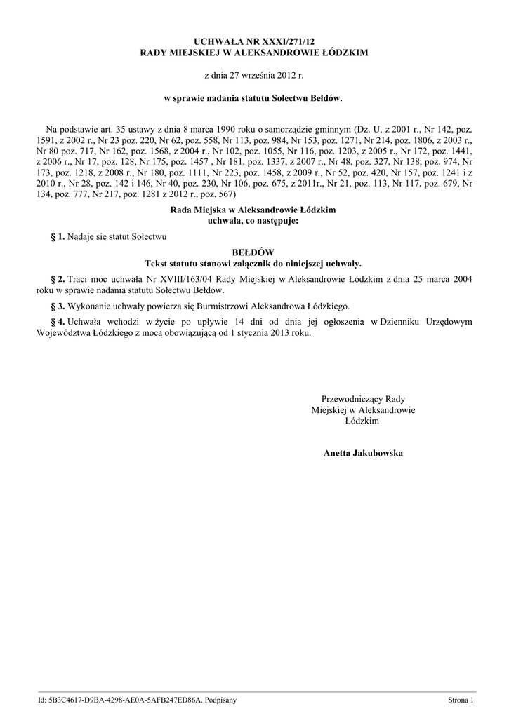 UCHWAŁA NR XXXI/271/12 RADY MIEJSKIEJ W ALEKSANDROWIE ŁÓDZKIM z dnia 27 września 2012 r. w sprawie nadania statutu Sołectwu Bełdów. Na podstawie art. 35 ustawy z dnia 8 marca 1990 roku o samorządzie gminnym (Dz. U. z 2001 r., Nr 142, poz. 1591, z 2002 r., Nr 23 poz. 220, Nr 62, poz. 558, Nr 113, poz. 984, Nr 153, poz. 1271, Nr 214, poz. 1806, z 2003 r., Nr 80 poz. 717, Nr 162, poz. 1568, z 2004 r., Nr 102, poz. 1055, Nr 116, poz. 1203, z 2005 r., Nr 172, poz. 1441, z 2006 r., Nr 17, poz. 128, Nr 175, poz. 1457 , Nr 181, poz. 1337, z 2007 r., Nr 48, poz. 327, Nr 138, poz. 974, Nr 173, poz. 1218, z 2008 r., Nr 180, poz. 1111, Nr 223, poz. 1458, z 2009 r., Nr 52, poz. 420, Nr 157, poz. 1241 i z 2010 r., Nr 28, poz. 142 i 146, Nr 40, poz. 230, Nr 106, poz. 675, z 2011r., Nr 21, poz. 113, Nr 117, poz. 679, Nr 134, poz. 777, Nr 217, poz. 1281 z 2012 r., poz. 567) Rada Miejska w Aleksandrowie Łódzkim uchwala, co następuje: § 1. Nadaje się statut Sołectwu BEŁDÓW Tekst statutu stanowi załącznik do niniejszej uchwały. § 2. Traci moc uchwała Nr XVIII/163/04 Rady Miejskiej w Aleksandrowie Łódzkim z dnia 25 marca 2004 roku w sprawie nadania statutu Sołectwu Bełdów. § 3. Wykonanie uchwały powierza się Burmistrzowi Aleksandrowa Łódzkiego. § 4. Uchwała wchodzi w życie po upływie 14 dni od dnia jej ogłoszenia w Dzienniku Urzędowym Województwa Łódzkiego z mocą obowiązującą od 1 stycznia 2013 roku. Przewodniczący Rady Miejskiej w Aleksandrowie Łódzkim Anetta Jakubowska ————————————————————————————————————————————————————————— Id: 5B3C4617-D9BA-4298-AE0A-5AFB247ED86A. Podpisany Strona 1 Załącznik do Uchwały Nr XXXI/271/12 Rady Miejskiej w Aleksandrowie Łódzkim z dnia 27 września 2012 r. Rozdział 1. Postanowienia ogólne § 1. 1. Sołectwo Bełdów jest wspólnotą osób zamieszkujących jego terytorium. 2. Sołectwo Bełdów stanowi jednostką pomocniczą Gminy Aleksandrów Łódzki, obejmującą wieś Bełdów. 3. Sołectwo Bełdów działa na podstawie obowiązujących przepisów, a w szczególności: 1) ustawy z dnia 8 marca 1990 roku o samorządzie gminnym ( Dz.U. z 2001 r., Nr 142, poz. 1591 z późn.zm.); 2) Statutu Gminy Aleksandrów Łódzki; 3) niniejszego statutu; 4) Sołectwo Bełdów nie posiada osobowości prawnej. § 2. Granice Sołectwa Bełdów o powierzchni 1272 ha obrazuje mapa poglądowa stanowiąca załącznik do niniejszego statutu. § 3. Ilekroć w dalszej części Statutu sołectwa Bełdów jest mowa o : 1) Burmistrzu- należy przez to rozumieć Burmistrza Aleksandrowa Łódzkiego; 2) Gminie- należy przez to rozumieć Gminę Aleksandrów Łódzki; 3) organach Gminy- należy przez to rozumieć Radę Miejską w Aleksandrowie Łódzkim i Burmistrza Aleksandrowa Łódzkiego; 4) Radzie Sołeckiej- należy przez to rozumieć Radę Sołecką Sołectwa Bełdów; 5) radnych- należy przez to rozumieć radnych Rady Miejskiej w Aleksandrowie Łódzkim; 6) Radzie Miejskiej- należy przez to rozumieć Radę Miejską w Aleksandrowie Łódzkim; 7) Sołectwie- należy przez to rozumieć Sołectwo Bełdów; 8) Sołtysie- należy przez to rozumieć sołtysa Sołectwa Bełdów; 9) statucie- należy przez to rozumieć Statut Sołectwa Bełdów; 10) ustawie- należy przez to rozumieć ustawę z dnia 8 marca 1990 roku o samorządzie gminnym; 11) zebraniu wiejskim- należy przez to rozumieć zebranie wiejskie Sołectwa Bełdów. Rozdział 2. Organizacja i zakres działania § 4. 1. Organami sołectwa są: 1) zebranie wiejskie; 2) Sołtys. 2. Zebranie wiejskie może powołać stałe lub doraźne zespoły lub komisje określając zakres ich przedmiot działania oraz kompetencje. § 5. 1. Organem uchwałodawczym Sołectwa jest zebranie wiejskie . 2. Organem wykonawczym Sołectwa jest Sołtys. 3. Rada Sołecka jest organem wspomagającym i opiniodawczym Sołtysa, którego wspiera w funkcjach wykonawczych. ————————————————————————————————————————————————————————— Id: 5B3C4617-D9BA-4298-AE0A-5AFB247ED86A. Podpisany Strona 1 § 6. Do zadań Sołectwa oraz jego organów należy zaspokajanie zbiorowych potrzeb mieszkańców i umożliwienie im uczestnictwa w życiu wspólnoty, w szczególności poprzez: 1) organizowanie samopomocy mieszkańców i wspólnych przedsięwzięć na rzecz rozwoju Sołectwa; 2) inicjowanie działań organów Gminy w sprawach wchodzących w zakres zadań własnych Gminy, w tym m.in. działań dotyczących inwestycji i modernizacji infrastruktury znajdującej się na terenie Sołectwa; 3) inicjowanie działań w zakresie pomocy społecznej w celu zabezpieczenia odpowiednich warunków socjalnobytowych mieszkańców Sołectwa; 4) upowszechnianie kultury, sportu i wypoczynku; 5) organizowanie działań w zakresie opiekuńczo-wychowawczym na rzecz dzieci i młodzieży; 6) dbałość o stan środowiska naturalnego, utrzymanie czystości, ładu i porządku. § 7. Zadania określone w §6 Sołectwo realizuje w szczególności w formie: 1) współuczestnictwa w organizowaniu i przeprowadzaniu przez organy Gminy konsultacji społecznych; 2) kierowania do organów Gminy wniosków dotyczących Sołectwa; 3) współpracy z komisjami Rady Miejskiej w rozpatrywaniu spraw dotyczących Sołectwa; 4) współpracy z radnymi, inicjowania i ułatwienia im kontaktów z wyborcami z terenu Sołectwa; 5) wydawania opinii na wniosek organów Gminy; 6) współpracy z innymi jednostkami organizacyjnymi i pomocniczymi gminy. § 8. Do zakresu działania zebrania wiejskiego należy: 1) uchwalanie rocznego planu wydatków Sołectwa; 2) rozpatrywanie sprawozdania Sołtysa z wykonania rocznego planu wydatków Sołectwa; 3) wybór i odwołanie Sołtysa i członków Rady Sołeckiej; 4) podejmowanie inicjatyw społecznych i gospodarczych przedstawian