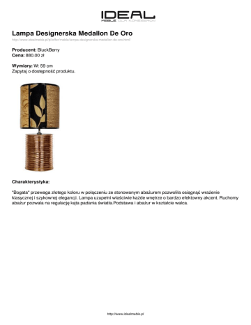 Lampa Designerska Medallon De Oro http://www.idealmeble.pl/pl/offer/meble/lampa-designerska-medallon-de-oro.html/ Producent: BluckBerry Cena: 880.00 zł Wymiary: W: 59 cm Zapytaj o dostępność produktu. Charakterystyka: "Bogata" przewaga złotego koloru w połączeniu ze stonowanym abażurem pozwoliła osiągnąć wrażenie klasycznej i szykownej elegancji. Lampa uzupełni właściwie każde wnętrze o bardzo efektowny akcent. Ruchomy abażur pozwala na regulację kąta padania światła.Podstawa i abażur w kształcie walca. http://www.idealmeble.pl http://www.idealmeble.pl Zdjęcia produktu: http://www.idealmeble.pl Powered by TCPDF (www.tcpdf.org)