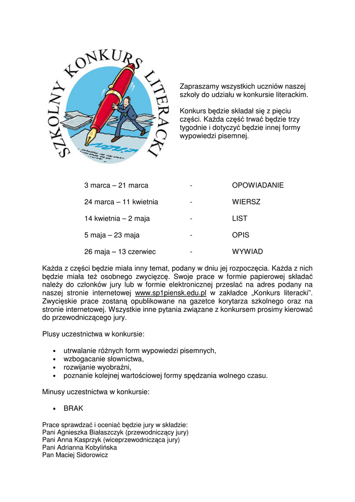 Zapraszamy wszystkich uczniów naszej szkoły do udziału w konkursie literackim. Konkurs będzie składał się z pięciu części. Każda część trwać będzie trzy tygodnie i dotyczyć będzie innej formy wypowiedzi pisemnej. 3 marca – 21 marca - OPOWIADANIE 24 marca – 11 kwietnia - WIERSZ 14 kwietnia – 2 maja - LIST 5 maja – 23 maja - OPIS 26 maja – 13 czerwiec - WYWIAD Każda z części będzie miała inny temat, podany w dniu jej rozpoczęcia. Każda z nich będzie miała też osobnego zwycięzcę. Swoje prace w formie papierowej składać należy do członków jury lub w formie elektronicznej przesłać na adres podany na naszej stronie internetowej www.sp1piensk.edu.pl w zakładce „Konkurs literacki”. Zwycięskie prace zostaną opublikowane na gazetce korytarza szkolnego oraz na stronie internetowej. Wszystkie inne pytania związane z konkursem prosimy kierować do przewodniczącego jury. Plusy uczestnictwa w konkursie: • • • • utrwalanie różnych form wypowiedzi pisemnych, wzbogacanie słownictwa, rozwijanie wyobraźni, poznanie kolejnej wartościowej formy spędzania wolnego czasu. Minusy uczestnictwa w konkursie: • BRAK Prace sprawdzać i oceniać będzie jury w składzie: Pani Agnieszka Białaszczyk (przewodniczący jury) Pani Anna Kasprzyk (wiceprzewodnicząca jury) Pani Adrianna Kobylińska Pan Maciej Sidorowicz
