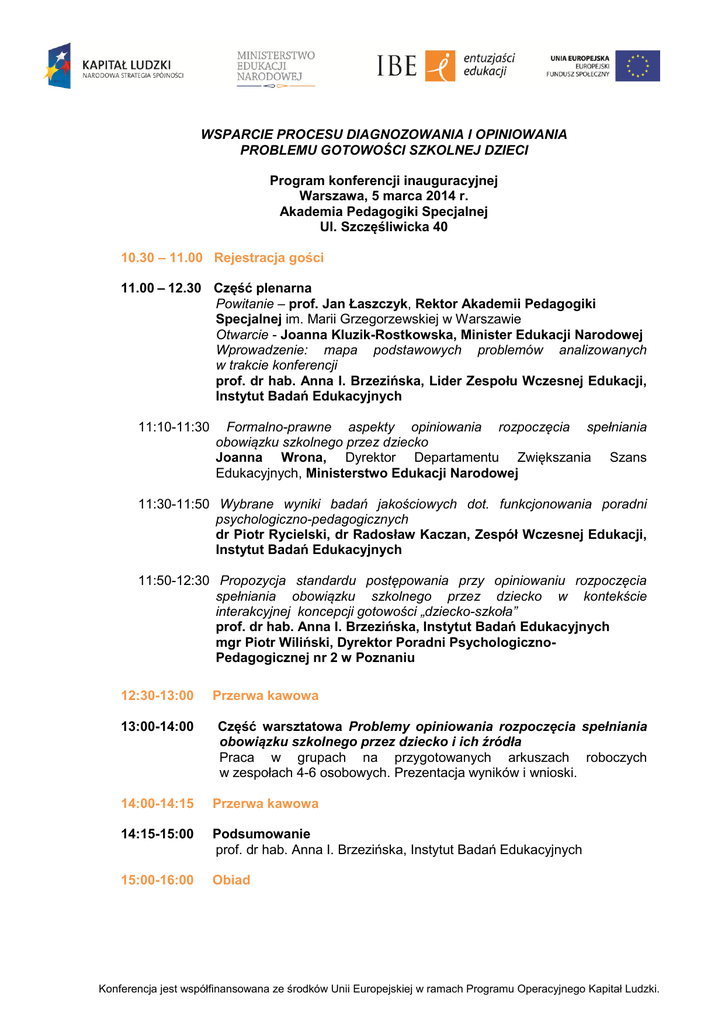 WSPARCIE PROCESU DIAGNOZOWANIA I OPINIOWANIA PROBLEMU GOTOWOŚCI SZKOLNEJ DZIECI Program konferencji inauguracyjnej Warszawa, 5 marca 2014 r. Akademia Pedagogiki Specjalnej Ul. Szczęśliwicka 40 10.30 – 11.00 Rejestracja gości 11.00 – 12.30 Część plenarna Powitanie – prof. Jan Łaszczyk, Rektor Akademii Pedagogiki Specjalnej im. Marii Grzegorzewskiej w Warszawie Otwarcie - Joanna Kluzik-Rostkowska, Minister Edukacji Narodowej Wprowadzenie: mapa podstawowych problemów analizowanych w trakcie konferencji prof. dr hab. Anna I. Brzezińska, Lider Zespołu Wczesnej Edukacji, Instytut Badań Edukacyjnych 11:10-11:30 Formalno-prawne aspekty opiniowania rozpoczęcia spełniania obowiązku szkolnego przez dziecko Joanna Wrona, Dyrektor Departamentu Zwiększania Szans Edukacyjnych, Ministerstwo Edukacji Narodowej 11:30-11:50 Wybrane wyniki badań jakościowych dot. funkcjonowania poradni psychologiczno-pedagogicznych dr Piotr Rycielski, dr Radosław Kaczan, Zespół Wczesnej Edukacji, Instytut Badań Edukacyjnych 11:50-12:30 Propozycja standardu postępowania przy opiniowaniu rozpoczęcia spełniania obowiązku szkolnego przez dziecko w kontekście interakcyjnej koncepcji gotowości „dziecko-szkoła” prof. dr hab. Anna I. Brzezińska, Instytut Badań Edukacyjnych mgr Piotr Wiliński, Dyrektor Poradni PsychologicznoPedagogicznej nr 2 w Poznaniu 12:30-13:00 13:00-14:00 Przerwa kawowa Część warsztatowa Problemy opiniowania rozpoczęcia spełniania obowiązku szkolnego przez dziecko i ich źródła Praca w grupach na przygotowanych arkuszach roboczych w zespołach 4-6 osobowych. Prezentacja wyników i wnioski. 14:00-14:15 Przerwa kawowa 14:15-15:00 Podsumowanie prof. dr hab. Anna I. Brzezińska, Instytut Badań Edukacyjnych 15:00-16:00 Obiad Konferencja jest współfinansowana ze środków Unii Europejskiej w ramach Programu Operacyjnego Kapitał Ludzki.