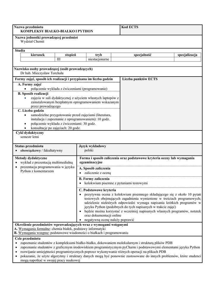 Nazwa przedmiotu KOMPLEKSY BIAŁKO-BIAŁKO I PYTHON Kod ECTS Nazwa jednostki prowadzącej przedmiot Wydział Chemii Studia kierunek stopień III tryb niestacjonarne specjalność specjalizacja Nazwisko osoby prowadzącej (osób prowadzących) Dr hab. Mieczysław Torchała Formy zajęć, sposób ich realizacji i przypisana im liczba godzin Liczba punktów ECTS A. Formy zajęć połączenie wykładu z ćwiczeniami (programowanie) B. Sposób realizacji zajęcia w sali dydaktycznej z użyciem własnych laptopów z zainstalowanym bezpłatnym oprogramowaniem wskazanym przez prowadzącego C. Liczba godzin samodzielne przygotowanie przed zajęciami (literatura, instalacja i zapoznanie z oprogramowaniem): 10 godz. połączenie wykładu z ćwiczeniami: 30 godz. konsultacje po zajęciach: 20 godz. Cykl dydaktyczny semestr letni Status przedmiotu obowiązkowy / fakultatywny Język wykładowy polski Metody dydaktyczne wykład z prezentacją multimedialną prezentacja programowania w języku Python z komentarzem Forma i sposób zaliczenia oraz podstawowe kryteria oceny lub wymagania egzaminacyjne A. Sposób zaliczenia zaliczenie z oceną B. Formy zaliczenia kolokwium pisemne z pytaniami testowymi C. Podstawowe kryteria pozytywna ocena z kolokwium pisemnego składającego się z około 10 pytań testowych obejmujących zagadnienia wymienione w treściach programowych; udzielenie niektórych odpowiedzi wymaga napisania krótkich programów w języku Python (podobnych do tych napisanych w trakcie zajęć) będzie można korzystać z wcześniej napisanych własnych programów, notatek oraz dokumentacji online negatywną ocenę należy poprawić Określenie przedmiotów wprowadzających wraz z wymogami wstępnymi A. Wymagania formalne: chemia białek, podstawy informatyki B. Wymagania wstępne: podstawowe wiadomości o białkach i programowaniu Cele przedmiotu zapoznanie studentów z kompleksami białko-białko, dokowaniem molekularnym i strukturą plików PDB zapoznanie studentów z graficznym środowiskiem programistycznym pyCharm i podstawowymi elementami języka Python rozwijanie umiejętności programistycznych poprzez wykonywanie różnych operacji na plikach PDB pokazanie, że użyte algorytmy i struktury danych mogą być ponownie zastosowane do innych problemów, które studenci mogą napotkać w swojej pracy naukowej Treści programowe Struktura, dynamika i znaczenie biologiczne kompleksów białko-białko. Dokowanie molekularne. Format PDB. Korzystanie z graficznego środowiska programistycznego pyCharm. Podstawowe elementy języka Python (m.in. pętle, listy, krotki, słowniki, instrukcje warunkowe, czytanie i zapisywanie plików, parametry wiersza poleceń, wypisywanie na standardowe wyjście, konwersja typów) w zastosowaniu do przetwarzania plików PDB i obliczania różnorodnych wielkości takich jak odległość między atomami, geometryczne centrum cząsteczki, RMSD pomiędzy dwoma strukturami. Używanie zewnętrznych bibliotek. Tworzenie wykresów. Styl i czytelność pisanego oprogramowania. Wykaz literatury A. Literatura wymagana do ostatecznego zaliczenia zajęć (zdania egzaminu): A.1. wykorzystywana podczas zajęć M. Torchala et al., ‘SwarmDock: a server for flexible protein-protein docking’, Bioinformatics 29, 807 (2013). DOI: 10.1093/bioinformatics/btt038. M. Torchala et al., ‘A Markov-chain model description of binding funnels to enhance the ranking of docked solutions’, Proteins 81, 2143 (2013). DOI: 10.1002/prot.24369. A.2. studiowana samodzielnie przez studenta przed zajęciami: format PDB, szczególnie pozycje elementów w rekordzie ATOM (http://www.wwpdb.org/documentation/fileformat-content/format33/sect9.html#ATOM) Python: o http://www.cogsci.rpi.edu/~destem/igd/python_cheat_sheet.pdf o https://perso.limsi.fr/pointal/_media/python:cours:mementopython3-english.pdf B. Literatura uzupełniająca Dokumentacja Python https://www.python.org/doc/ Oprogramowanie do zainstalowania przed zajęciami: 1. Python z różnymi pakietami: Anaconda 4.2.0 lub nowszy, dla Python 3.5 (64bit lub 32bit) (https://www.continuum.io/downloads#windows) 2. PyCharm Community Edition 2016.3.1 lub nowszy (https://www.jetbrains.com/pycharm/download/#section=windows) 3. VMD 1.9.3 lub nowszy (http://www.ks.uiuc.edu/Development/Download/download.cgi?PackageName=VMD) 4. Notepad ++ 7.2.2 lub nowszy (https://notepad-plus-plus.org/) Wiedza: Efekty uczenia się: 1. ma ogólną wiedzę w zakresie struktury kompleksów białkoSD_W01: wykazuje zaawansowaną i aktualną białko i dokowania molekularnego interdyscyplinarną wiedzę z zakresu dziedzin nauki i 2. ma podstawową wiedzę dotyczącą formatu plików PDB i dyscyplin naukowych obejmujących prowadzone badania naukowe potencjalnych problemów z niedoskonałością danych SD_W02: wykazuje zaawansowaną wiedzę z 3. zna podstawowe elementy języka Python zakresu metodologii prowadzenia badań Umiejętności: naukowych, zasad planowania badań i ich realizacji 1. potrafi krytycznie analizować pliki PDB i przetwarzać z wykorzystaniem interdyscyplinarnych technik i zawarte w nich dane narzędzi badawczych 2. potrafi napisać krótkie programy w języku Python, które SD_U02: biegle wykorzystuje literaturę naukową i wykonują określone zadania informacje zgromadzone w bazach danych, w tym o 3. potrafi wyszukiwać błędy we własnych i obcych charakterze interdyscyplinarnym, związane z programach działalnością naukową i dydaktyczną 4. potrafi zastosować znane rozwiązania do nowych SD_K01: rozumie potrzebę planowania swojego problemów, także poza pierwotnym obszarem rozwoju, systematycznego aktualizowania 5. potrafi odnaleźć i krytycznie ocenić przydatność rozwiązań interdyscyplinarnej wiedzy w celu poszerzania i problemów, które są dostępne online (np. Stack Overflow, pogłębiania własnych kompetencji dokumentacja Pythona) SD_K03: wykazuje krytyczne zrozumienie wkładu Kompetencje społeczne (postawy): wyników własnej działal