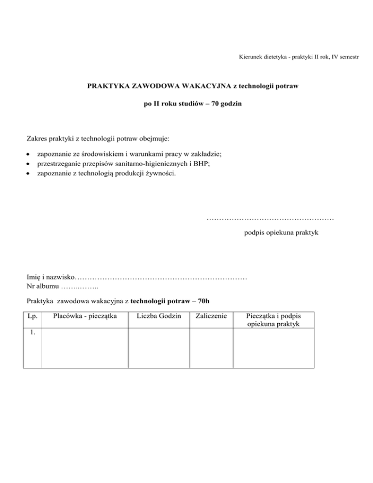 Kierunek dietetyka - praktyki II rok, IV semestr PRAKTYKA ZAWODOWA WAKACYJNA z technologii potraw po II roku studiów – 70 godzin Zakres praktyki z technologii potraw obejmuje: zapoznanie ze środowiskiem i warunkami pracy w zakładzie; przestrzeganie przepisów sanitarno-higienicznych i BHP; zapoznanie z technologią produkcji żywności. …………………………………………… podpis opiekuna praktyk Imię i nazwisko…………………………………………………………… Nr albumu ……..…….. Praktyka zawodowa wakacyjna z technologii potraw – 70h Lp. 1. Placówka - pieczątka Liczba Godzin Zaliczenie Pieczątka i podpis opiekuna praktyk