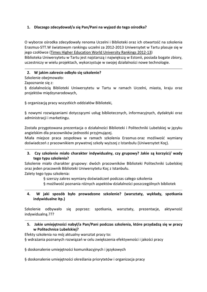 1. Dlaczego zdecydował/a się Pan/Pani na wyjazd do tego ośrodka? O wyborze ośrodka zdecydowały renoma Uczelni i Biblioteki oraz ich otwartość na szkolenia Erasmus-STT.W światowym rankingu uczelni za 2012-2013 Uniwersytet w Tartu plasuje się w jego czołówce (Times Higher Education World University Rankings 2012-13) Biblioteka Uniwersytetu w Tartu jest najstarszą i największą w Estonii, posiada bogate zbiory, uczestniczy w wielu projektach, wykorzystuje w swojej działalności nowe technologie. 2. W jakim zakresie odbyło się szkolenie? Szkolenie obejmowało: Zapoznanie się z: § działalnością Biblioteki Uniwersytetu w Tartu w ramach Uczelni, miasta, kraju oraz projektów międzynarodowych, § organizacją pracy wszystkich oddziałów Biblioteki, § nowymi rozwiązaniami dotyczącymi usług bibliotecznych, informacyjnych, dydaktyki oraz administracji i marketingu. Została przygotowana prezentacja o działalności Biblioteki i Politechniki Lubelskiej w języku angielskim dla pracowników jednostki przyjmującej. Miała miejsce praca zespołowa w ramach szkolenia Erasmus oraz możliwość wymiany doświadczeń z pracownikiem prywatnej szkoły wyższej z Istanbułu (Uniwersytet Koç). 3. Czy szkolenie miało charakter indywidualny, czy grupowy? Jakie są korzyści/ wady tego typu szkolenia? Szkolenie miało charakter grupowy: dwóch pracowników Biblioteki Politechniki Lubelskiej oraz jeden pracownik Biblioteki Uniwersytetu Koç z Istanbułu. Zalety tego typu szkolenia: § szerszy zakres wymiany doświadczeń podczas całego szkolenia § możliwość poznania różnych aspektów działalności poszczególnych bibliotek 4. W jaki sposób było prowadzone szkolenie? (warsztaty, wykłady, spotkania indywidualne itp.) Szkolenie odbywało indywidualną.??? się poprzez: spotkania, warsztaty, prezentacje, aktywność 5. Jakie umiejętności nabył/a Pan/Pani podczas szkolenia, które przydadzą się w pracy w Politechnice Lubelskiej? Efekty szkolenia na mój aktualny warsztat pracy to: § wdrażania poznanych rozwiązań w celu zwiększenia efektywności i jakości pracy § doskonalenie umiejętności komunikacyjnych i językowych § doskonalenie umiejętności określania priorytetów i organizacja pracy lepsza umiejętność wyznaczania celów i ich wdrażania 6. Jakie działania promujące internacjonalizację są prowadzone przez ośrodek, w którym odbywało się szkolenie? Działanie podejmowane przez ośrodek w celu internacjonalizacji to: § szeroka informacja o działalności Uczelni i Biblioteki w różnych językach: strona internetowa, portale społecznościowe; broszury, foldery dystrybuowane w budynkach uczeni; filmy telewizji uniwersyteckiej oraz inne. § promocja wymiany studentów, pracowników naukowych, programu Erasmus, współpracy między uczelniami i wydziałami (66 partnerskich uczelni z 24 krajów) § współpraca z różnymi instytucjami i przedsiębiorstwami kraju i regionu geograficznego [Państwa Nadbałtyckie]. 7. Jak zbudowany jest ośrodek pod względem infrastruktury? Czy jest położony na kampusie, jeżeli jest to uczelnia? Czy jest dobrze skomunikowany z centrum miasta? Uniwersytet w Tartu to kilkanaście obiektów w Tartu, Narwie i Parnawie: 9 wydziałów, Biblioteka, akademiki, hala sportowa, muzeum Uczelni. Większość budynków znajduje się w centrum w okolicach zabytkowego, starego miasta. Tartu nie jest rozległym miastem i możliwe jest przemieszczanie się po nim pieszo lub rowerem (powszechnie używanym przez mieszkańców i studentów). Miasto posiada dobrze rozwiniętą komunikację miejską: elektroniczne wyświetlacze godzin odjazdów autobusów, mapy schematów linii na przystankach. Baza noclegowa jest bogata i różnorodna: hostele, hotele, akademiki. Bezpłatny dostęp do sieci internetowej w przestrzeni publicznej oraz hotelach, lokalach gastronomicznych i budynkach uczelni.