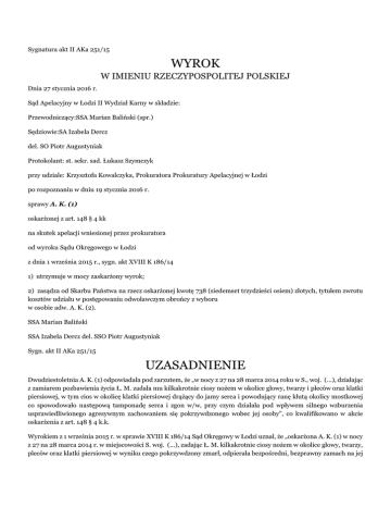 Sygnatura akt II AKa 251/15 WYROK W IMIENIU RZECZYPOSPOLITEJ POLSKIEJ Dnia 27 stycznia 2016 r. Sąd Apelacyjny w Łodzi II Wydział Karny w składzie: Przewodniczący:SSA Marian Baliński (spr.) Sędziowie:SA Izabela Dercz del. SO Piotr Augustyniak Protokolant: st. sekr. sad. Łukasz Szymczyk przy udziale: Krzysztofa Kowalczyka, Prokuratora Prokuratury Apelacyjnej w Łodzi po rozpoznaniu w dniu 19 stycznia 2016 r. sprawy A. K. (1) oskarżonej z art. 148 § 4 kk na skutek apelacji wniesionej przez prokuratora od wyroku Sądu Okręgowego w Łodzi z dnia 1 września 2015 r., sygn. akt XVIII K 186/14 1) utrzymuje w mocy zaskarżony wyrok; 2) zasądza od Skarbu Państwa na rzecz oskarżonej kwotę 738 (siedemset trzydzieści osiem) złotych, tytułem zwrotu kosztów udziału w postępowaniu odwoławczym obrońcy z wyboru w osobie adw. A. K. (2). SSA Marian Baliński SSA Izabela Dercz del. SSO Piotr Augustyniak Sygn. akt II AKa 251/15 UZASADNIENIE Dwudziestoletnia A. K. (1) odpowiadała pod zarzutem, że „w nocy z 27 na 28 marca 2014 roku w S., woj. (...), działając z zamiarem pozbawienia życia Ł. M. zadała mu kilkakrotnie ciosy nożem w okolice głowy, twarzy i pleców oraz klatki piersiowej, w tym cios w okolicę klatki piersiowej drążący do jamy serca i powodujący ranę kłutą okolicy mostkowej co spowodowało następową tamponadę serca i zgon w/w, przy czym działała pod wpływem silnego wzburzenia usprawiedliwionego agresywnym zachowaniem się pokrzywdzonego wobec jej osoby”, co kwalifikowano w akcie oskarżenia z art. 148 § 4 k.k. Wyrokiem z 1 września 2015 r. w sprawie XVIII K 186/14 Sąd Okręgowy w Łodzi uznał, że „oskarżona A. K. (1) w nocy z 27 na 28 marca 2014 r. w miejscowości S. woj. (...), zadając Ł. M. kilkakrotnie ciosy nożem w okolice głowy, twarzy, pleców oraz klatki piersiowej w wyniku czego pokrzywdzony zmarł, odpierała bezpośredni, bezprawny zamach na jej wolność i zdrowie działając w ramach obrony koniecznej” i na podstawie art. 25 § 1 k.k. uniewinnił ją od dokonania zarzucanego jej czynu. Apelację na niekorzyść wywiódł prokurator. Zarzucił wyrokowi „błąd w ustaleniach faktycznych polegający na przyjęciu, że oskarżona działała w warunkach obrony koniecznej, choć z ustaleń dowodowych postępowania wynika, iż oskarżona dopuściła się uprzywilejowanego typu zabójstwa z art. 148 § 4 k.k., co niewątpliwie miało wpływ na treść orzeczenia” i konkludował o uchylenie zaskarżonego orzeczenia i przekazanie sprawy do ponownego rozpoznania Sądowi Okręgowemu w Łodzi”. Sąd Apelacyjny zważył, co następuje. Apelacja nie podlegała uwzględnieniu. Już na samym wstępie trzeba podkreślić, iż wszystkie wątpliwości jakie w sprawie pojawiają się, zostały rozwikłane w pisemnym uzasadnieniu wyroku. Ten pisemny dokument sprawozdawczy z rozumowania poprzedzającego wydanie wyroku odnosi się do wszelkich uwarunkowań natury faktograficznej towarzyszących wydarzeniu, które poddaje w wątpliwości skarżący w apelacji. Z modelową wprost sensownością i z poszanowaniem reguł procesu karnego wykazał sąd meriti, iż dowody zaoferowane do oceny przez organ oskarżycielski pociągają za sobą konieczność zastosowania konstrukcji kontratypu. W tej sytuacji, jako werbalistyczne i gołosłowne uznał Sąd Apelacyjny te stwierdzenia odwołania, które bezowocnie usiłują dowieść jakoby rzekomo błędne ustalenia faktyczne były następstwem sprzecznej z logiką i doświadczeniem życiowym oceną dowodów. Istota zarzutu błędu w ustaleniach faktycznych nie może opierać się na odmiennej ocenie materiału dowodowego, inaczej mówiąc – nie może polegać tylko na forsowaniu własnego poglądu strony na odnośną kwestię. Stawiając tego rodzaju zarzut należy konkretnie wskazać, jakich uchybień w świetle zgodności (lub niezgodności) z treścią dowodu, zasad logiki (błędność rozumowania i wnioskowania) czy sprzeczności (bądź nie) z doświadczeniem życiowym lub wskazaniami wiedzy - dopuścił się - w dokonanej przez siebie ocenie dowodów, sąd pierwszej instancji. Tymczasem w uzasadnieniu apelacji skarżący spodziewanego dowodzenia jednak nie przeprowadza i nie krytykuje wprost metodyki ocen dowodów stanowiących podstawę ustaleń faktycznych, a właściwie tylko dowody te przytacza – i to nawet nie negując ich przydatności; przy czym zupełnie bezowocnie i wbrew unormowaniu art. 199 k.p.k. przytacza w swych wywodach relacje oskarżonej przekazywane w wywiadzie bieglej psycholog (karta 607 od góry) - zamiast odwoływać się do dowodów „legalnych”. W tzw. ustaleniach faktycznych, a tym bardziej w ocenie wiarygodności dowodów nie można powoływać się na treść oświadczeń złożonych przez oskarżoną tylko wobec opiniującej w sprawie biegłej. Nie stanowią one dowodu, a ich treść może mieć znaczenie jedynie w aspekcie oceny opinii biegłej. Zakaz dowodzenia treścią oświadczeń składanych przez oskarżoną wobec biegłej psycholog (art. 199 k.p.k.) ma charakter bezwzględny: jeśli takie depozycje nie mogą stanowić dowodu, to strony - nie tylko, że nie mogą domagać się, by przeprowadzono z nich dowód, ale też nie mają prawa posługiwać się nimi w argumentacji odwoławczej. Zresztą i dokumentacja takiego wynurzenia oskarżonej nie była stosowna, bo zostało ono utrwalone jedynie w formie jednostronnego oświadczenia biegłej w tzw. części „historycznej” opinii, a zapisek taki nie może zastępować dowodu w formie odpowiedniej procesowo (art. 174 k.p.k.). Autor apelacji sam tworzy antynomie, gdy wypowiada się (w zasadzie w jednym zdaniu): „Jak zauważył słusznie sąd orzekający, główny materiał dostarczający informacji o stanie faktycznym to wyjaśnienia oskarżonej. Ale właśnie te wyjaśnienia nie są spójne”: w pierwszej części wypowiedzi apelujący akceptuje dokonaną przez Sąd Okręgowy ocenę dowodów i poczynion
