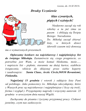 Leszno, dn. 16 XI 2015r. Drodzy Uczniowie klas czwartych, piątych i szóstych! Niedawno zaczął się rok szkolny a tu już zima za pasem i zbliżają się Święta Bożego Narodzenia. Św. Mikołaj zaczął zbierać listy, w których dzieci (dorośli czasem też) donoszą mu o wymarzonych prezentach. Ogłaszamy konkurs na najciekawszy i najpiękniejszy list do świętego Mikołaja. Zastanówcie się, czego pragniecie, co potrzebne jest Wam, a może komuś bliskiemu, może….. i napiszcie list - pięknie, starannie na dużej kartce, ozdóbcie świątecznie, włóżcie do sklejonej przez siebie koperty i zaadresujcie: Santa Claus, Arctic Circle,96930 Rovaniemi, Finlandia. Najpóźniej 15 grudnia ( wtorek ) oddajcie listy Pani od polskiego. Jako pomocnicy św. Mikołaja zdecydujemy, które z Waszych prac są najciekawsze i najpiękniejsze ( liczy się treść, forma i wygląd ). Przygotujemy nagrody i wręczymy autorom 22 grudnia w uroczystym dniu naszej Wigilii. Zachęcamy do pisania i życzymy przyjemnej pracy. Ciekawi jesteśmy, czym nas zaskoczycie. Pozdrawiamy Pomocnicy św. Mikołaja