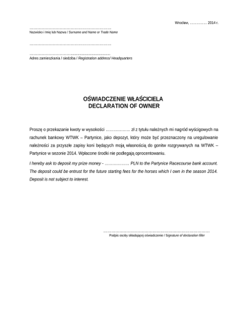 Wrocław, …………… 2014 r. …………………………………………………… Nazwisko i Imię lub Nazwa / Surname and Name or Trade Name …………………………………………………… …………………………................................... Adres zamieszkania / siedziba / Registration address/ Headquarters OŚWIADCZENIE WŁAŚCICIELA DECLARATION OF OWNER Proszę o przekazanie kwoty w wysokości ……………… zł z tytułu należnych mi nagród wyścigowych na rachunek bankowy WTWK – Partynice, jako depozyt, który może być przeznaczony na uregulowanie należności za przyszłe zapisy koni będących moją własnością do gonitw rozgrywanych na WTWK – Partynice w sezonie 2014. Wpłacone środki nie podlegają oprocentowaniu. I hereby ask to deposit my prize money - ……………… PLN to the Partynice Racecourse bank account. The deposit could be entrust for the future starting fees for the horses which I own in the season 2014. Deposit is not subject to interest. …………………………………………………………………… Podpis osoby składającej oświadczenie / Signature of declaration filler
